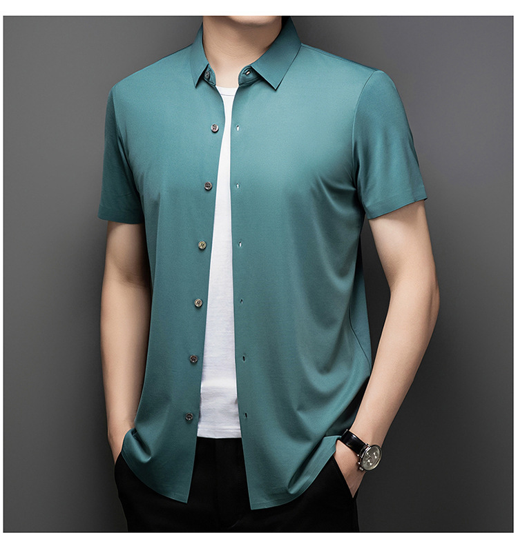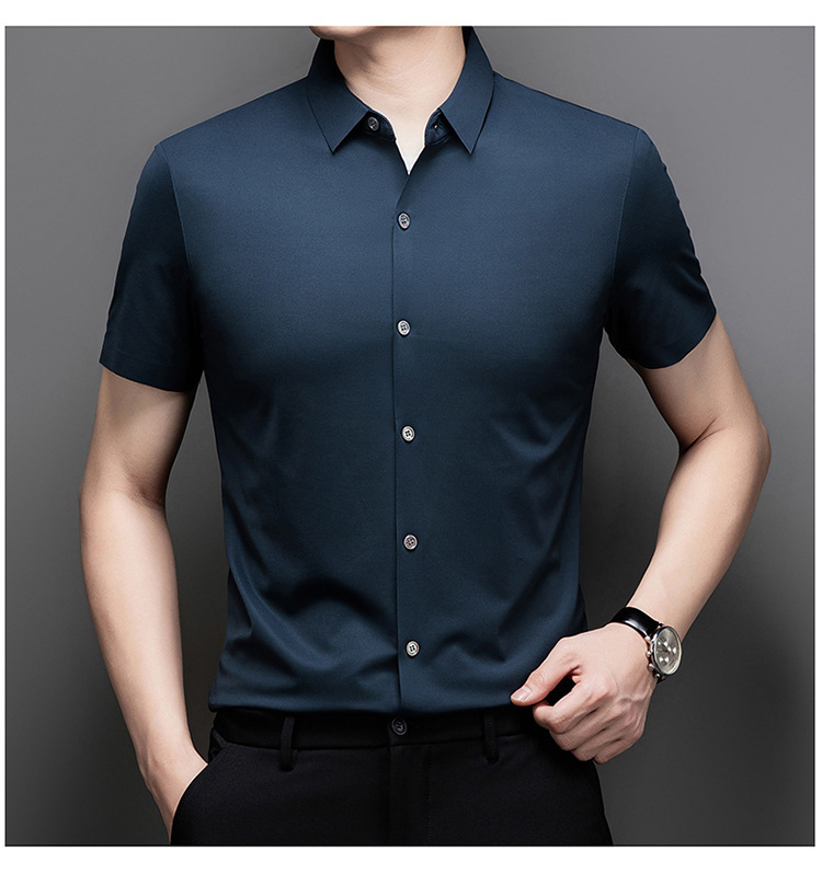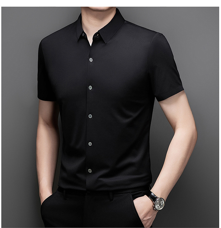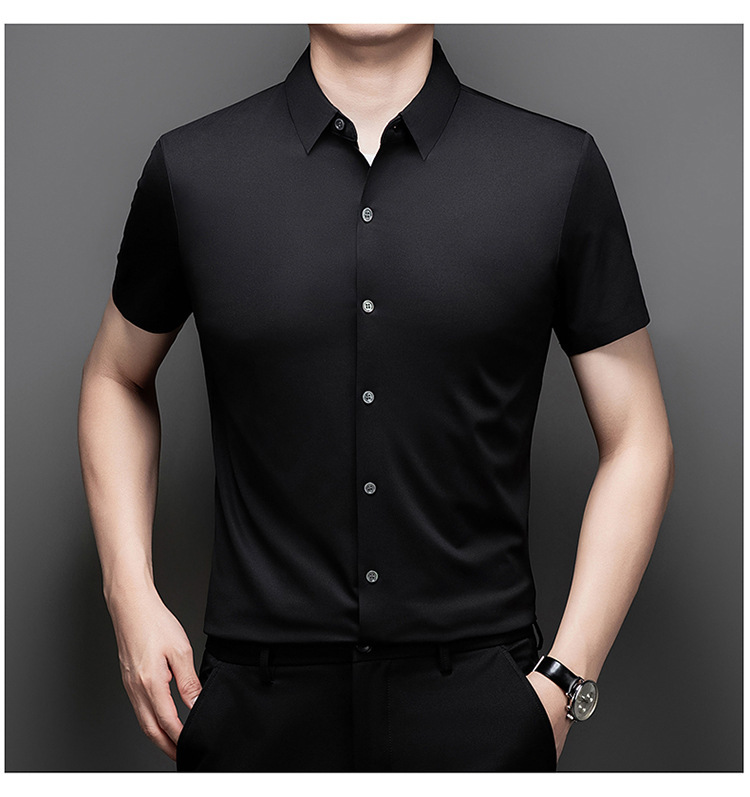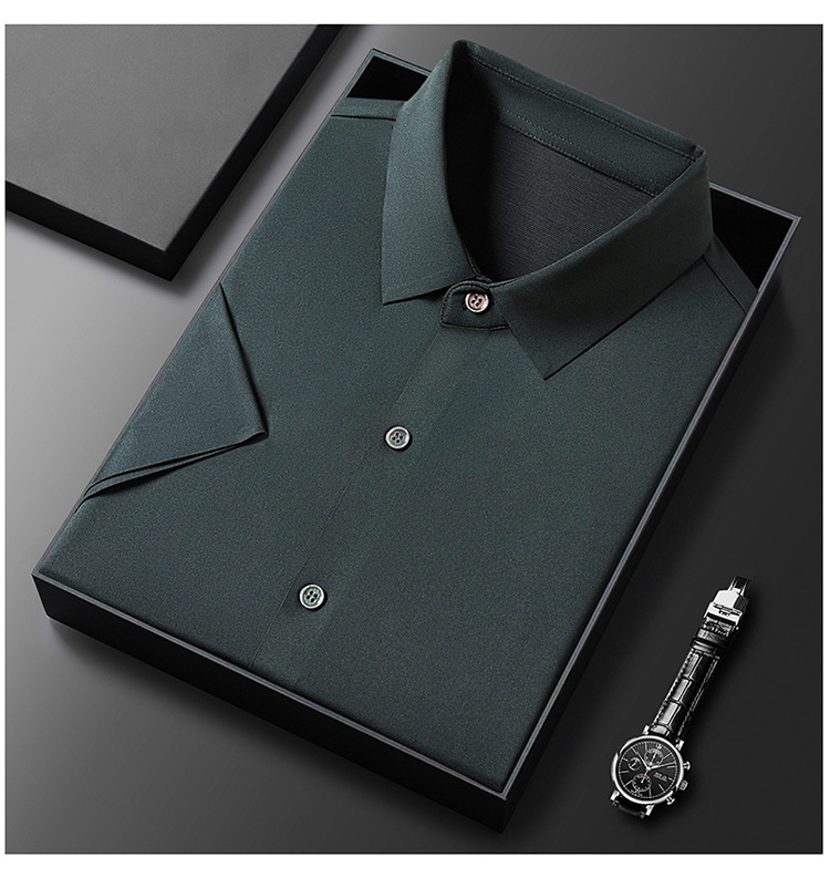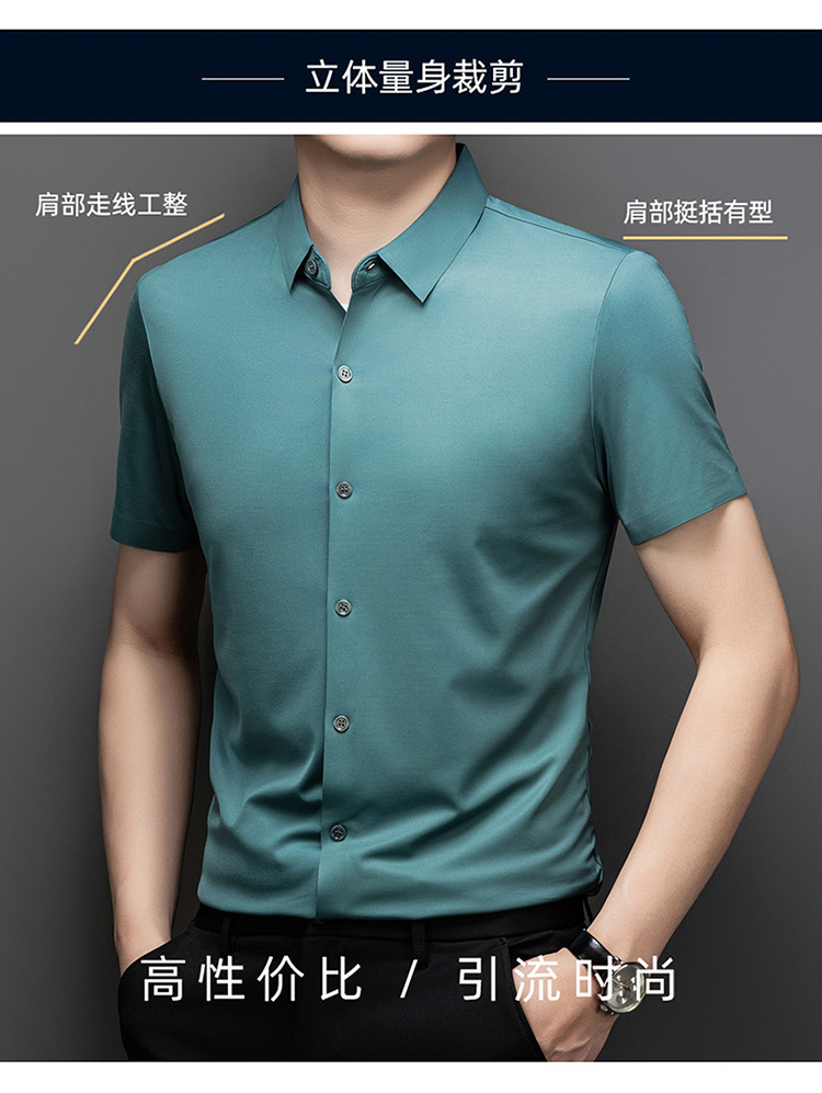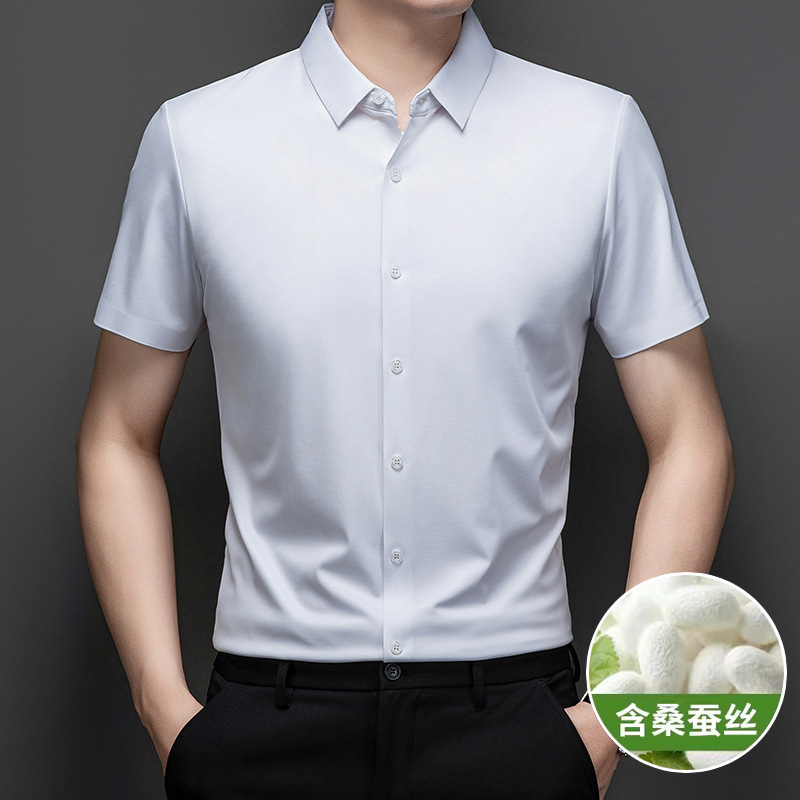 夏季新款男士无痕短袖衬衫中青年商务休闲舒适感含桑蚕丝纯色衬衣