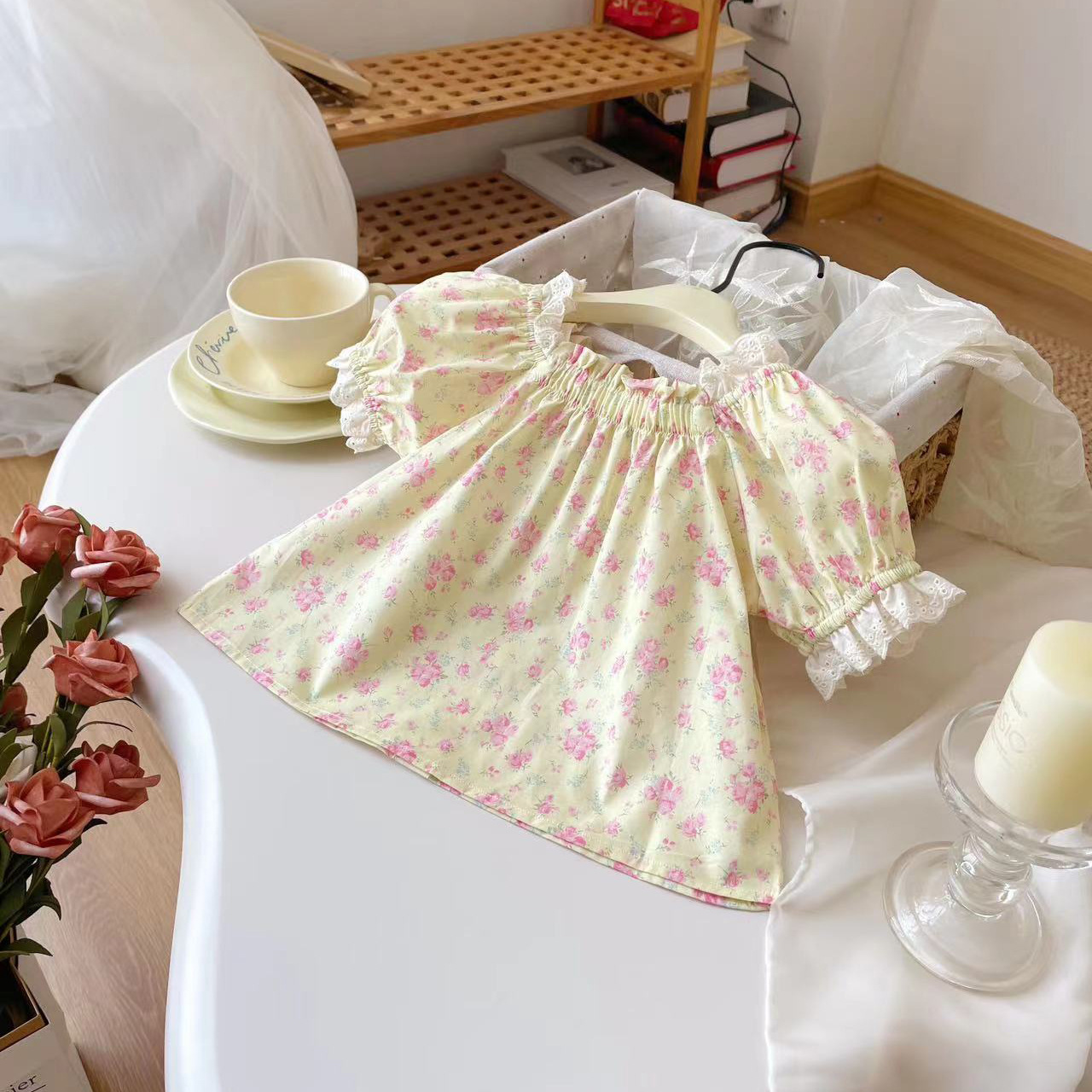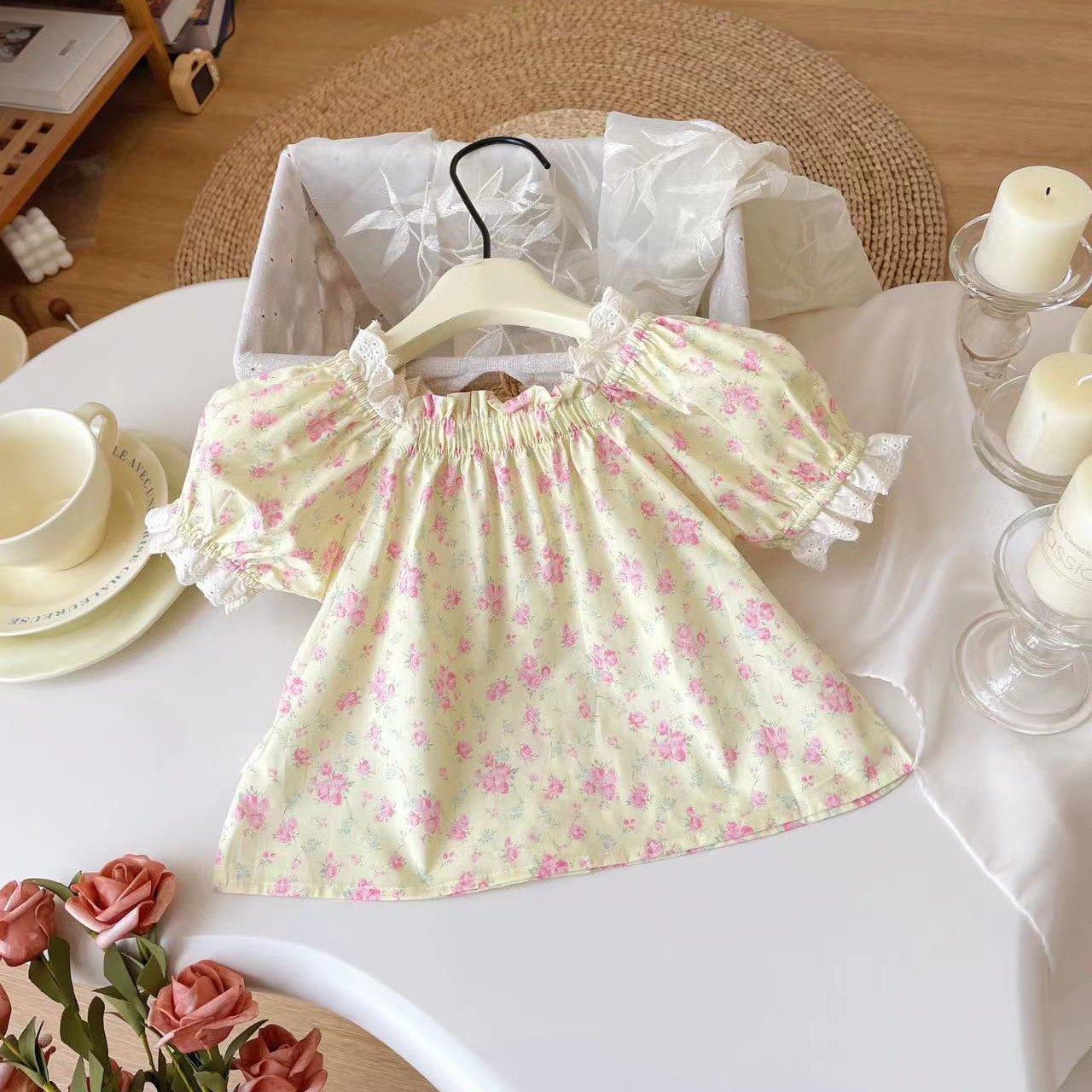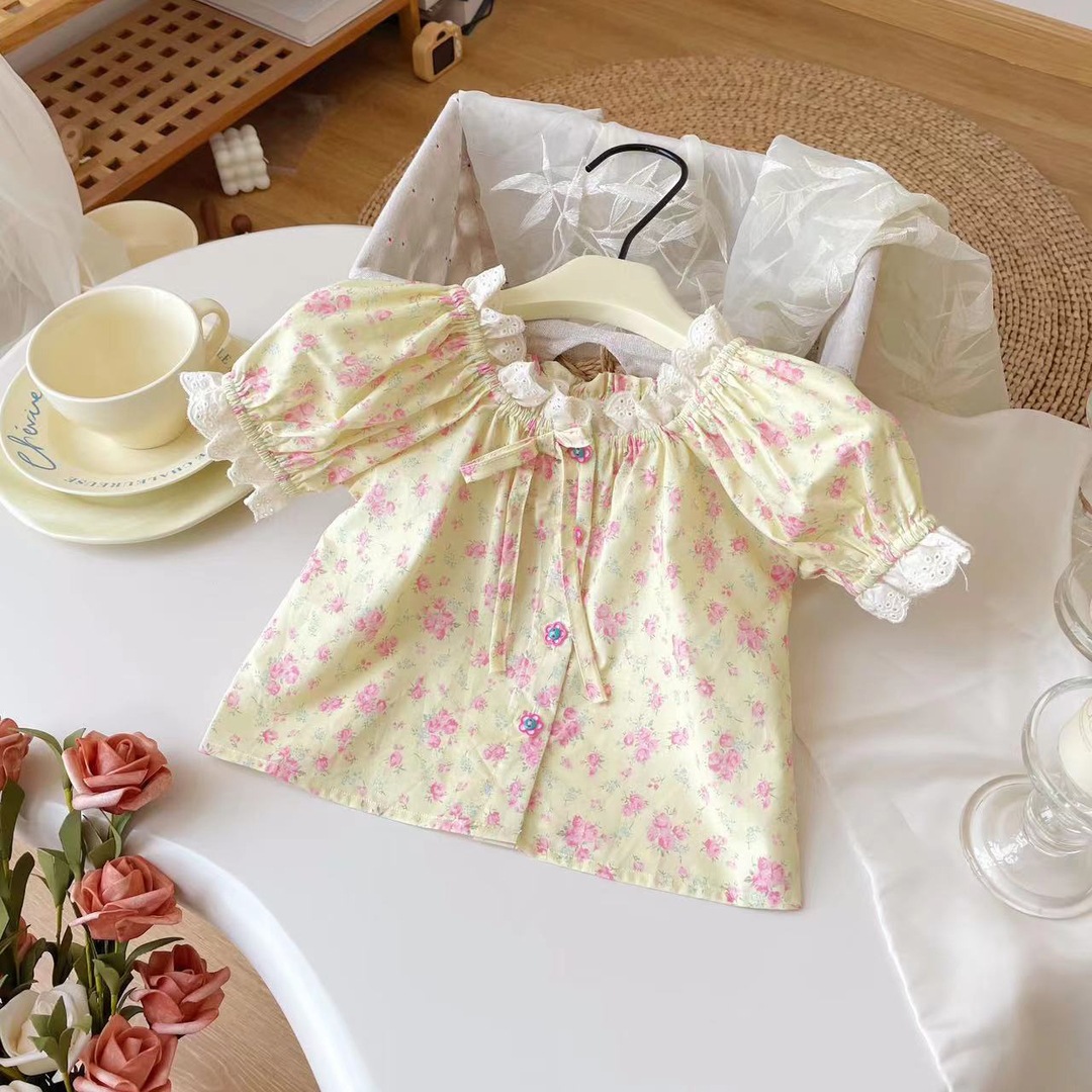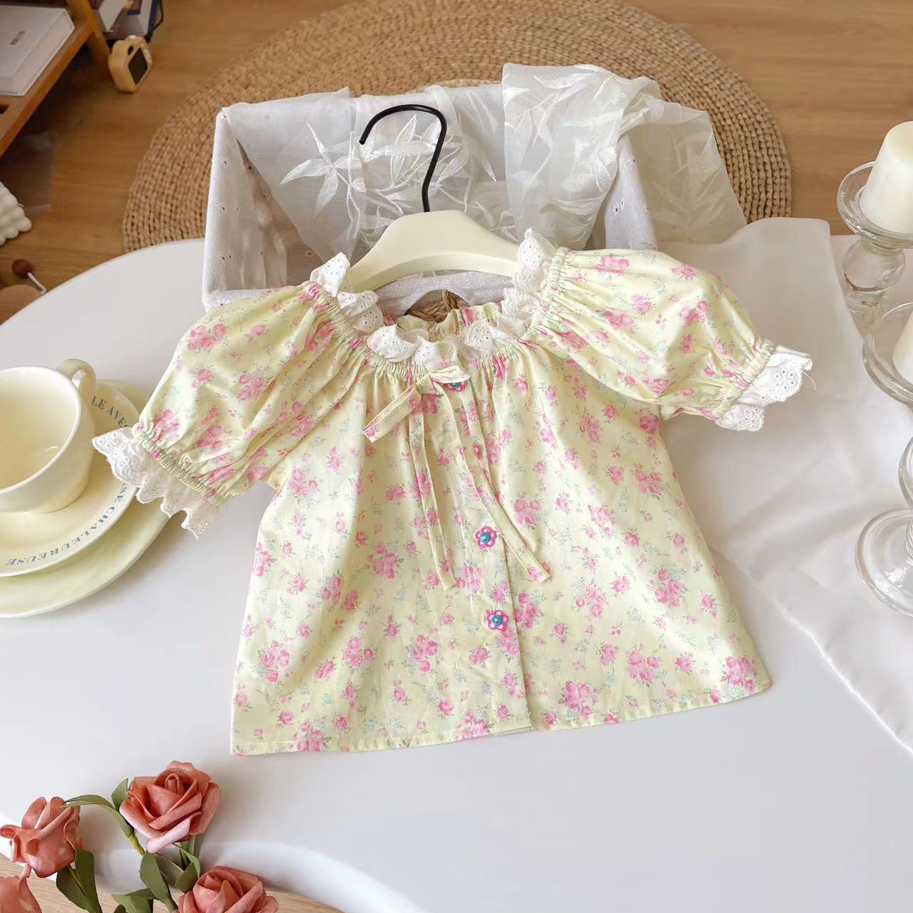 [재고 있음] 여아 셔츠 2024 여름 아동용 반팔 달콤한 꽃무늬 베이비돌 셔츠 레이스 칼라 셔츠스토어 가기