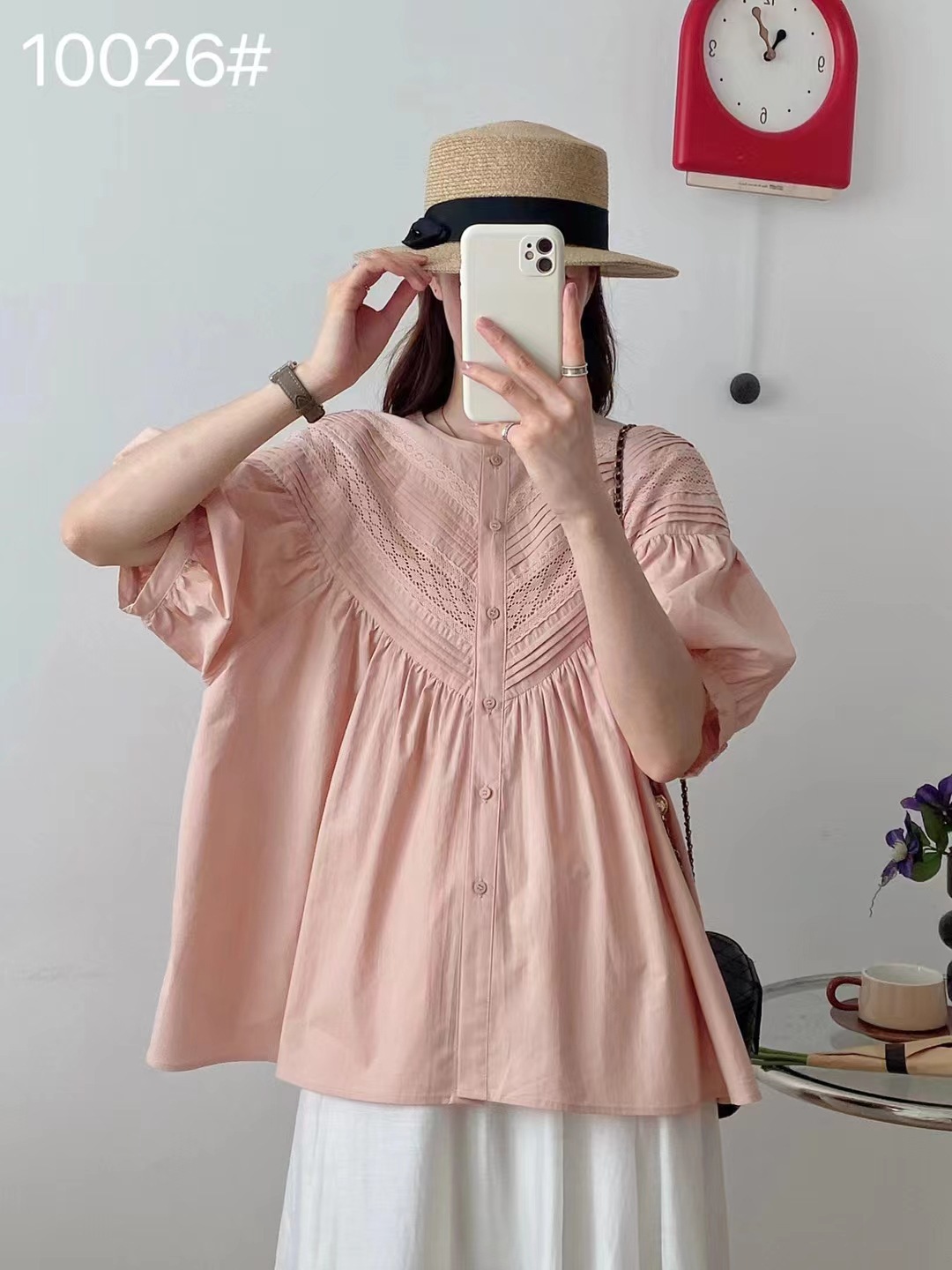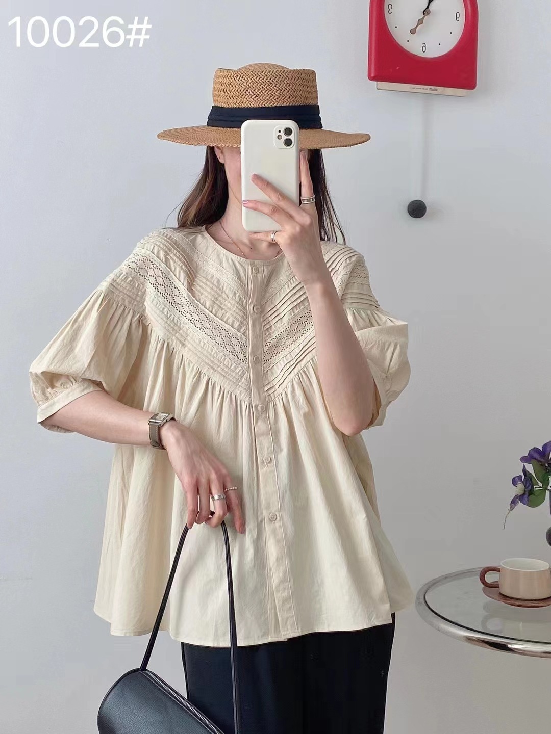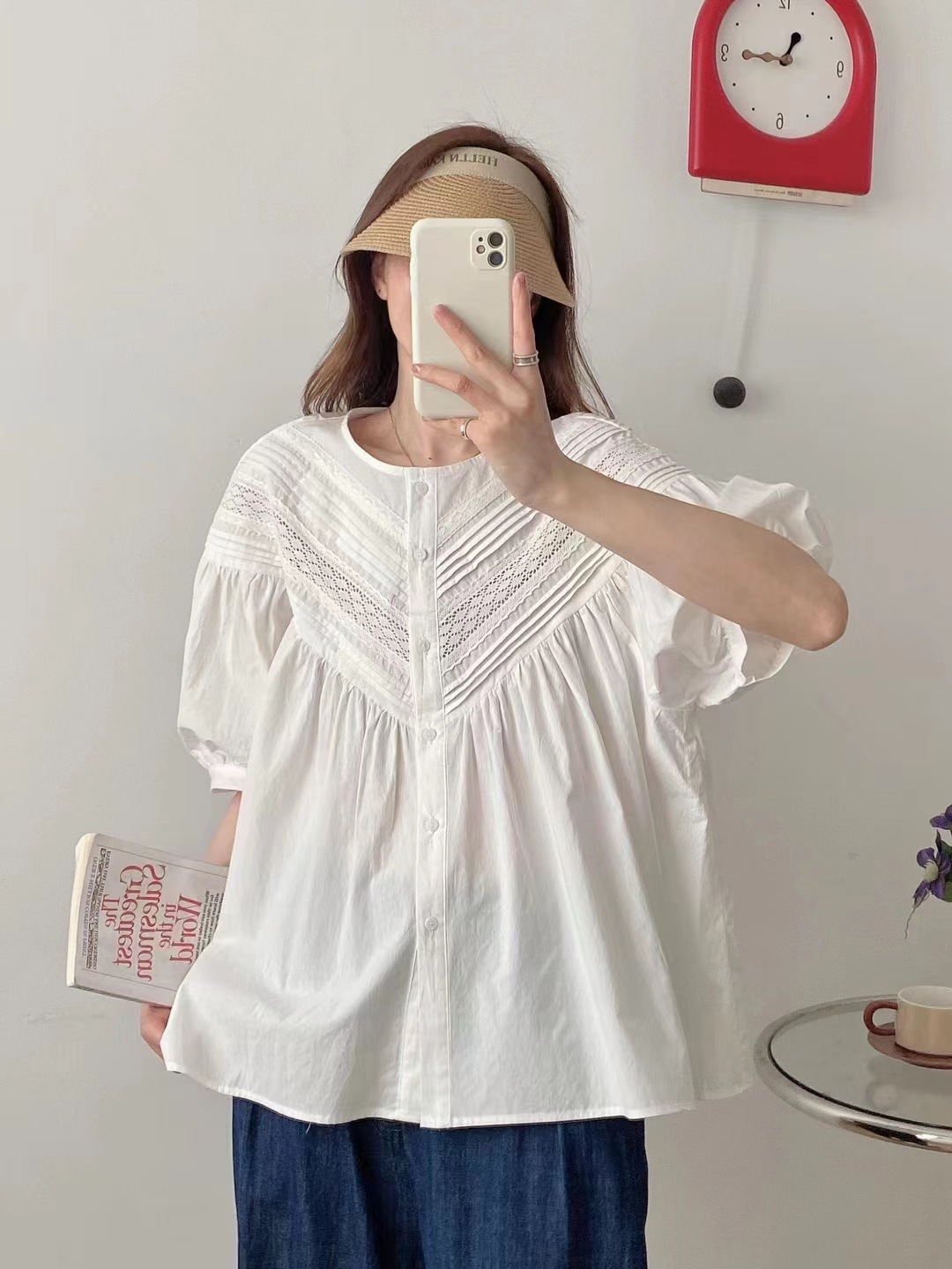 2024 여름 새로운 신선한 솔리드 컬러 레이스 라운드 넥 나이 감소 짧은 소매 셔츠 여성의 단색 탑스토어 가기