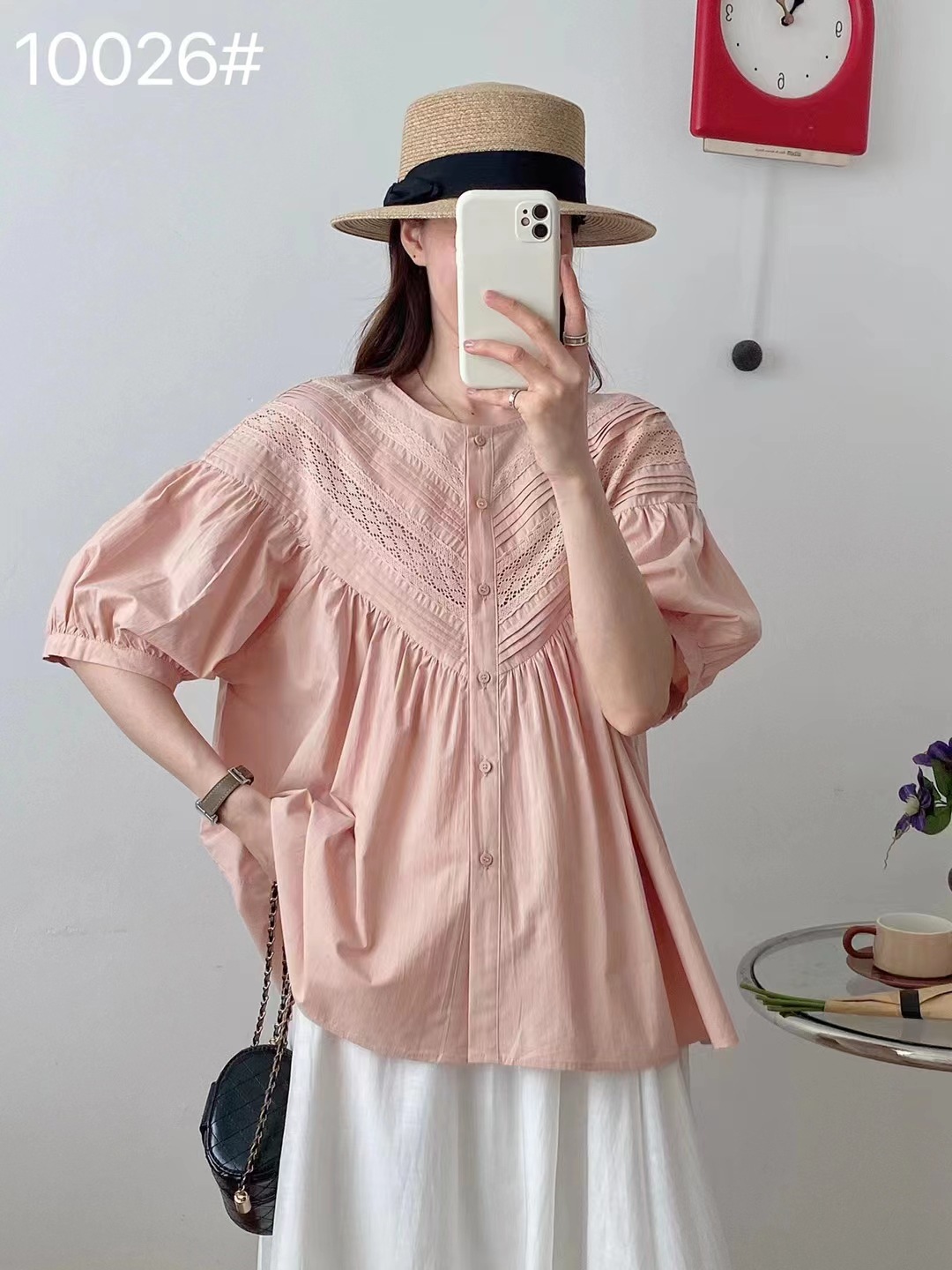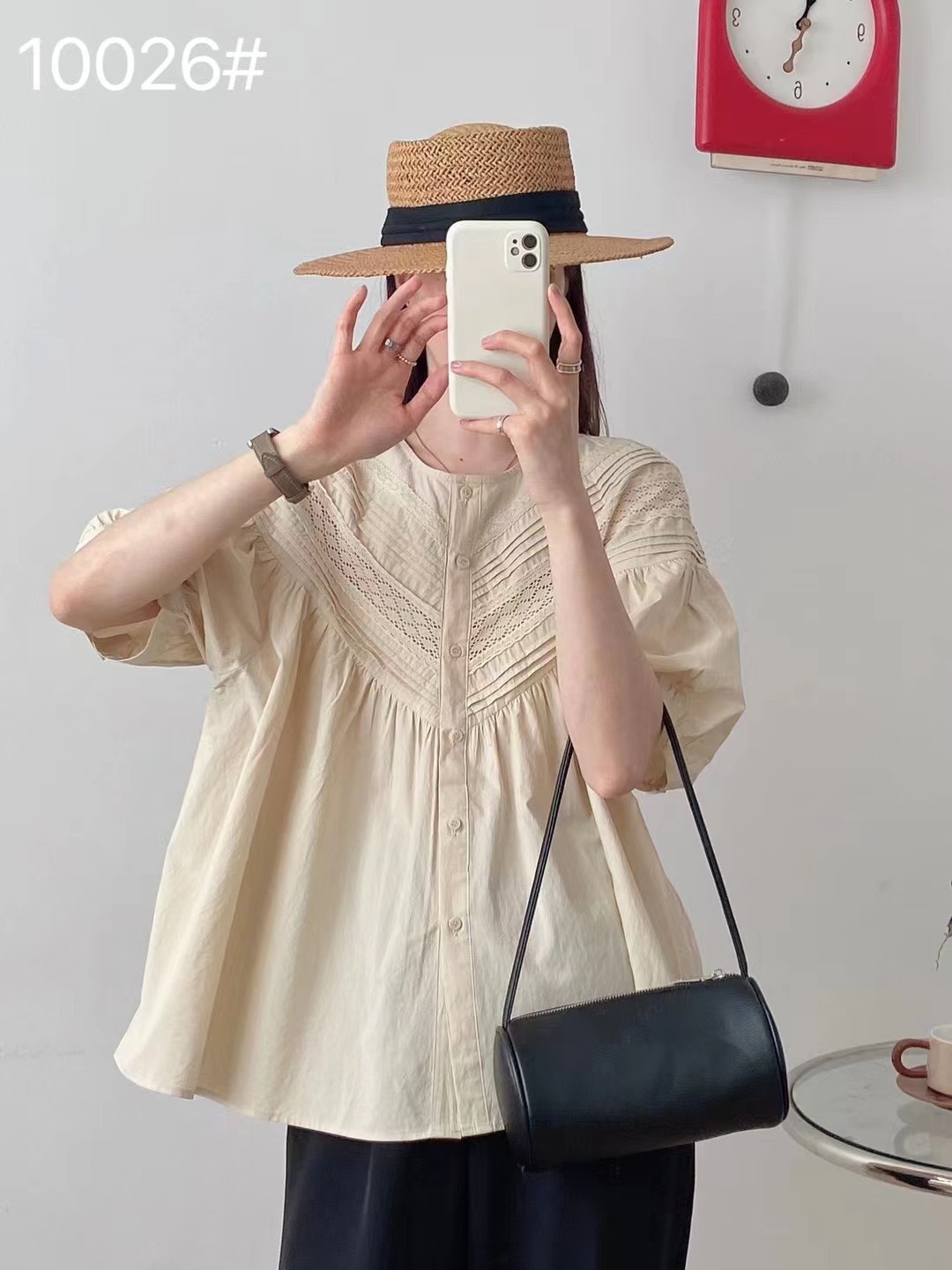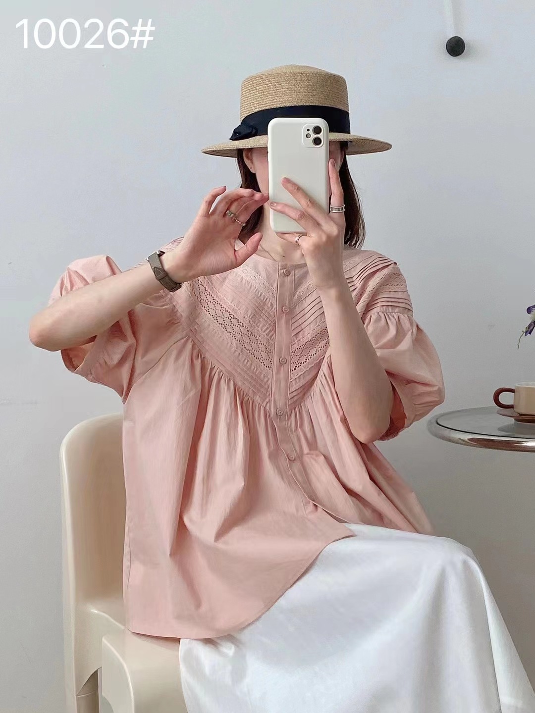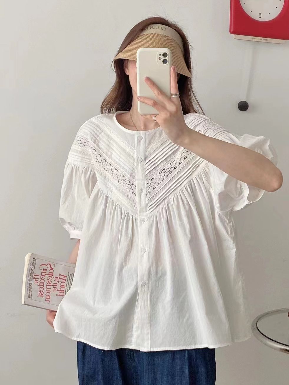2024 여름 새로운 신선한 솔리드 컬러 레이스 라운드 넥 나이 감소 짧은 소매 셔츠 여성의 단색 탑