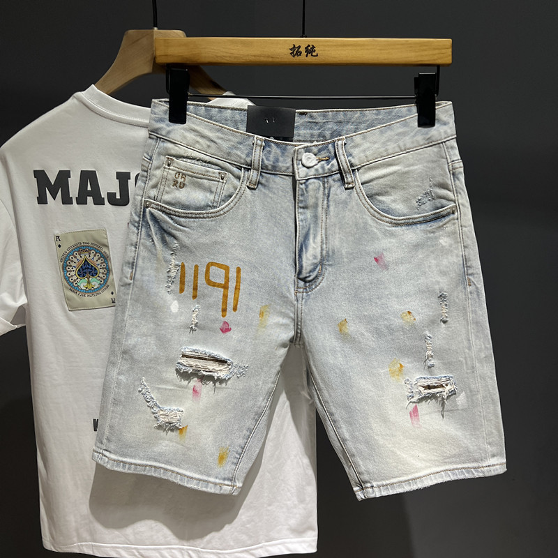 여름 라이트 컬러 아메리칸 스타일 트렌디 한 브랜드 5 점 데님 반바지 페인트 낙서 구멍 거지 슬림 핏 남성용 트렌디 한 5 점 중형 바지