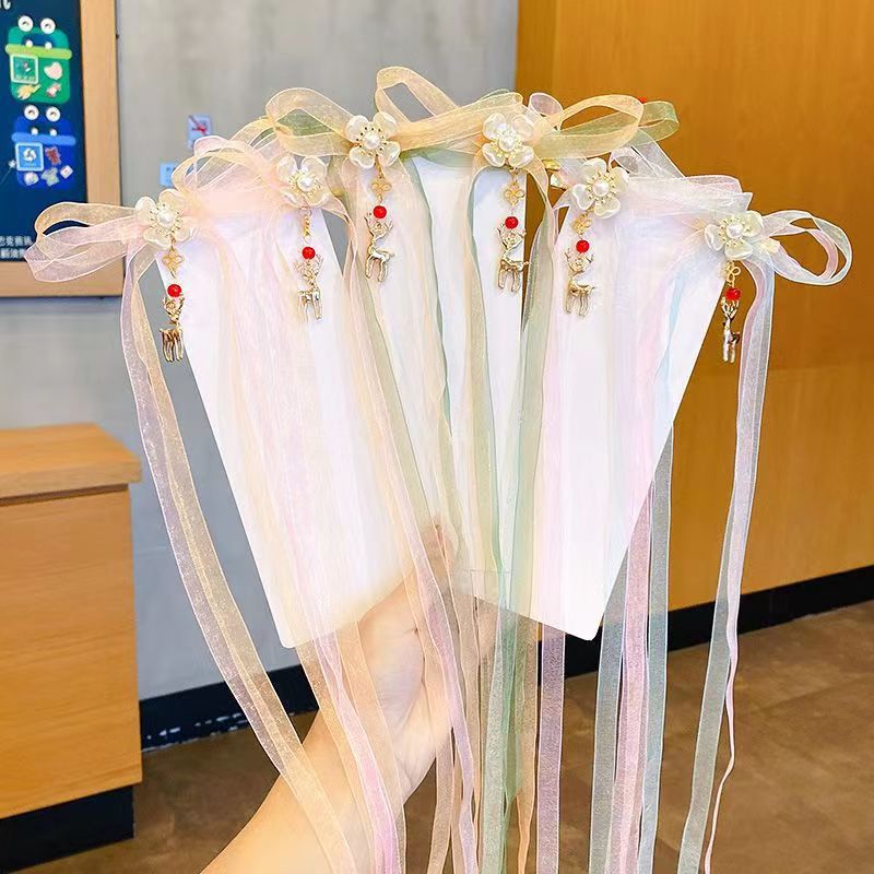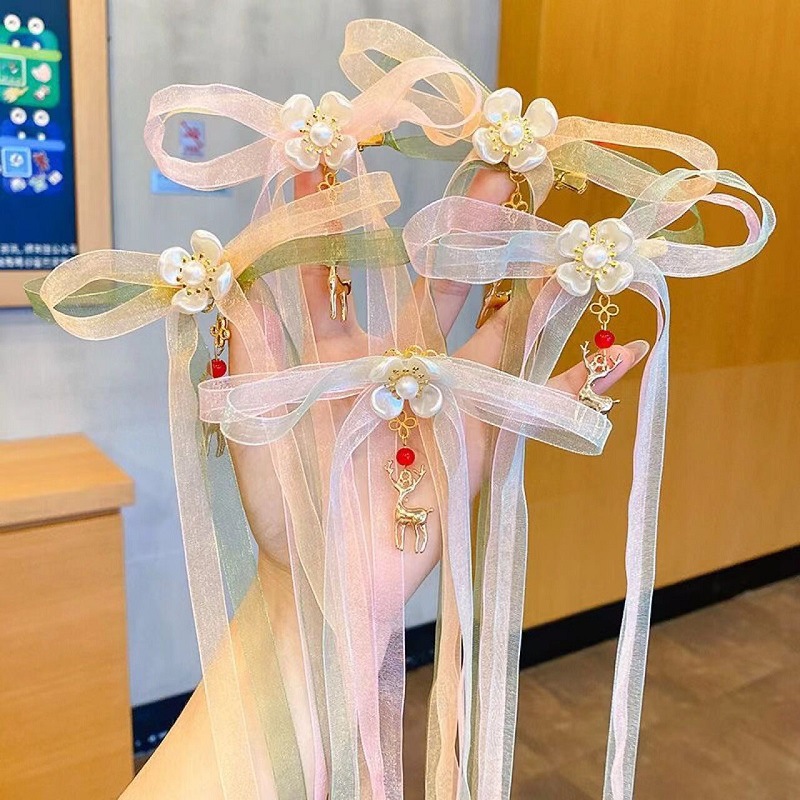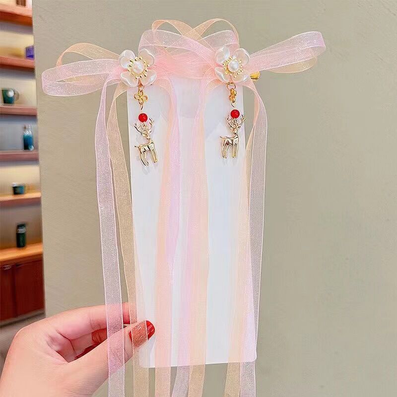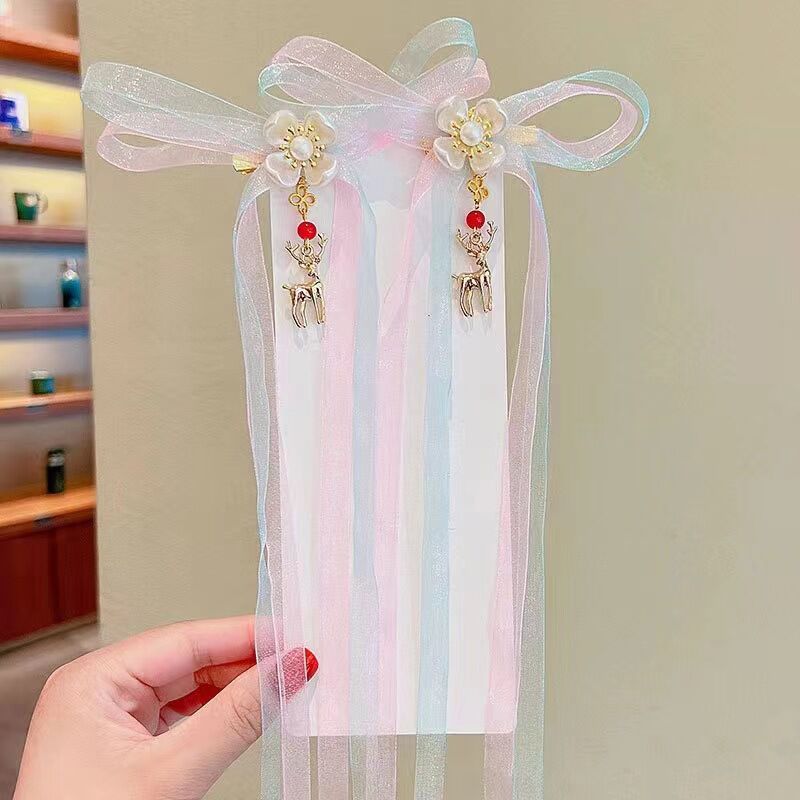 한푸 머리 고대 세트 요정 사슴 Qiyuan 어린이 긴 리본 머리핀 중국 스타일 걷는 술 머리핀 골동품 머리핀