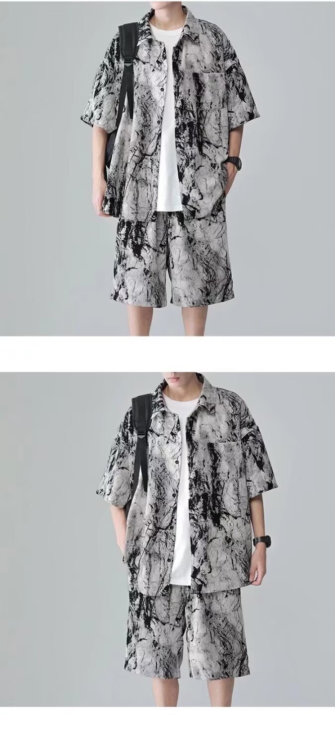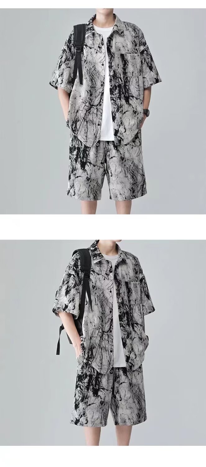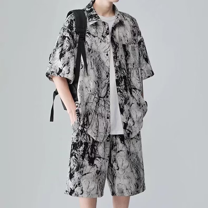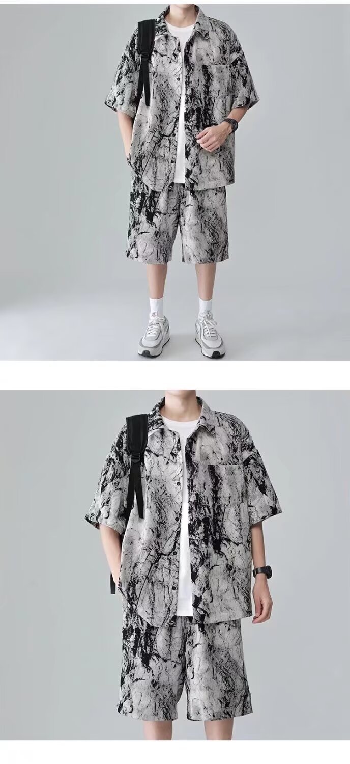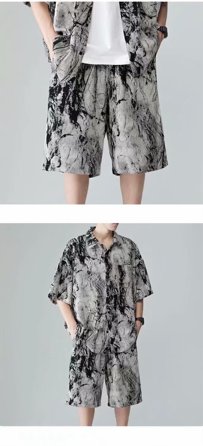 2024 여름 새로운 캐주얼 스포츠 세트 남자 반팔 셔츠 트렌디 브랜드 5 점 반바지 느슨한 홍콩 스타일 투피스 세트