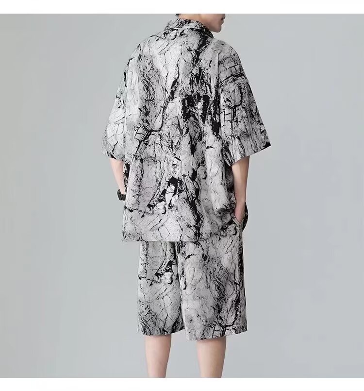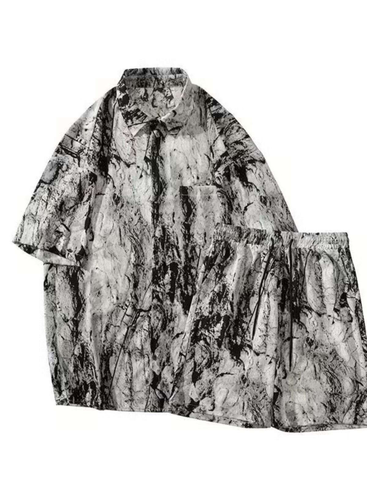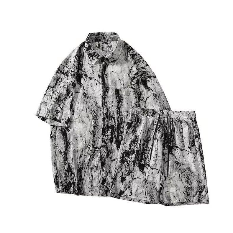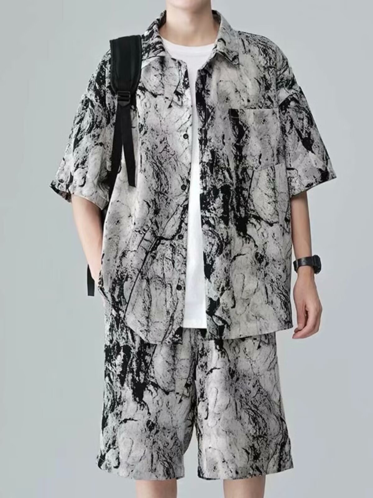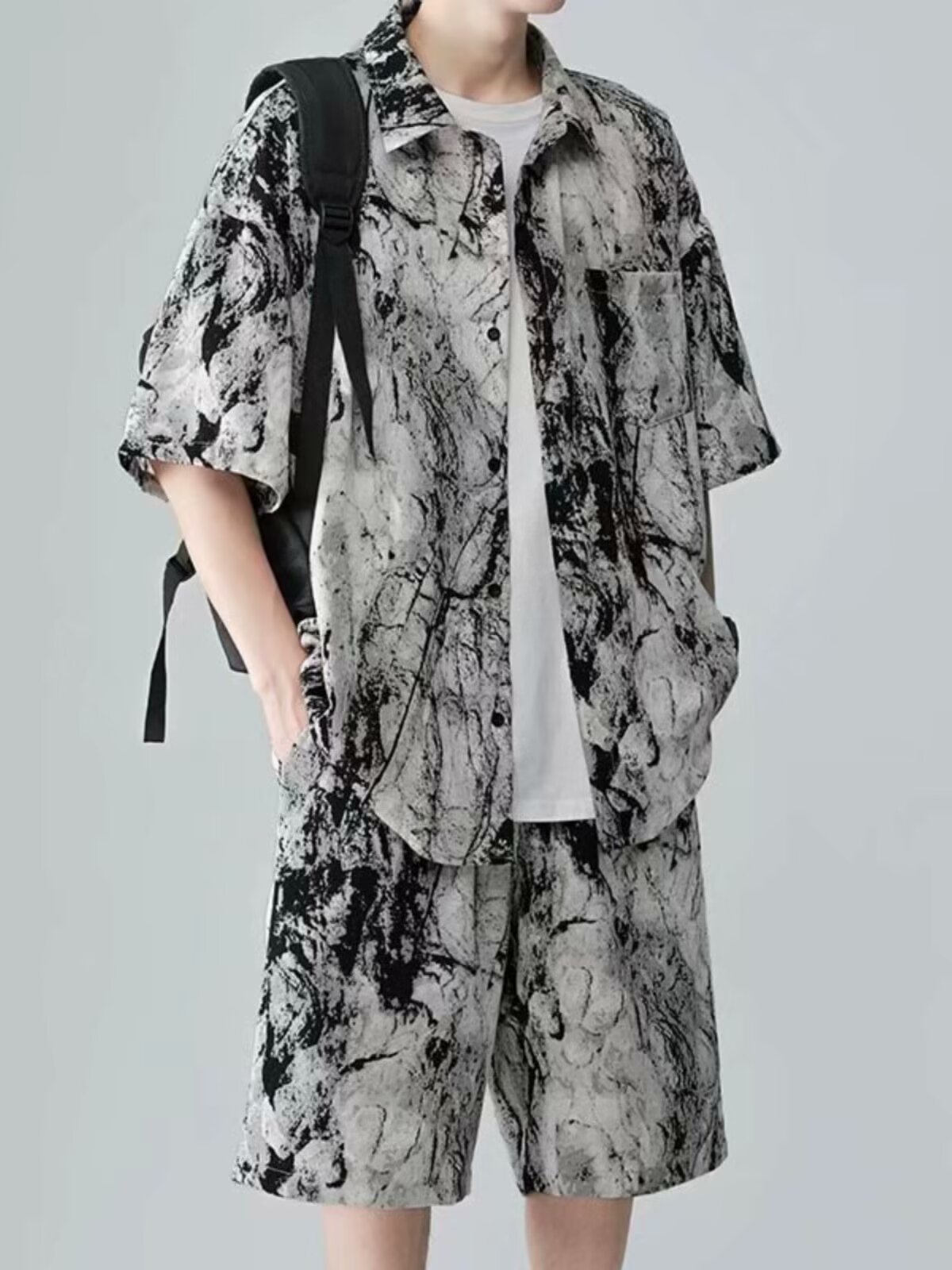 2024 여름 새로운 캐주얼 스포츠 세트 남자 반팔 셔츠 트렌디 브랜드 5 점 반바지 느슨한 홍콩 스타일 투피스 세트