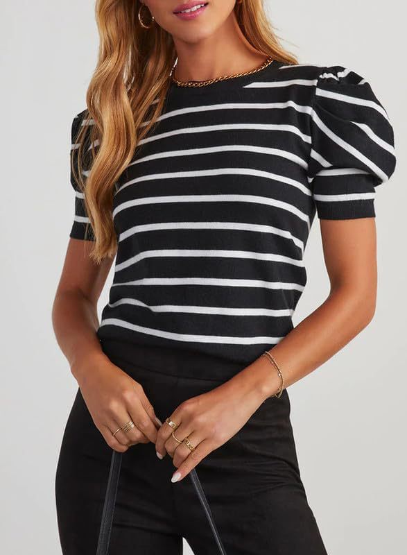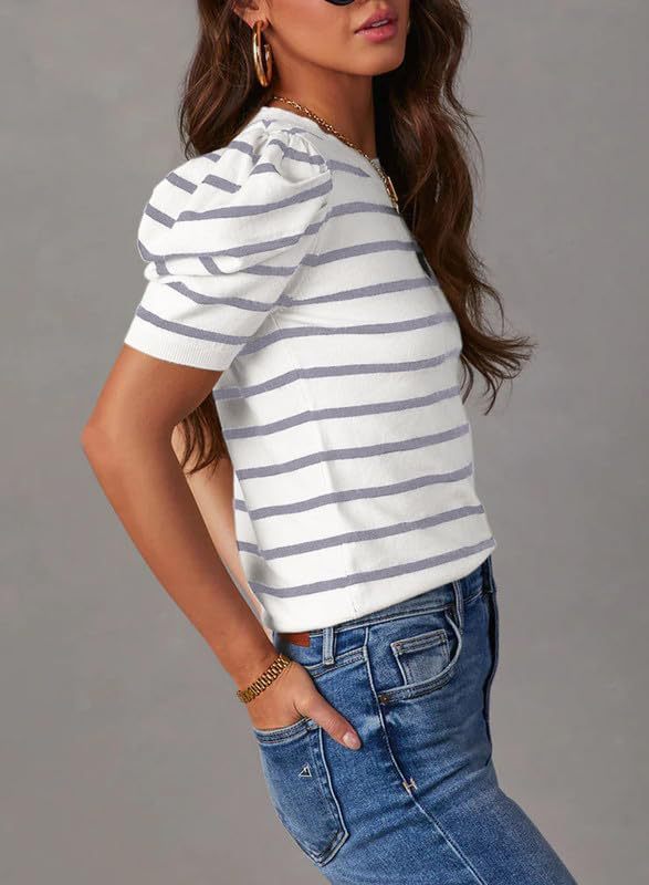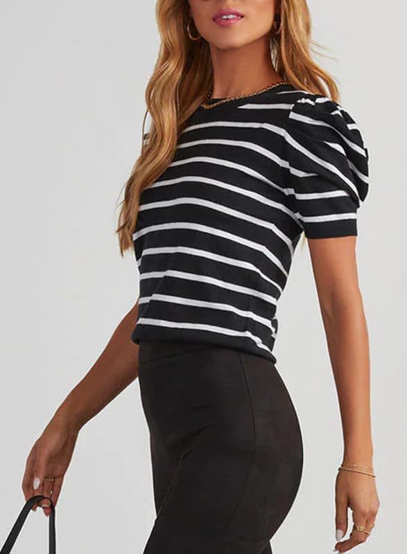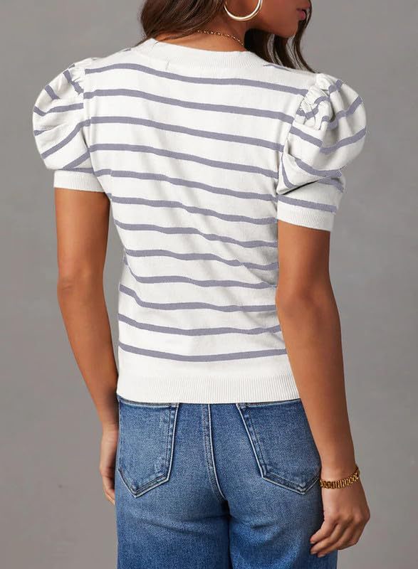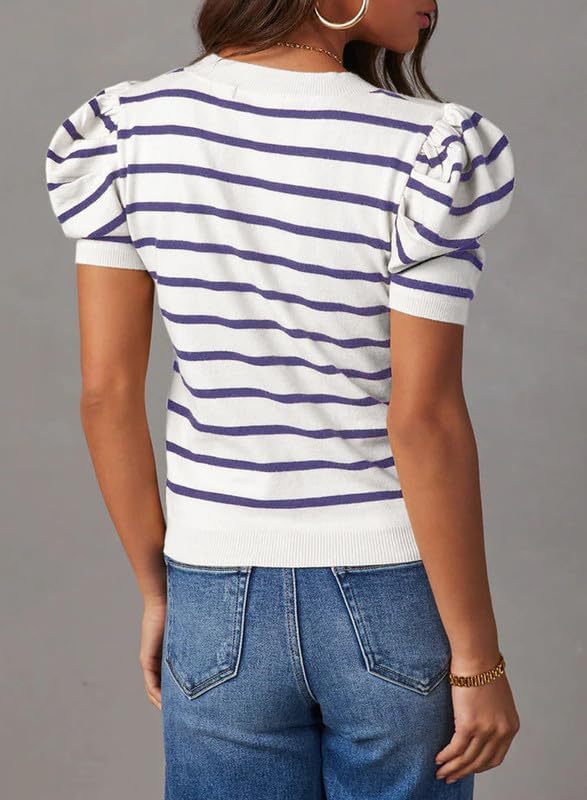 오리지널 스웨터 아마존 크로스보더 여성용 짧은 퍼프 소매 니트 탑 2024 스트라이프 티셔츠 여름 캐주얼스토어 가기