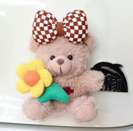 • 꽃을 들고 있는 갈색 체크무늬 리본 - 자동차 테일 펜던트