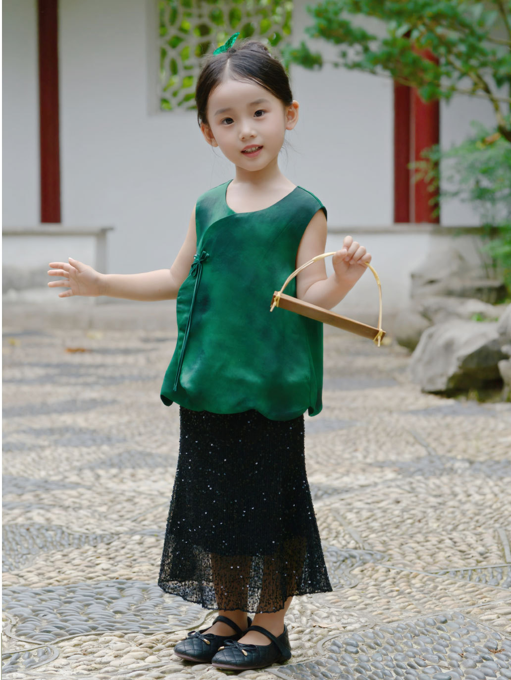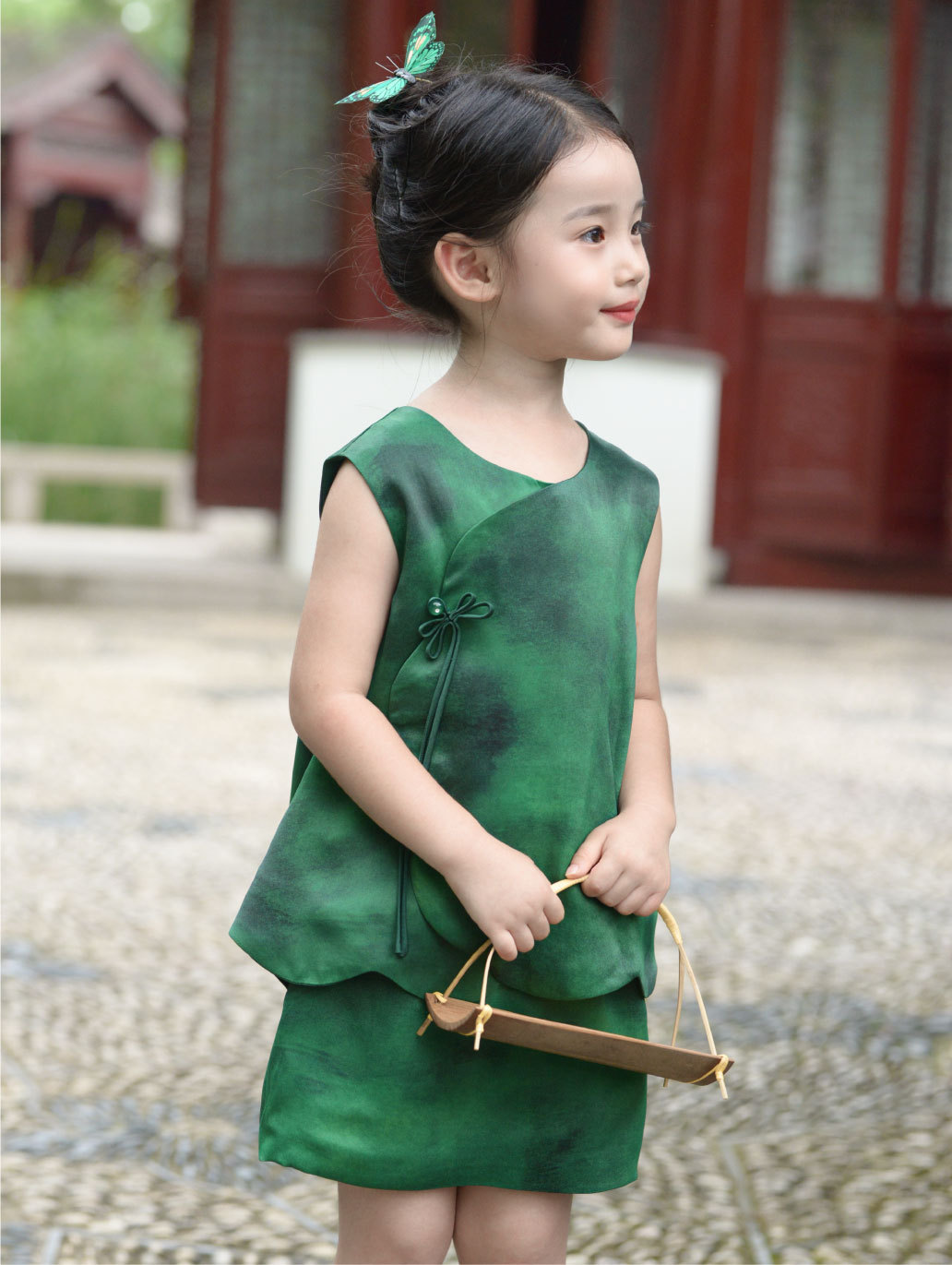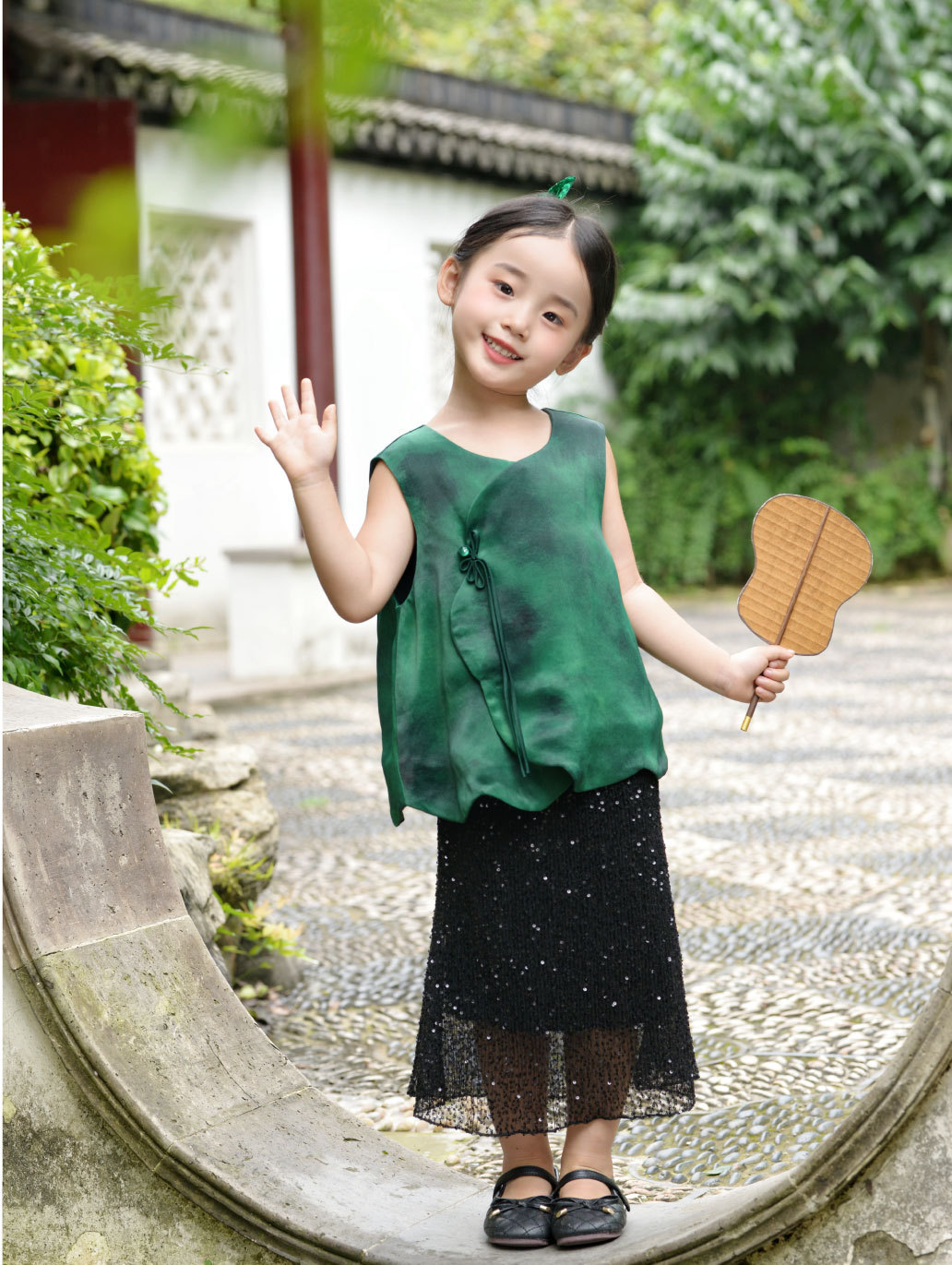 새로운 중국 스타일 다크 그린 세트 용 수직 칼라가있는 민소매 조끼 2024 여성 여름 복고풍 수정 당나라 원피스 조끼