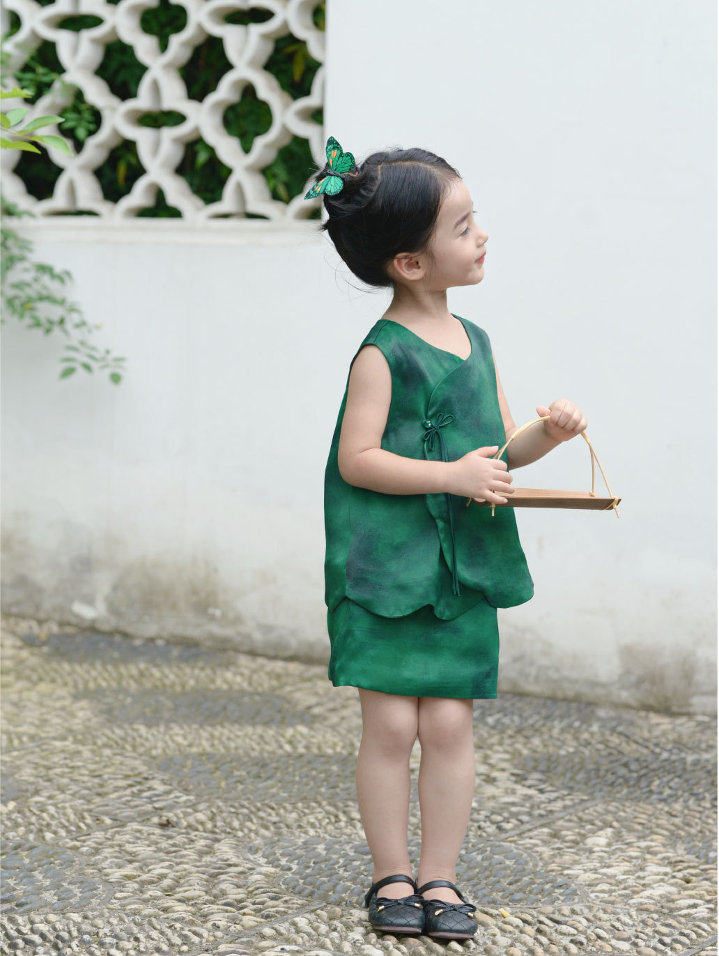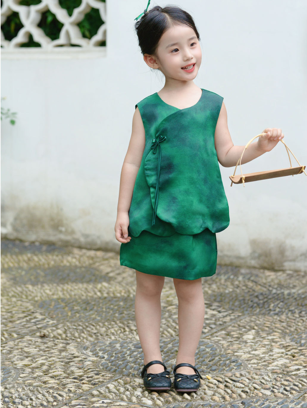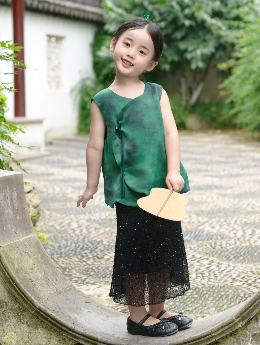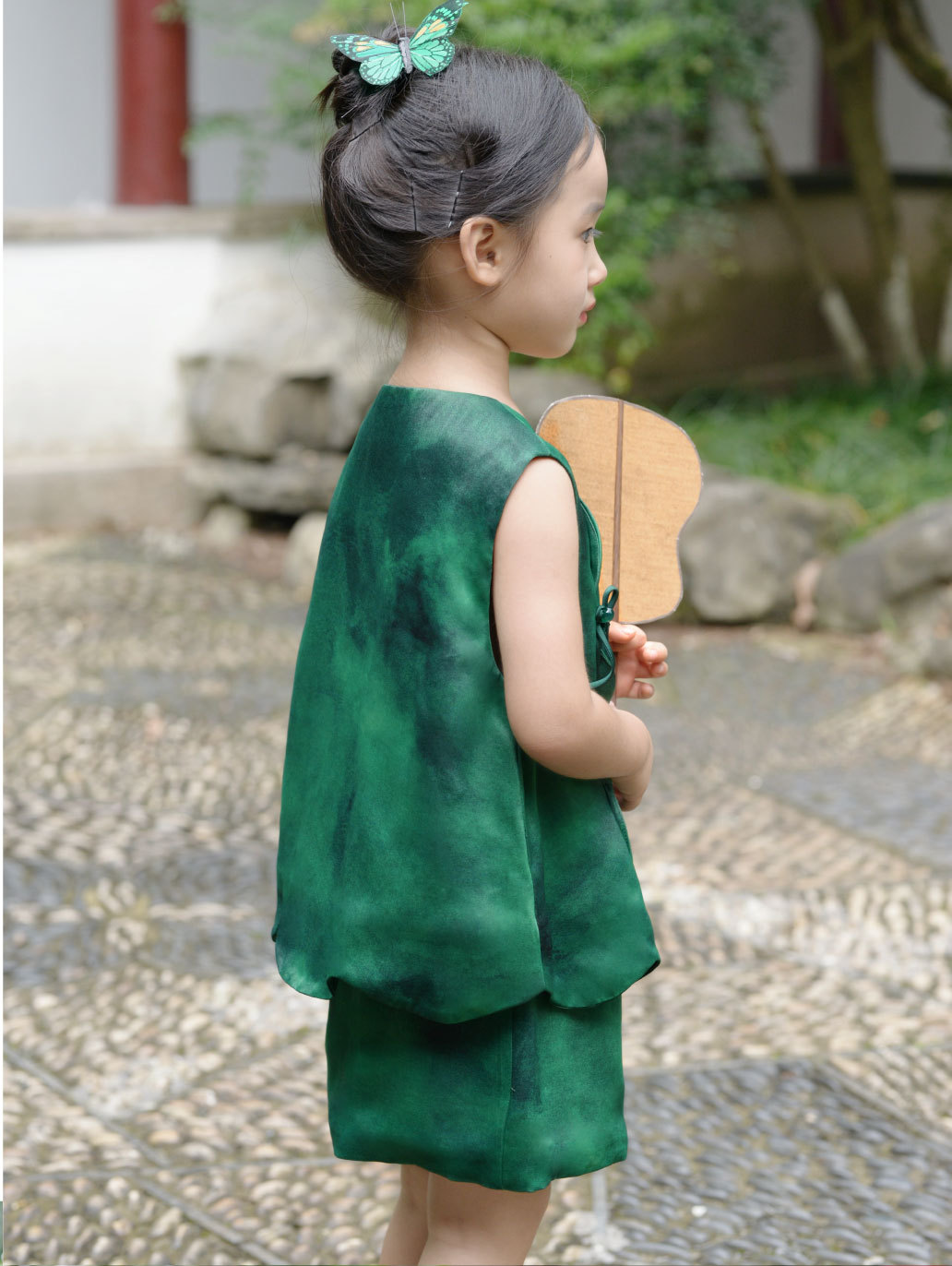 새로운 중국 스타일 다크 그린 세트 용 수직 칼라가있는 민소매 조끼 2024 여성 여름 복고풍 수정 당나라 원피스 조끼