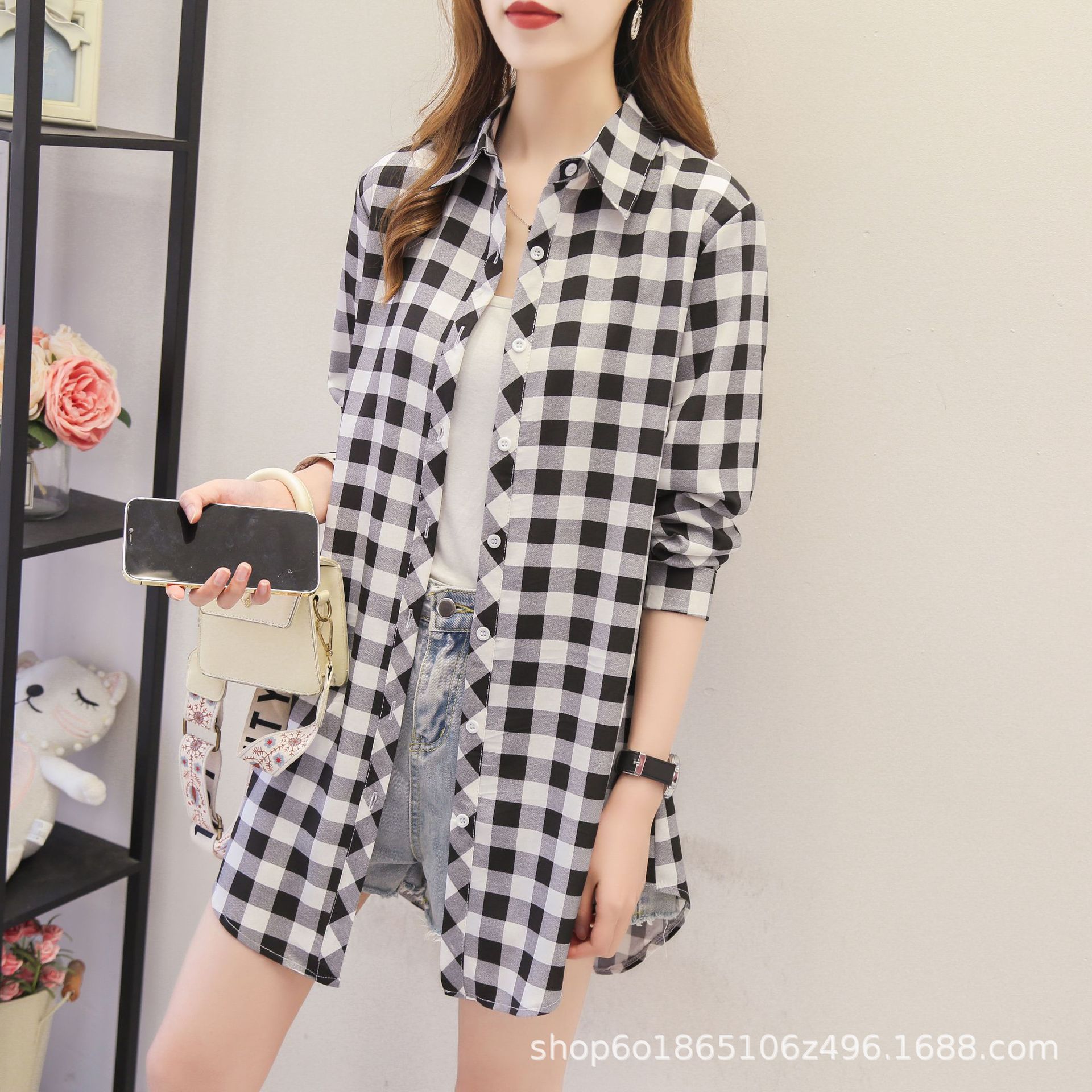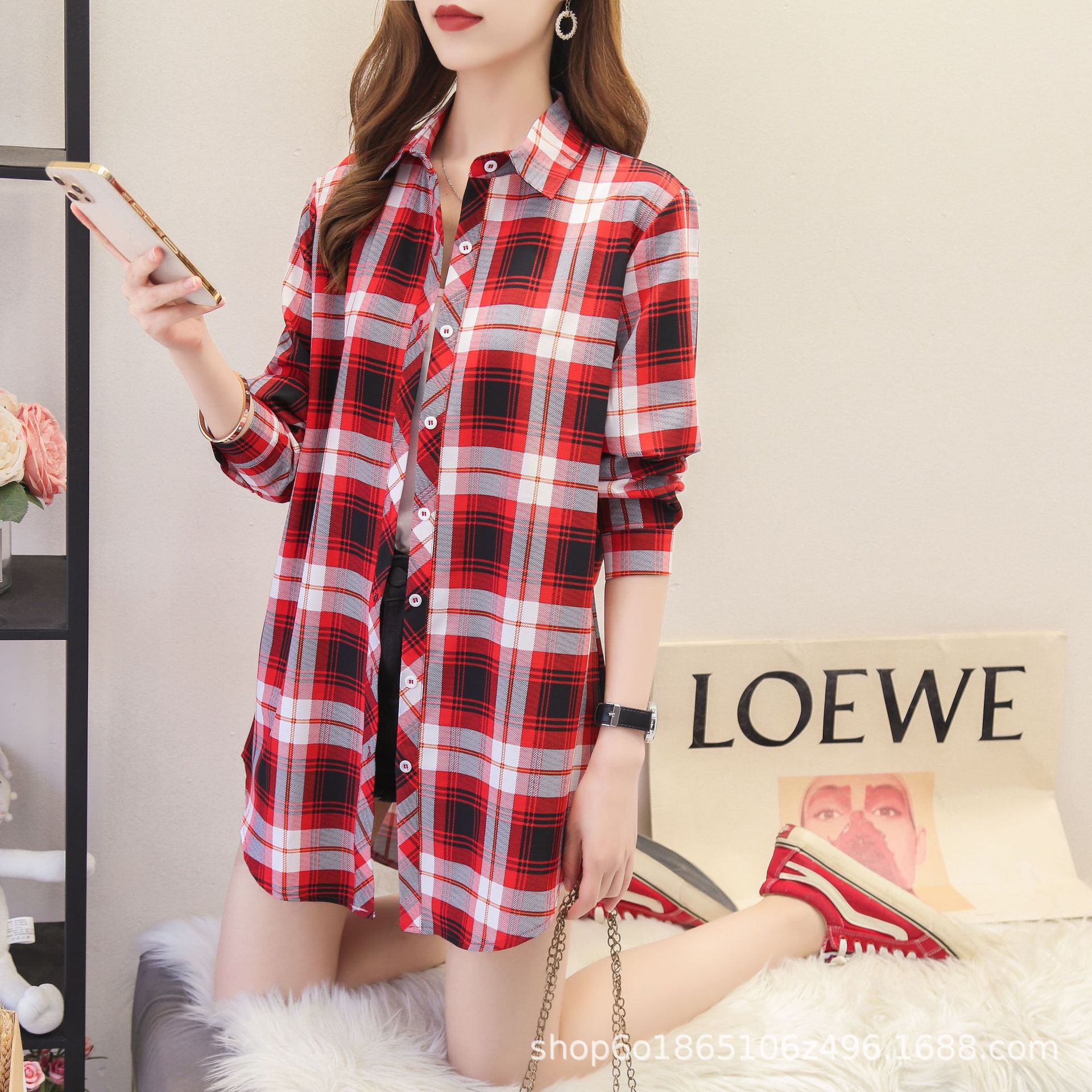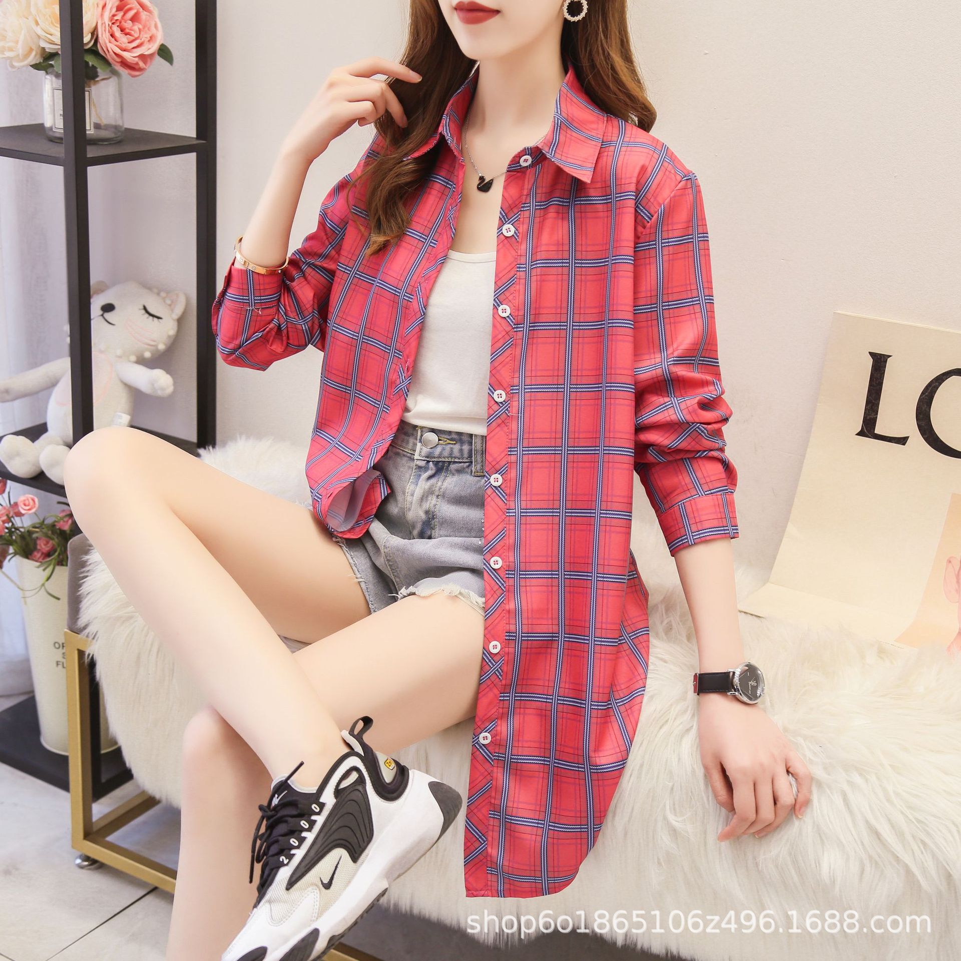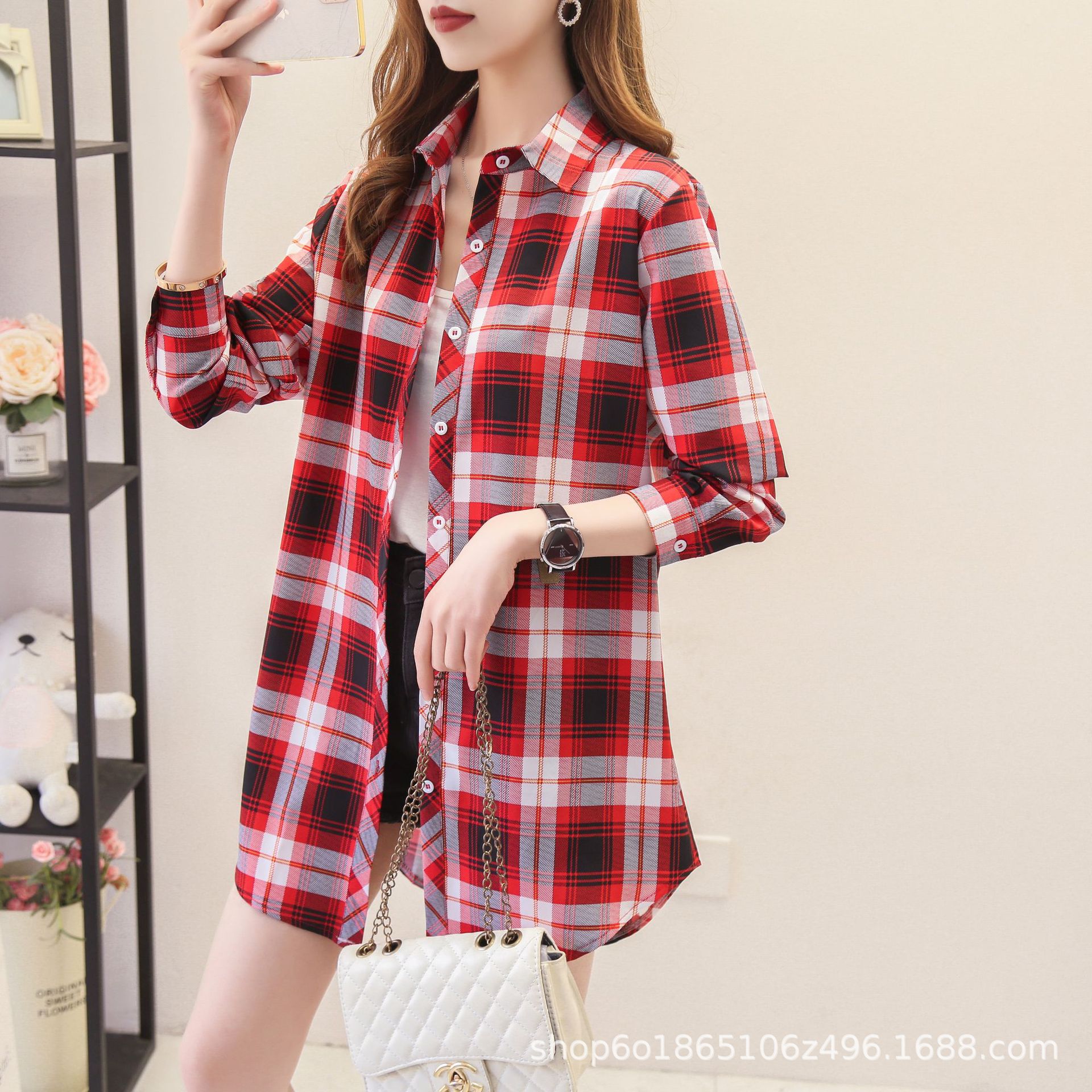예술적 레트로 중간 길이의 격자 무늬 셔츠 여성용 긴팔 느슨한 봄과 가을 우아한 최고 슬리밍 선 스크린 코트 트렌디스토어 가기