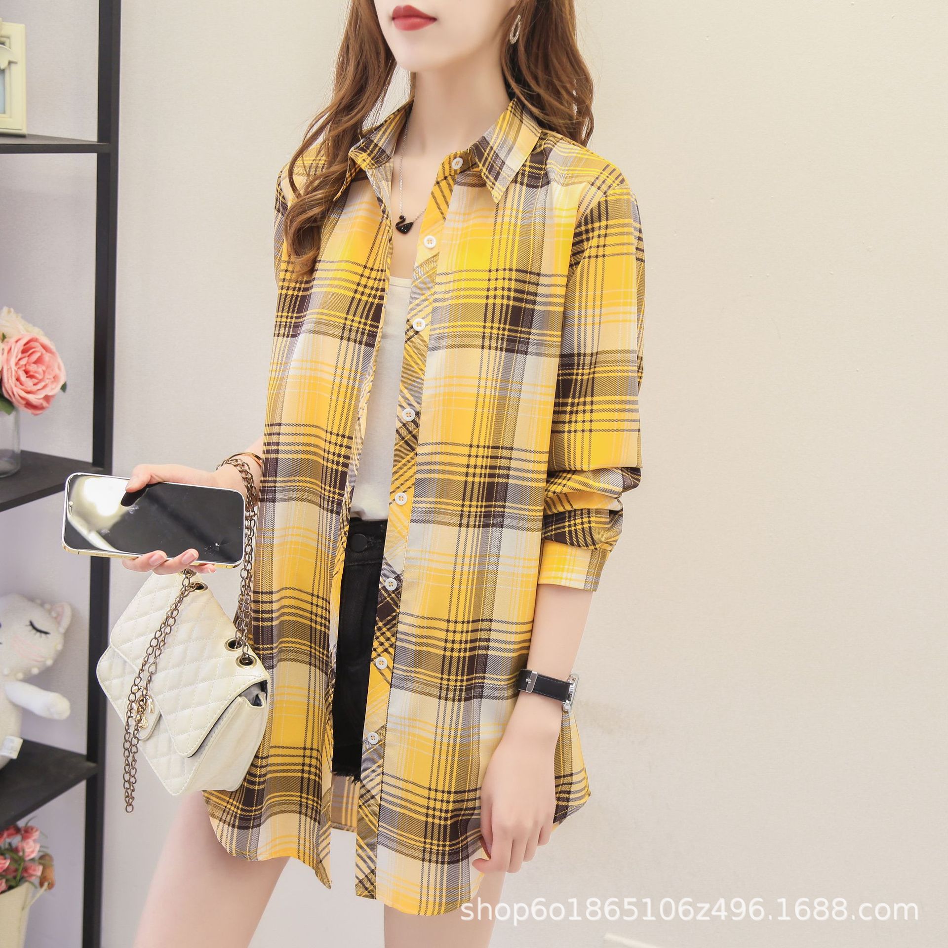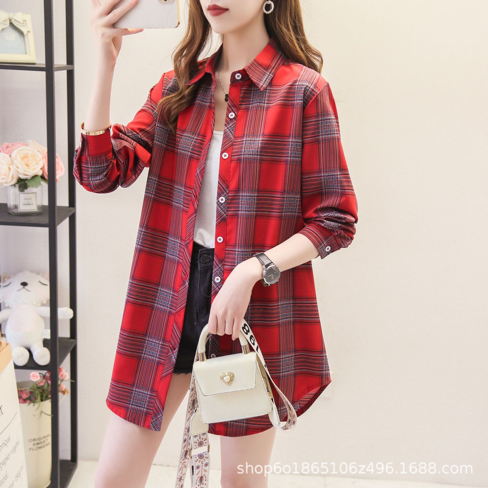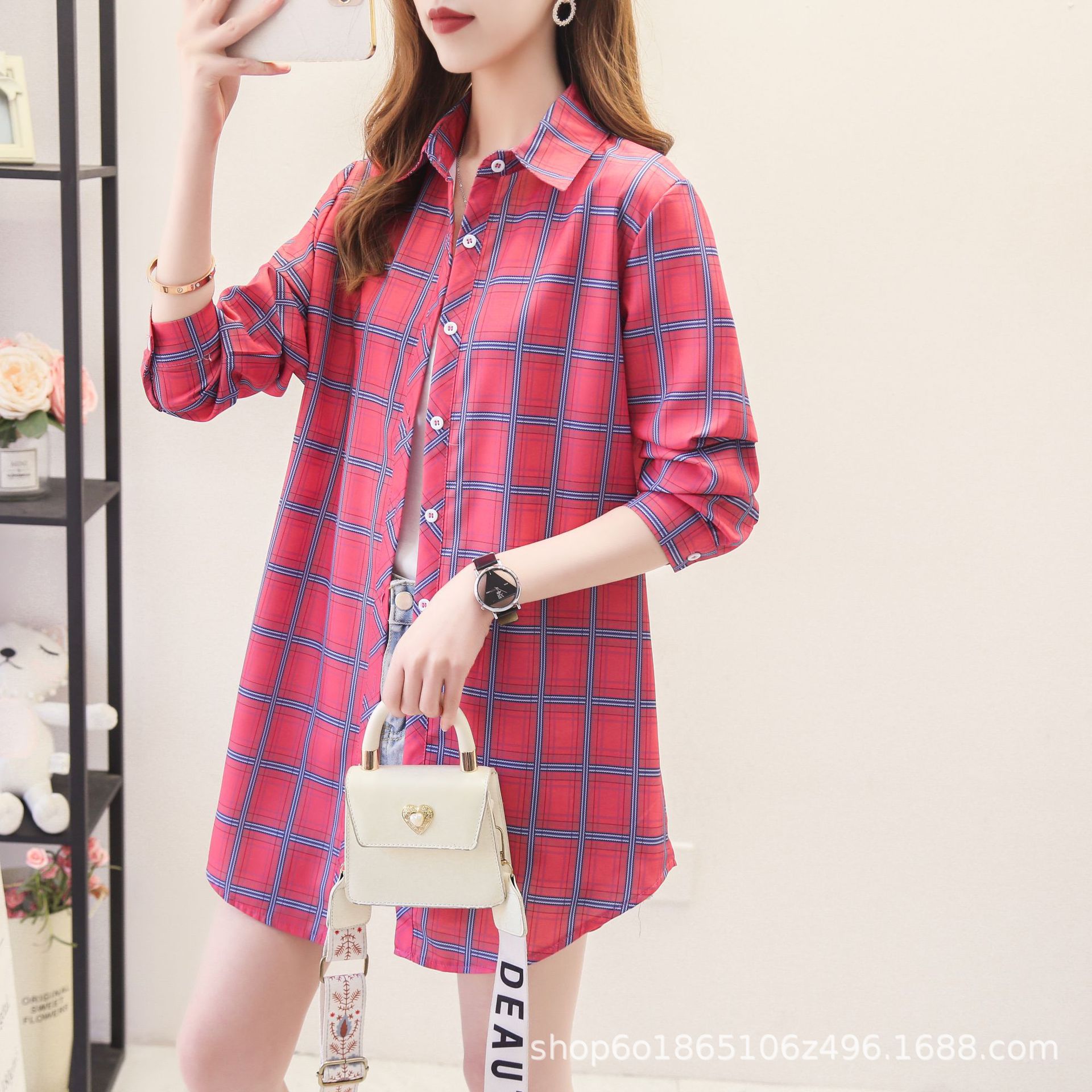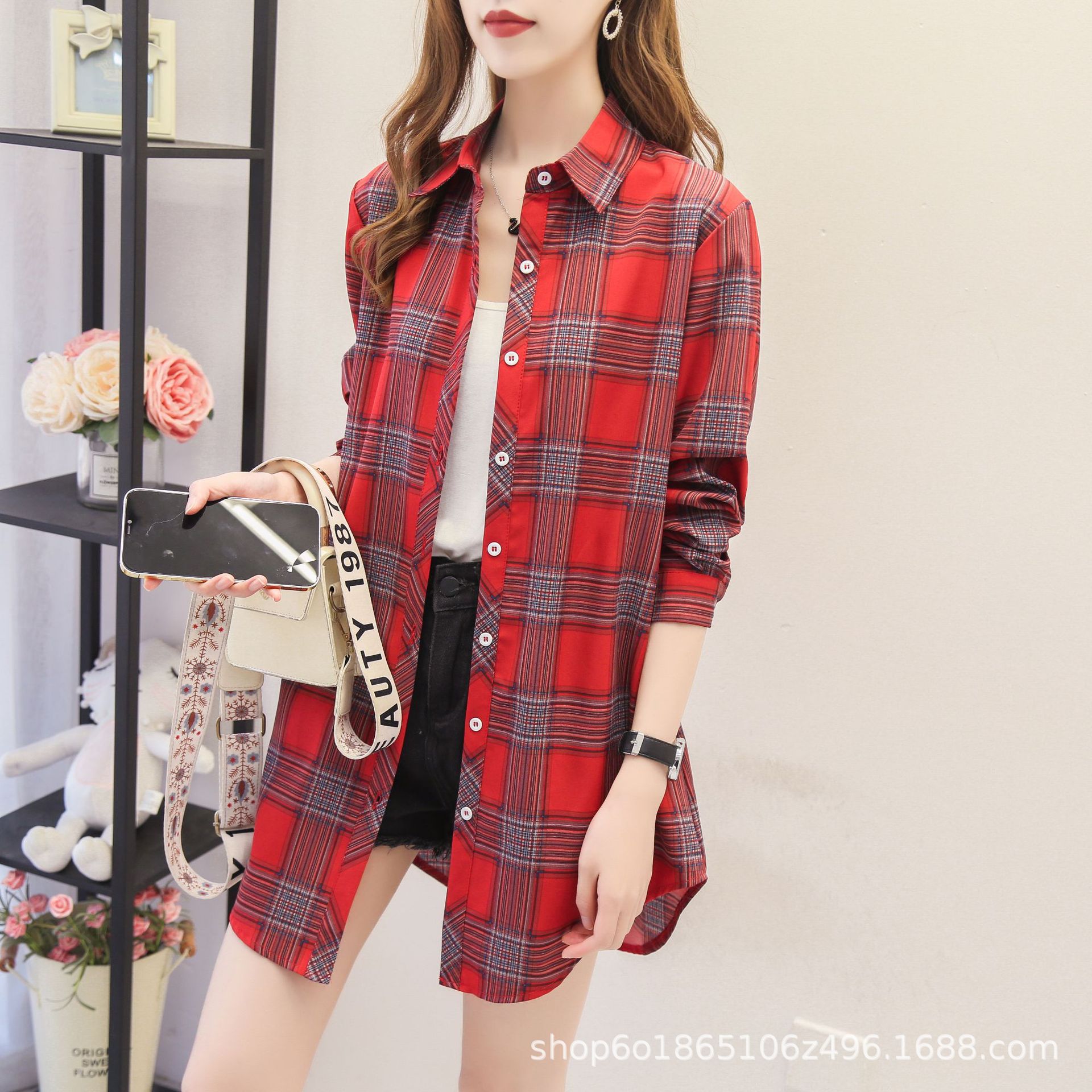 예술적 레트로 중간 길이의 격자 무늬 셔츠 여성용 긴팔 느슨한 봄과 가을 우아한 최고 슬리밍 선 스크린 코트 트렌디스토어 가기