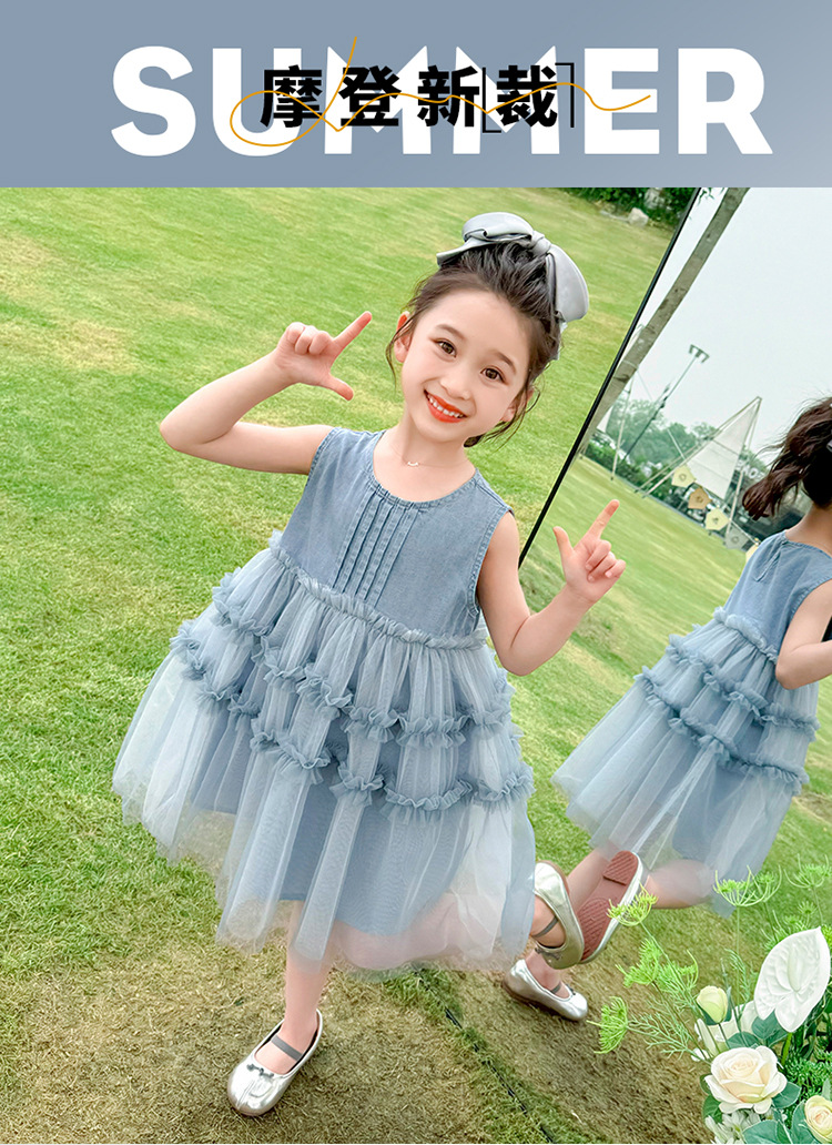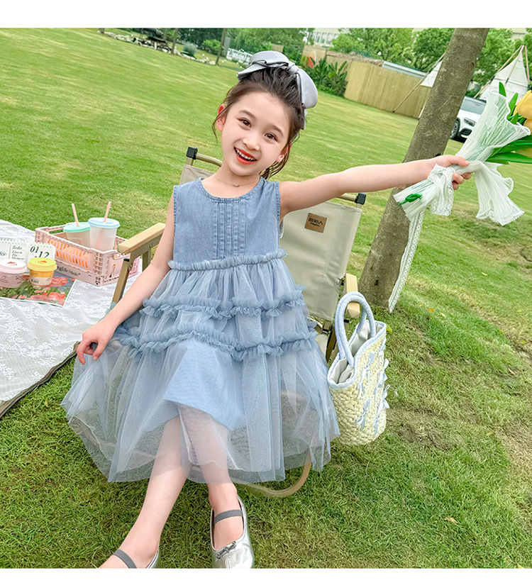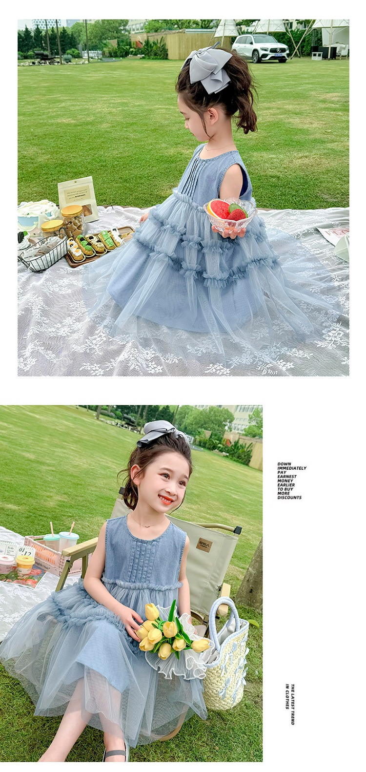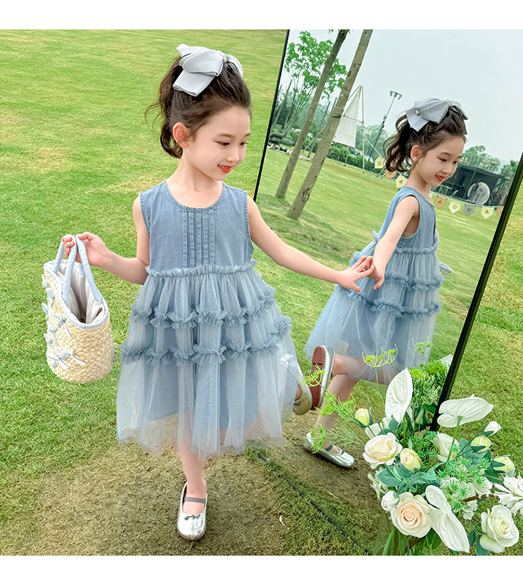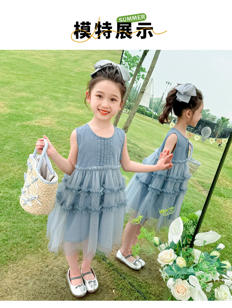 소녀 여름 원피스 2024 새로운 패션 어린 소녀 조끼 데님 거즈 스커트 어린이 달콤한 공주 스커트스토어 가기