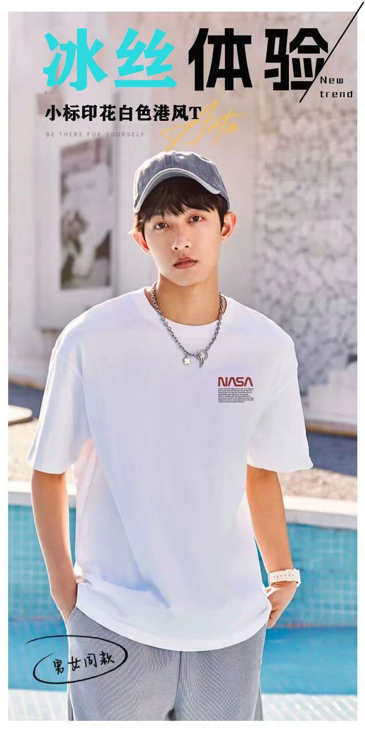 여름 홍콩 스타일 아이스 실크 라운드 넥 트렌디 남성 티셔츠 탑 인쇄 모든 경기 캐주얼 레트로 탑 커플 의류스토어 가기
