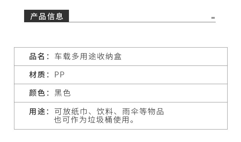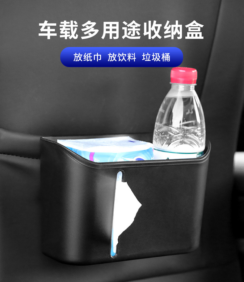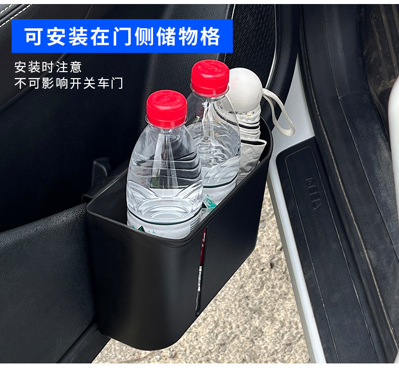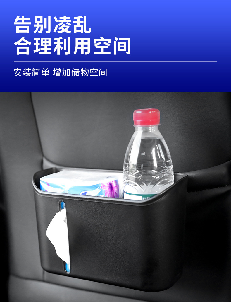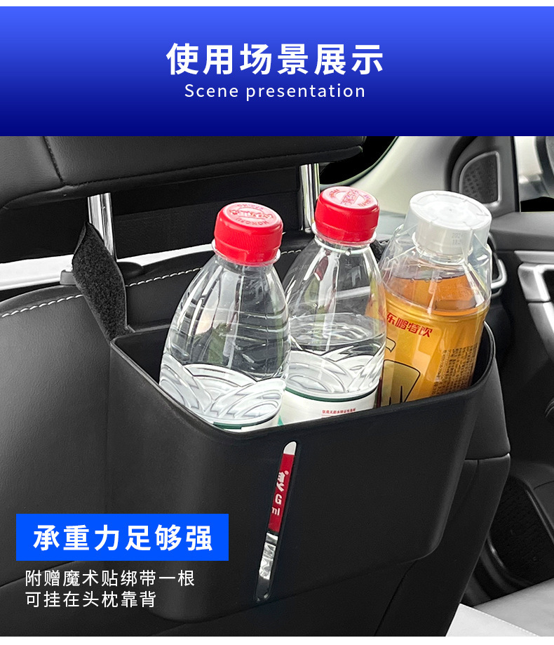 【特点】:适合安装在头枕杆、椅背收纳袋,车门等位置,可以放纸巾,饮料,可以当垃圾桶。实用性强,性价比高。容量大,可以放3瓶饮料。