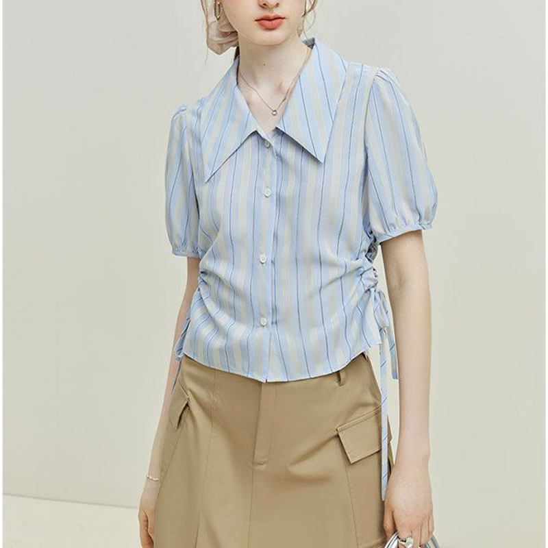2024 년 여름 새로운 도착 프랑스 스타일 니치 반팔 셔츠, 여자를위한 중공 허리 디자인 감각 우아한 짧은 탑