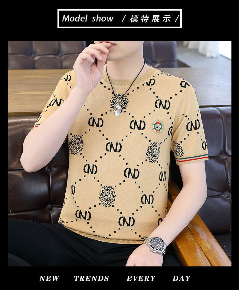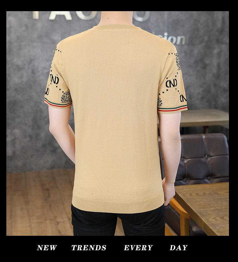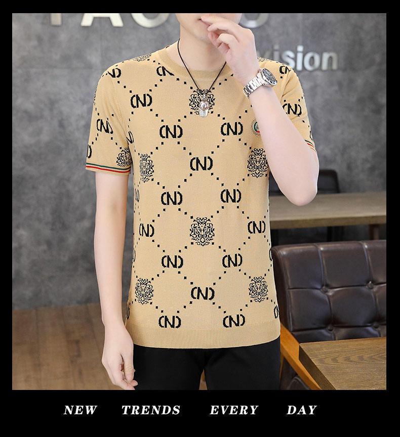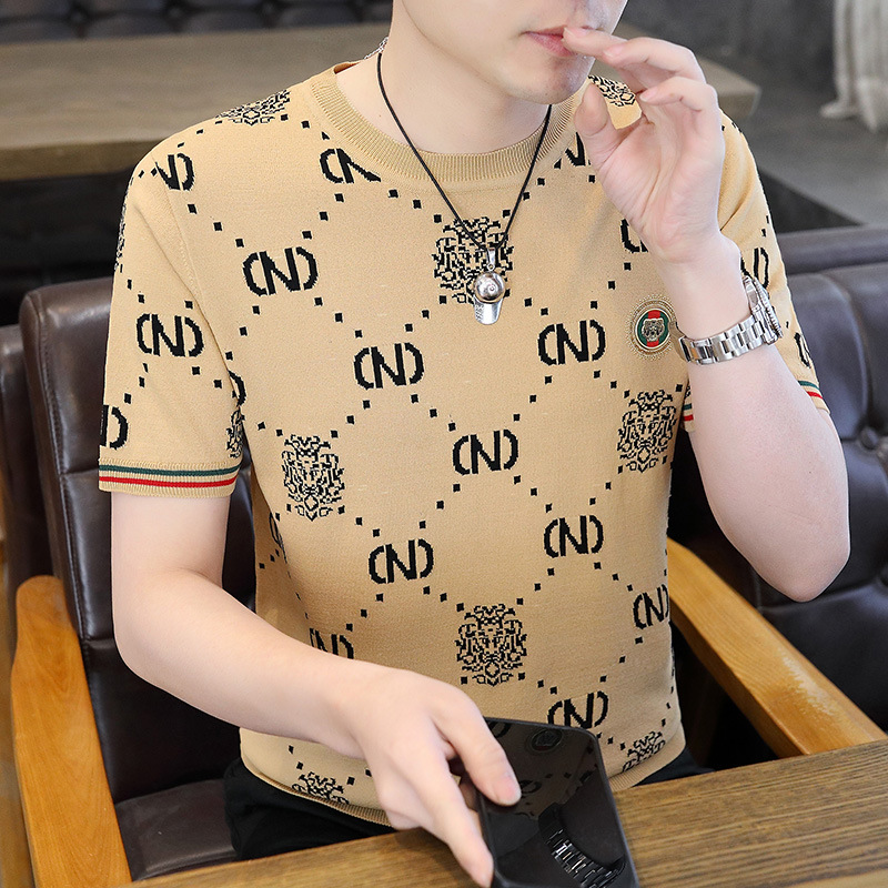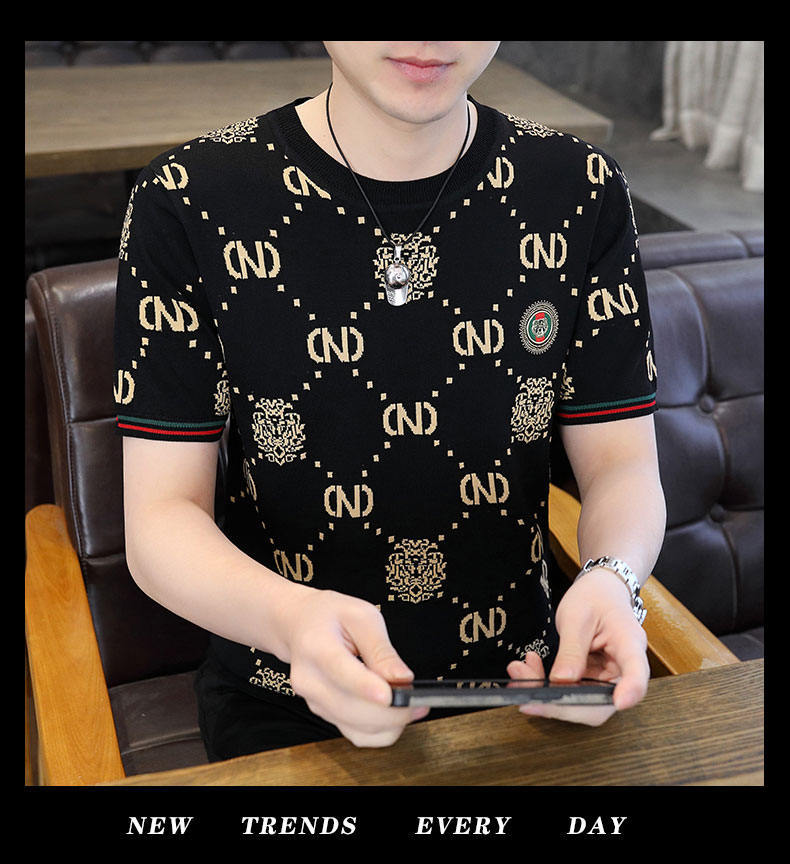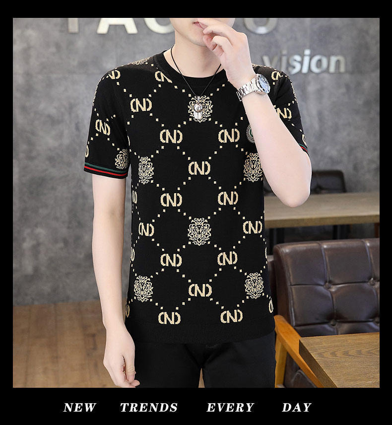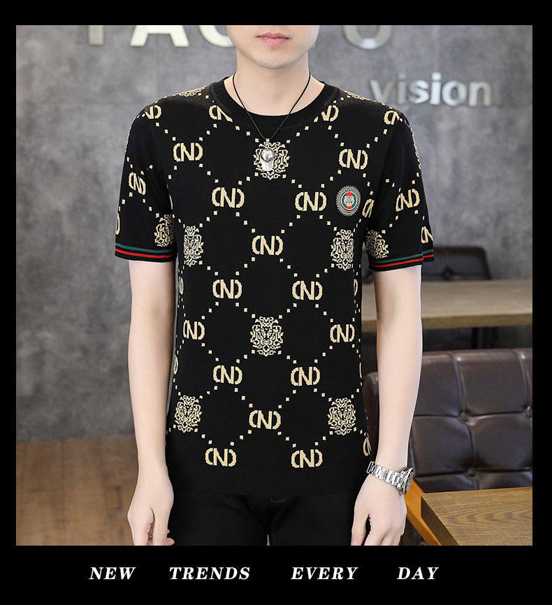 자수 니트 티셔츠 남성 여름 트렌디 브랜드 얇은 흰색 반팔 최고급 남성 아이스 실크 크루 넥베이스 셔츠스토어 가기