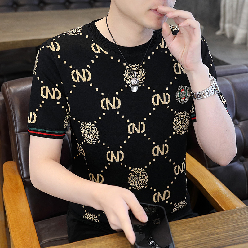 자수 니트 티셔츠 남성 여름 트렌디 브랜드 얇은 흰색 반팔 최고급 남성 아이스 실크 크루 넥베이스 셔츠