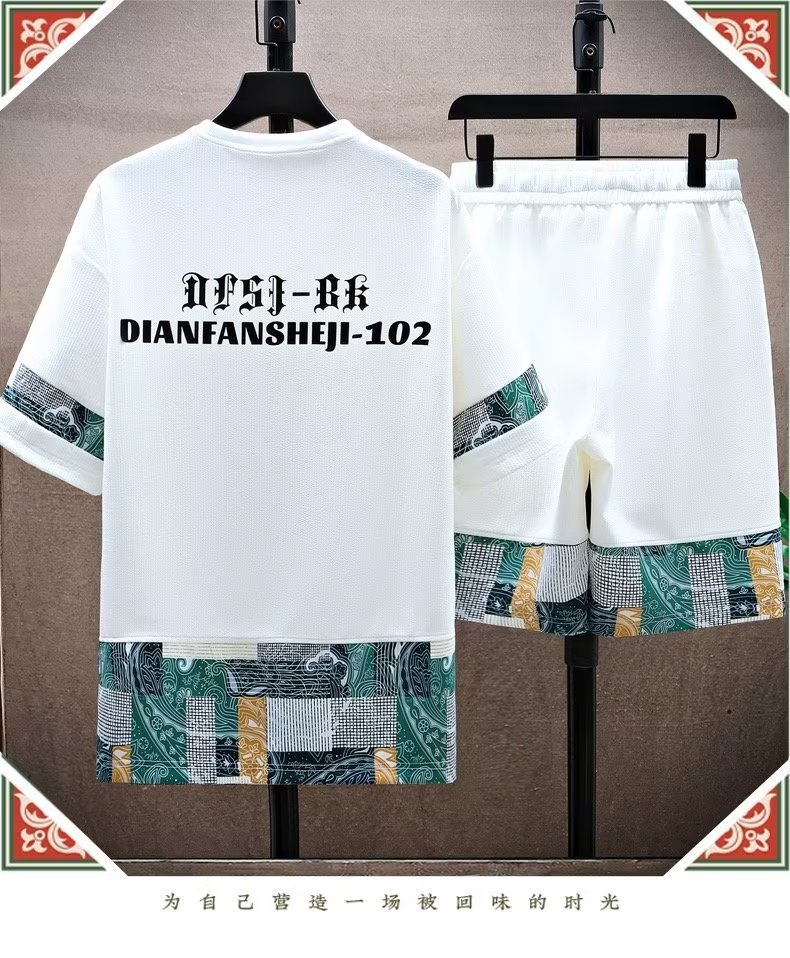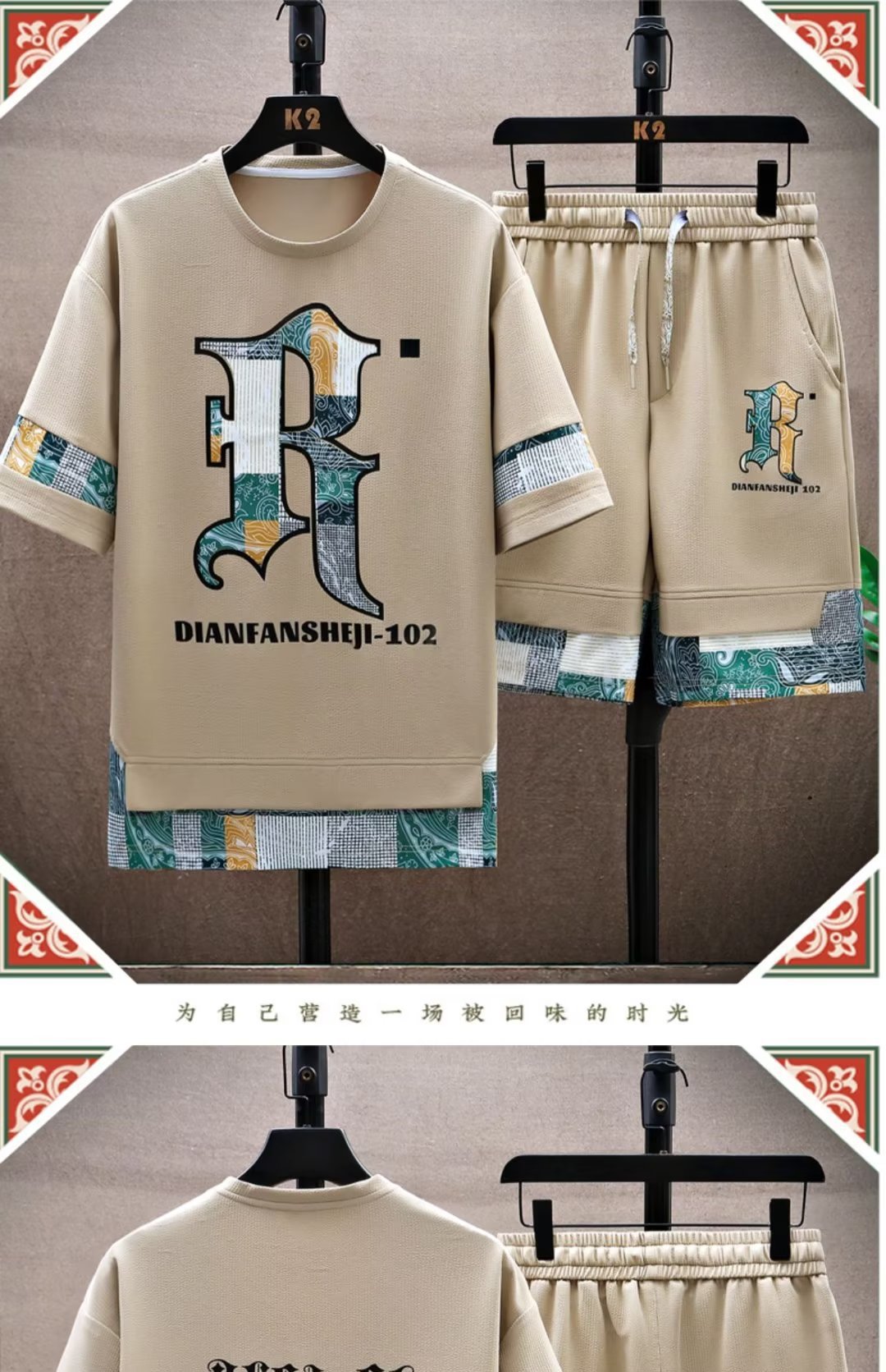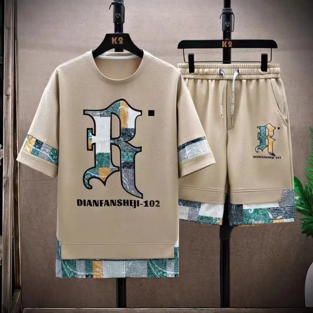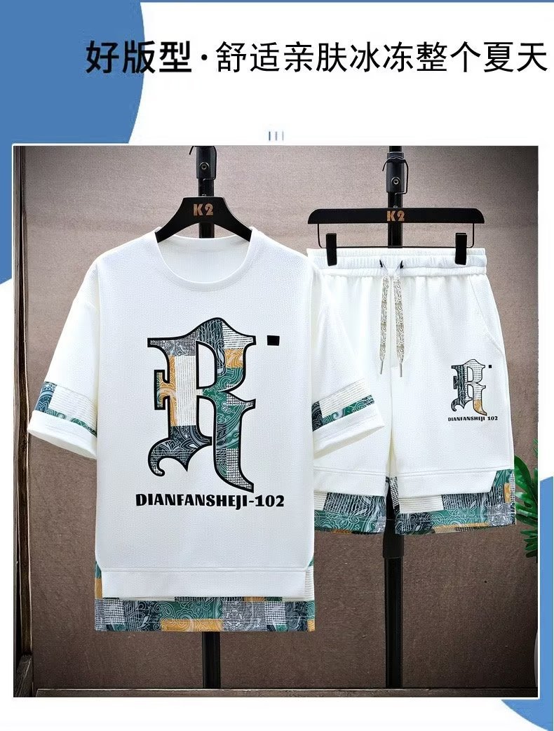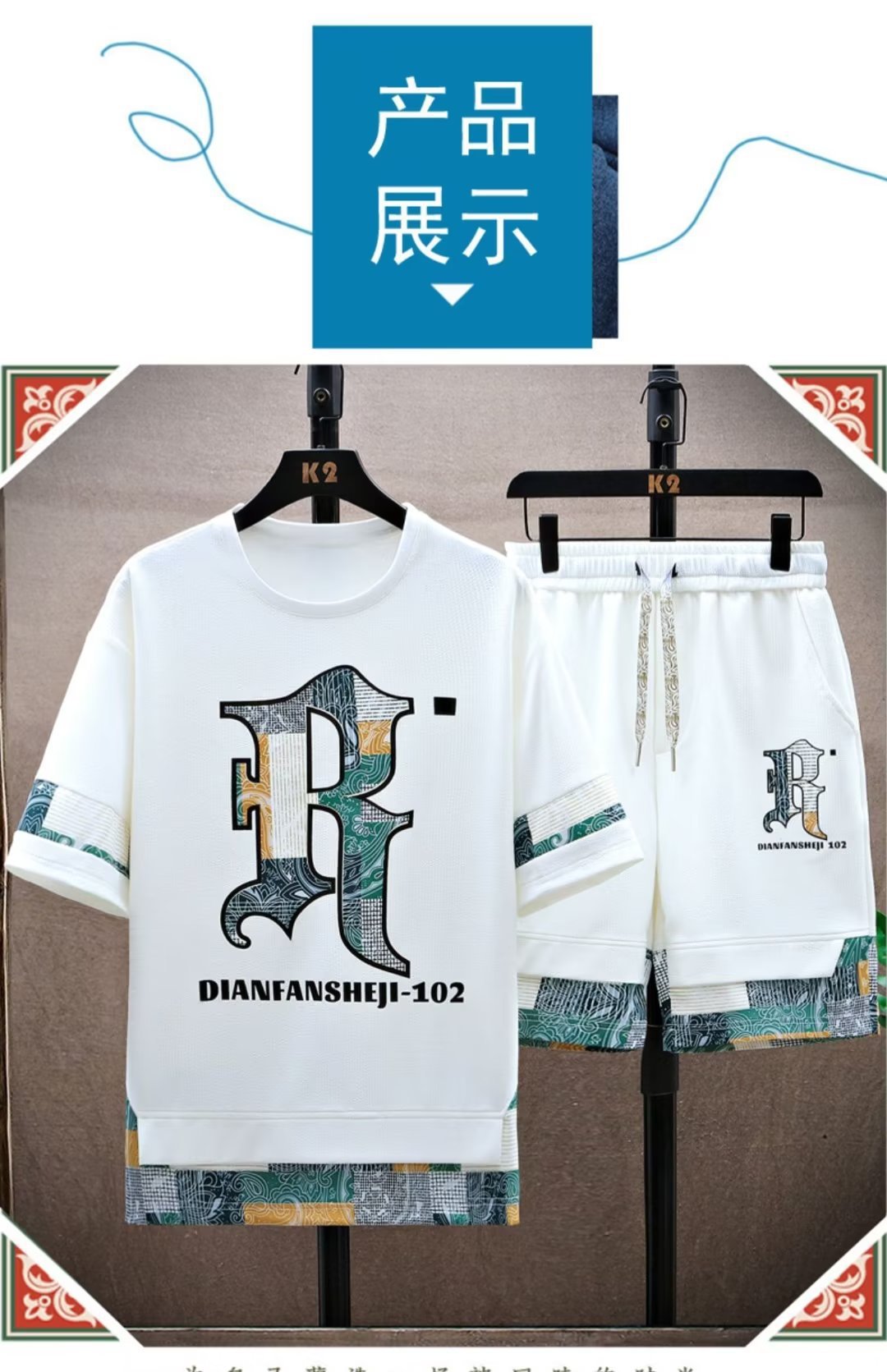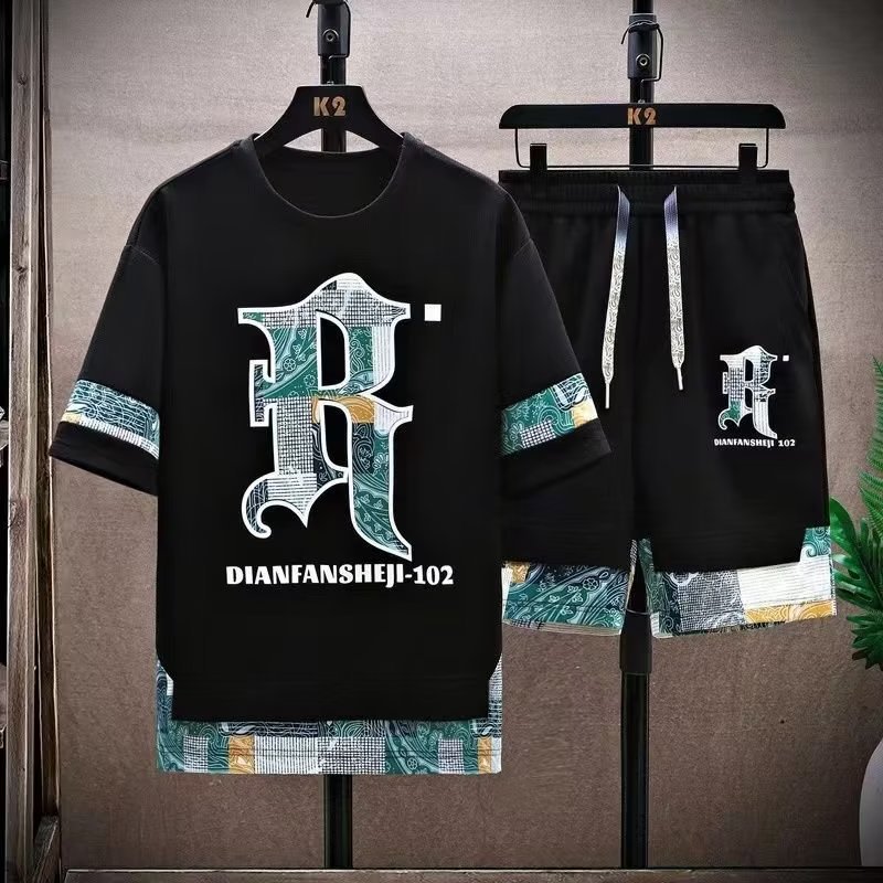 캐주얼 스포츠 세트 남성 패션 브랜드 여름 가짜 투피스 반팔 남성 의류 세트 잘 생긴 패션 학생 의류