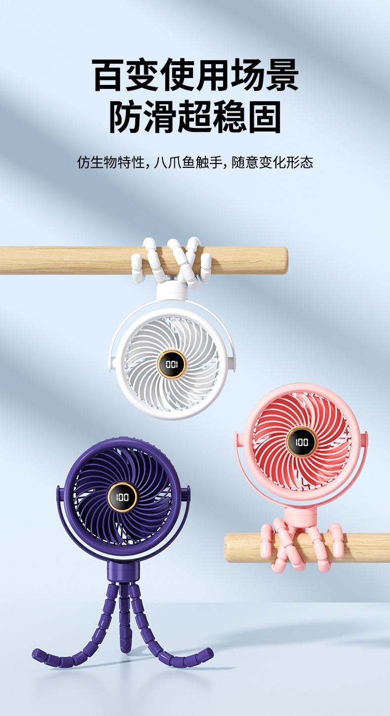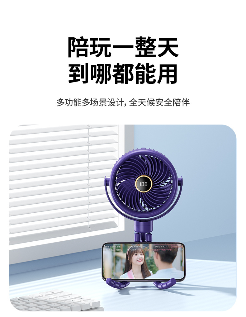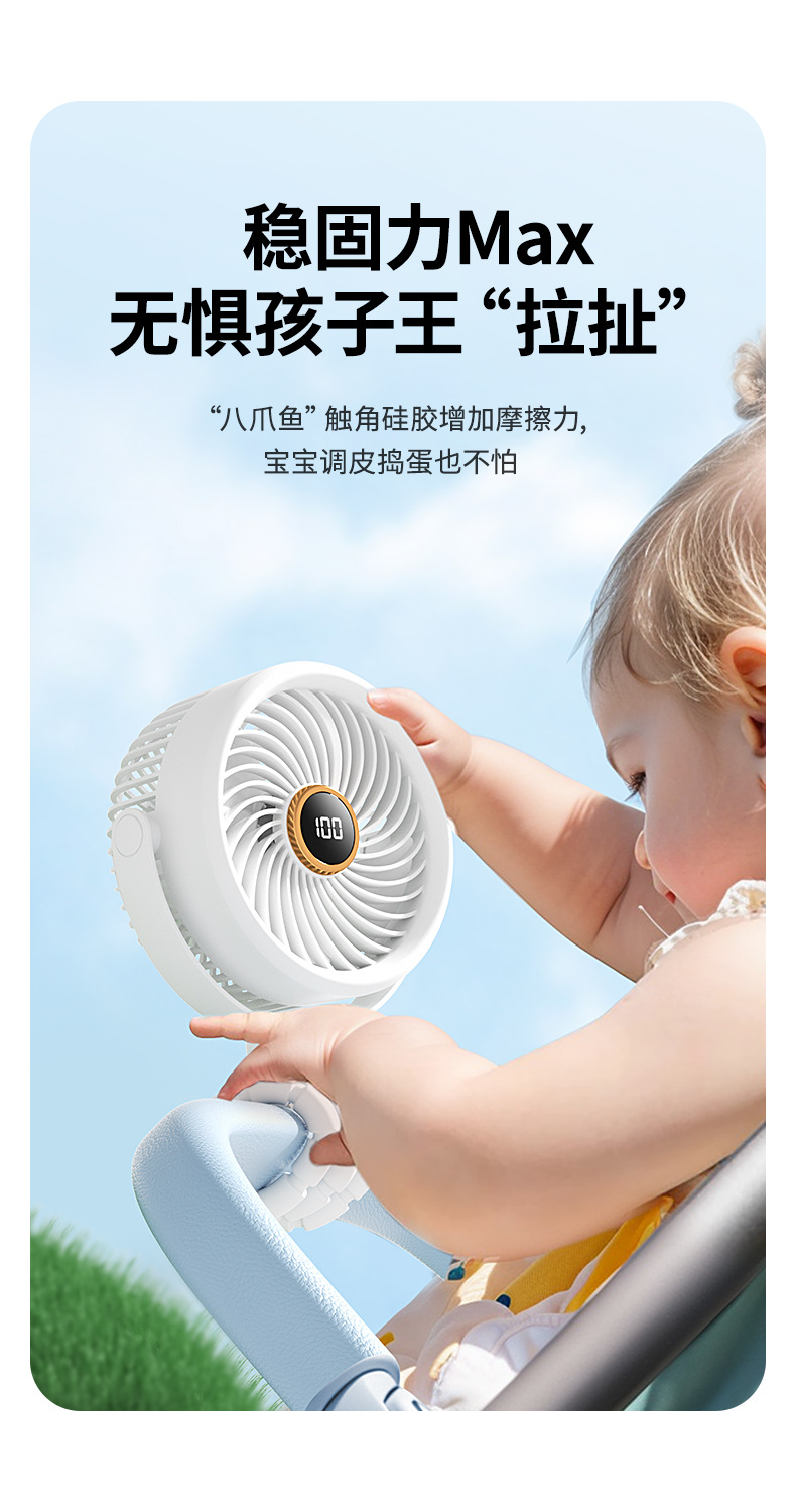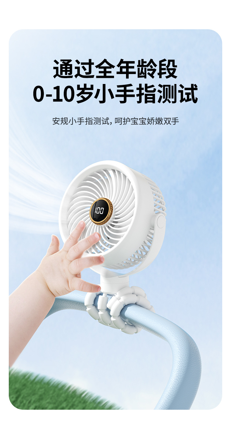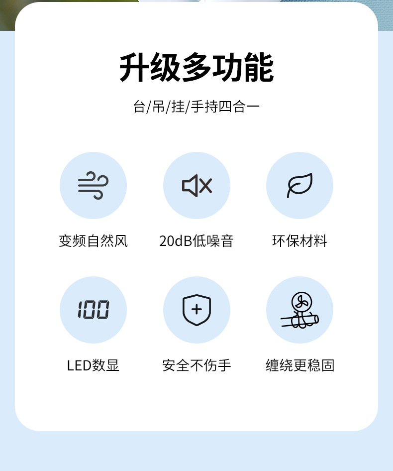 功能:五档风速可调/数显高清屏幕随时查看电量及风力大小/姿态百变摆法多样,可手持、可立、可挂、可缠绕。