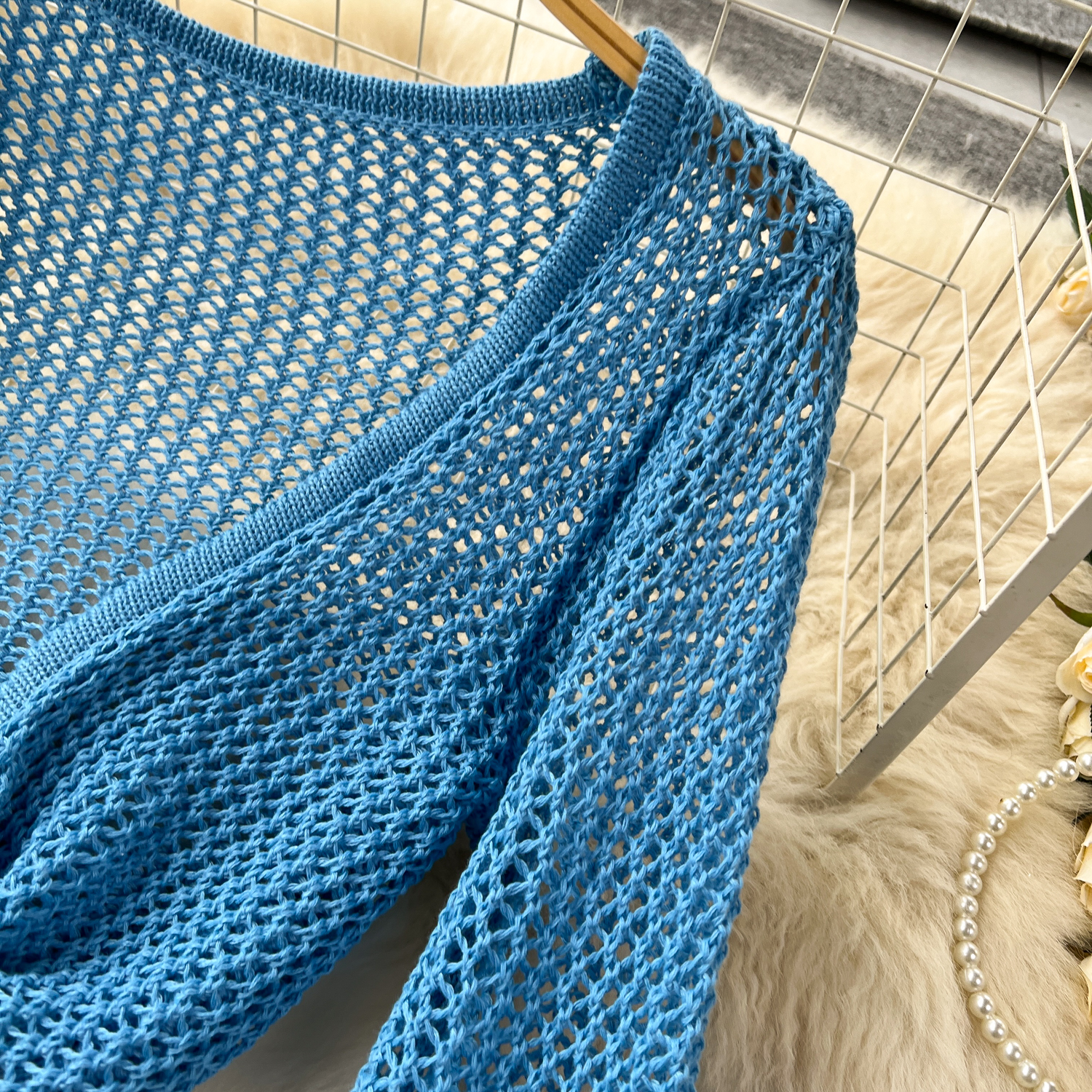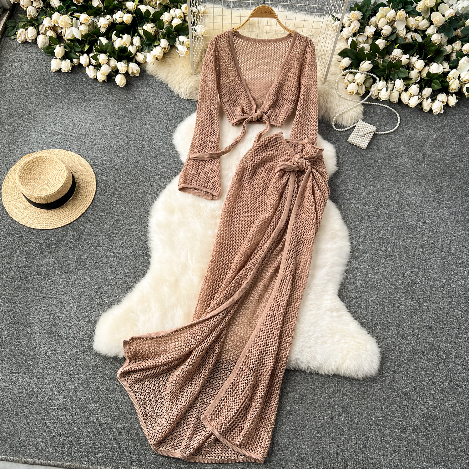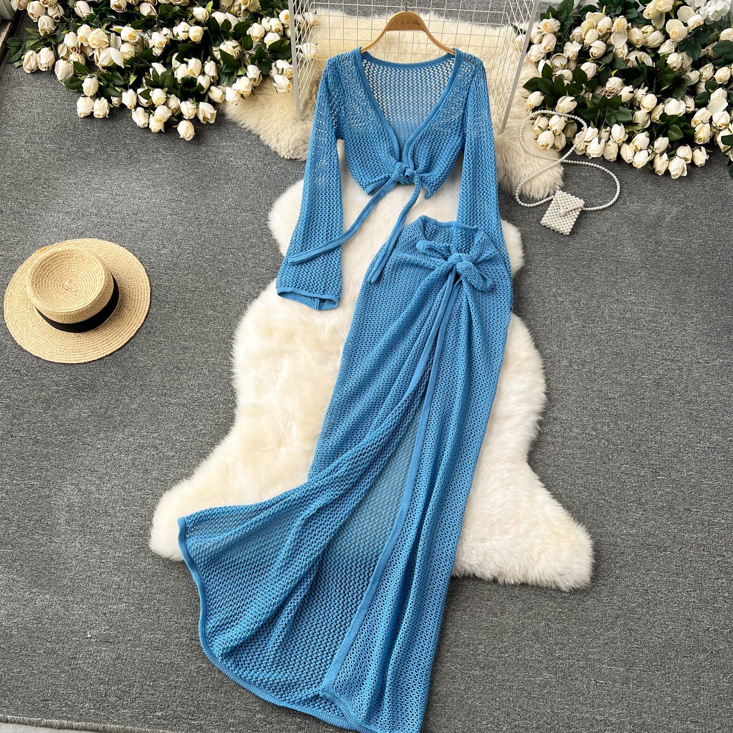 해변 홀리데이 스타일 세트 여성 소규모 공공 인터넷 기념 스트랩 허리 긴팔 니트 셔츠 빈 스커트 세트