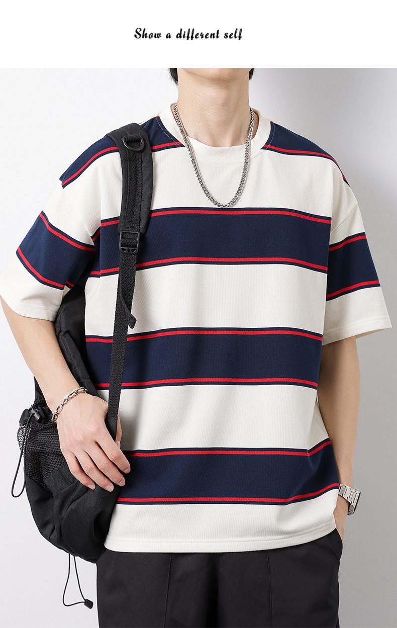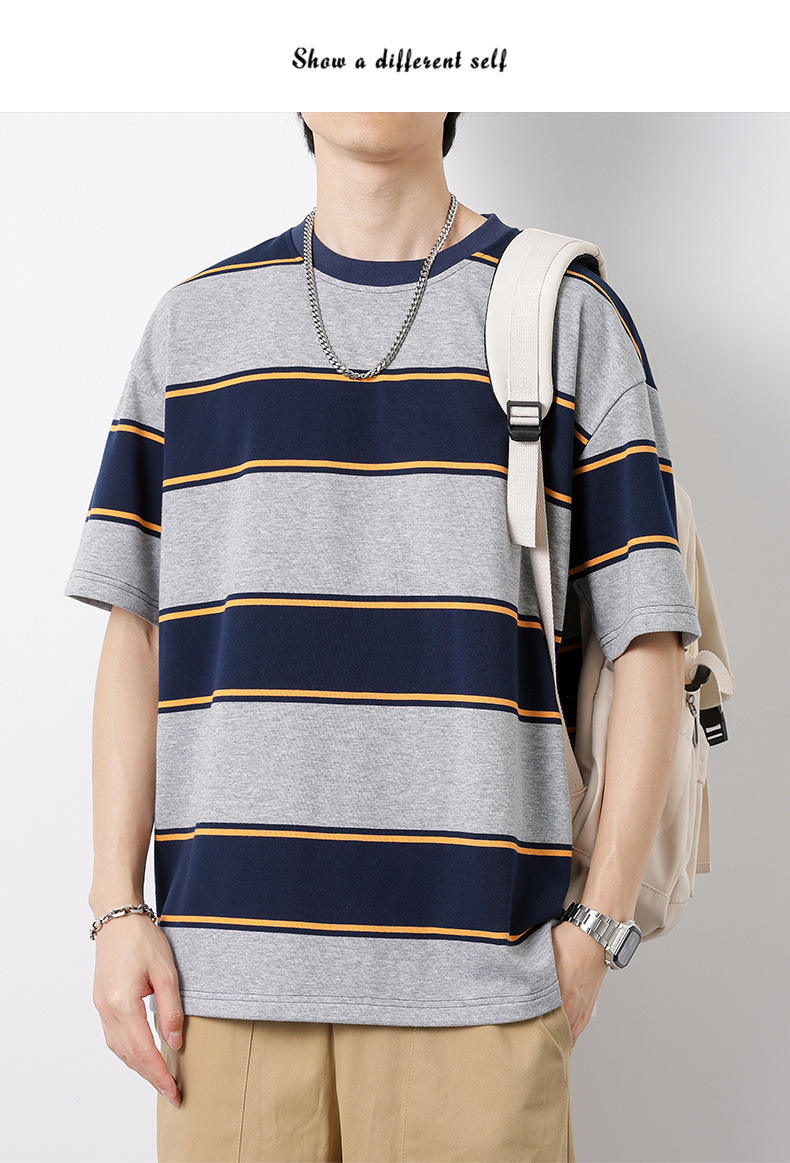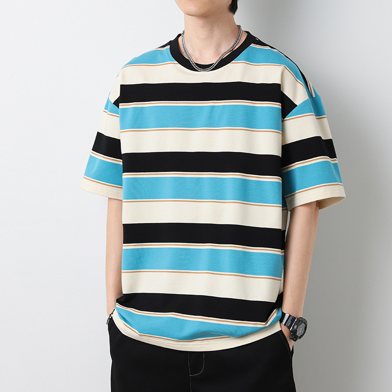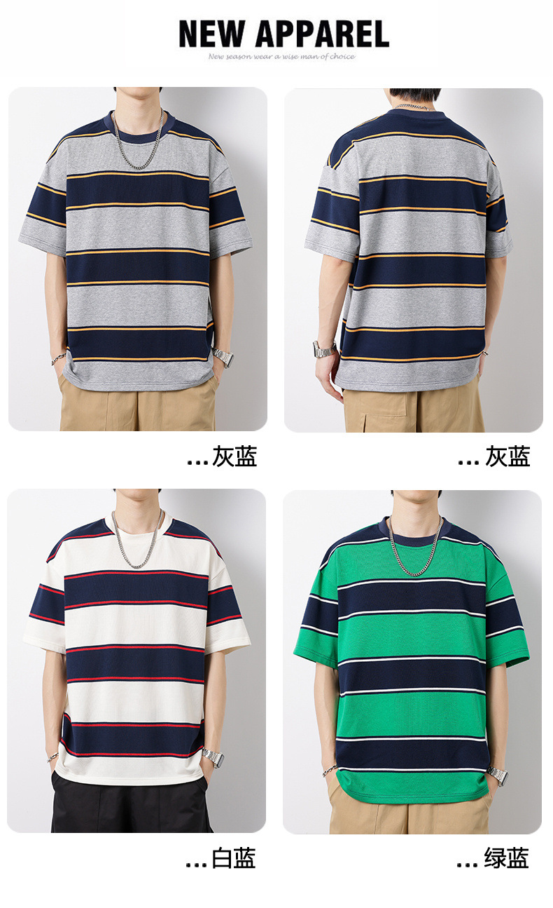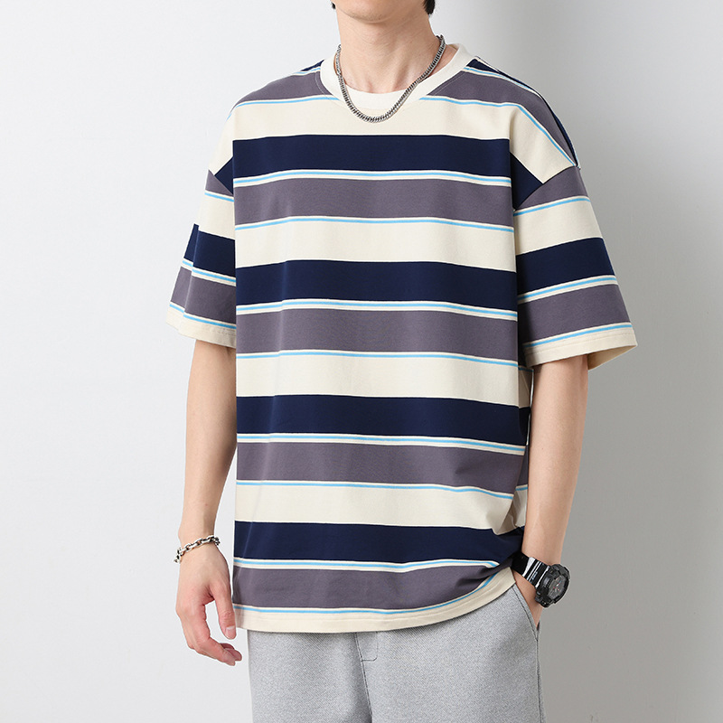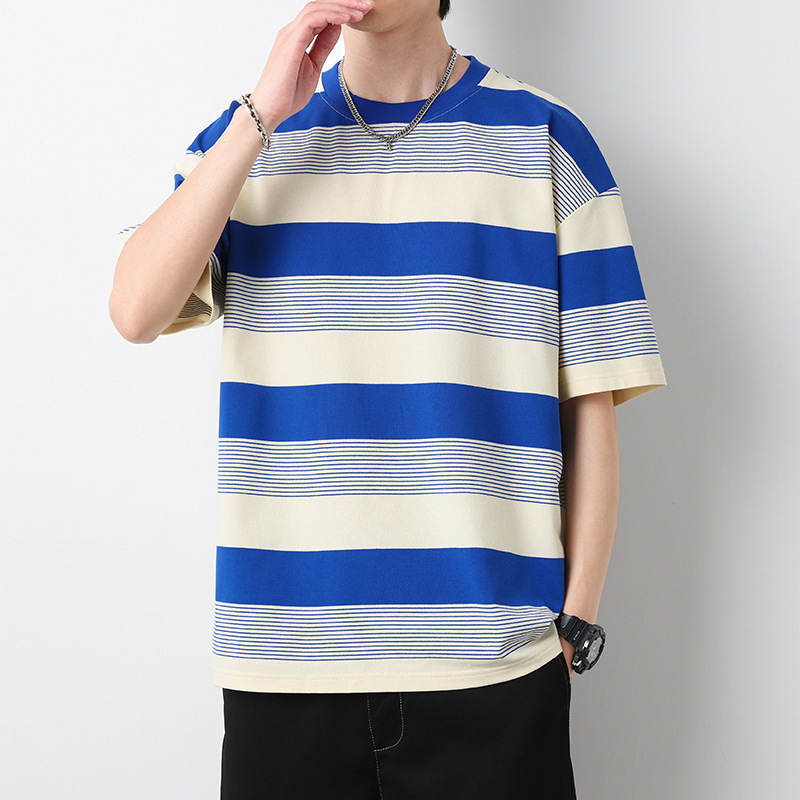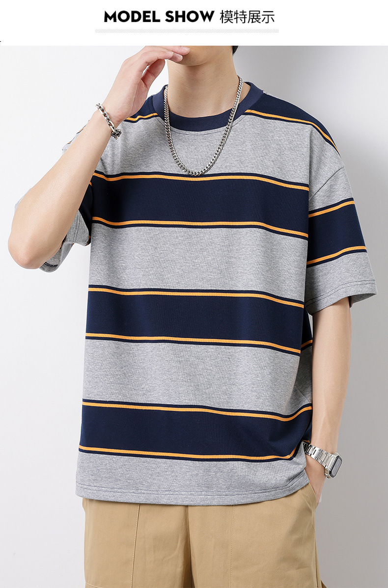 남자 티셔츠 일본식 새 줄무늬 옷 여름 헤비 라운드 넥 남자 느슨한 올 매치 캐주얼 쇼트 슬리브 남자스토어 가기
