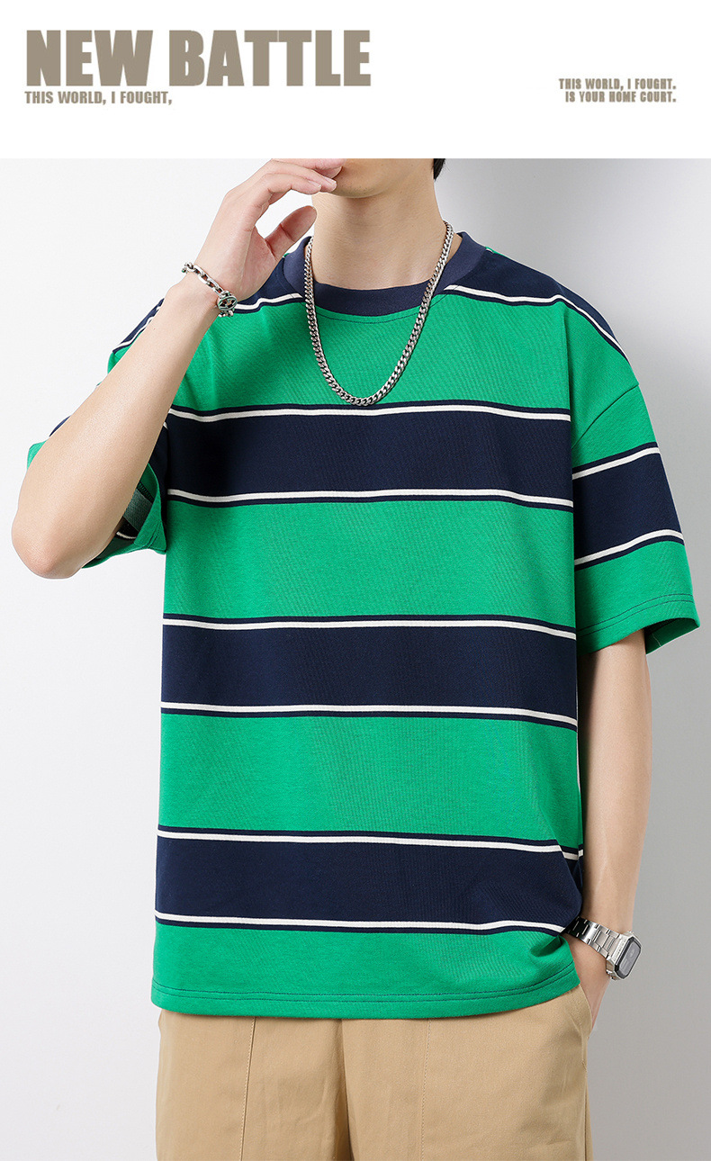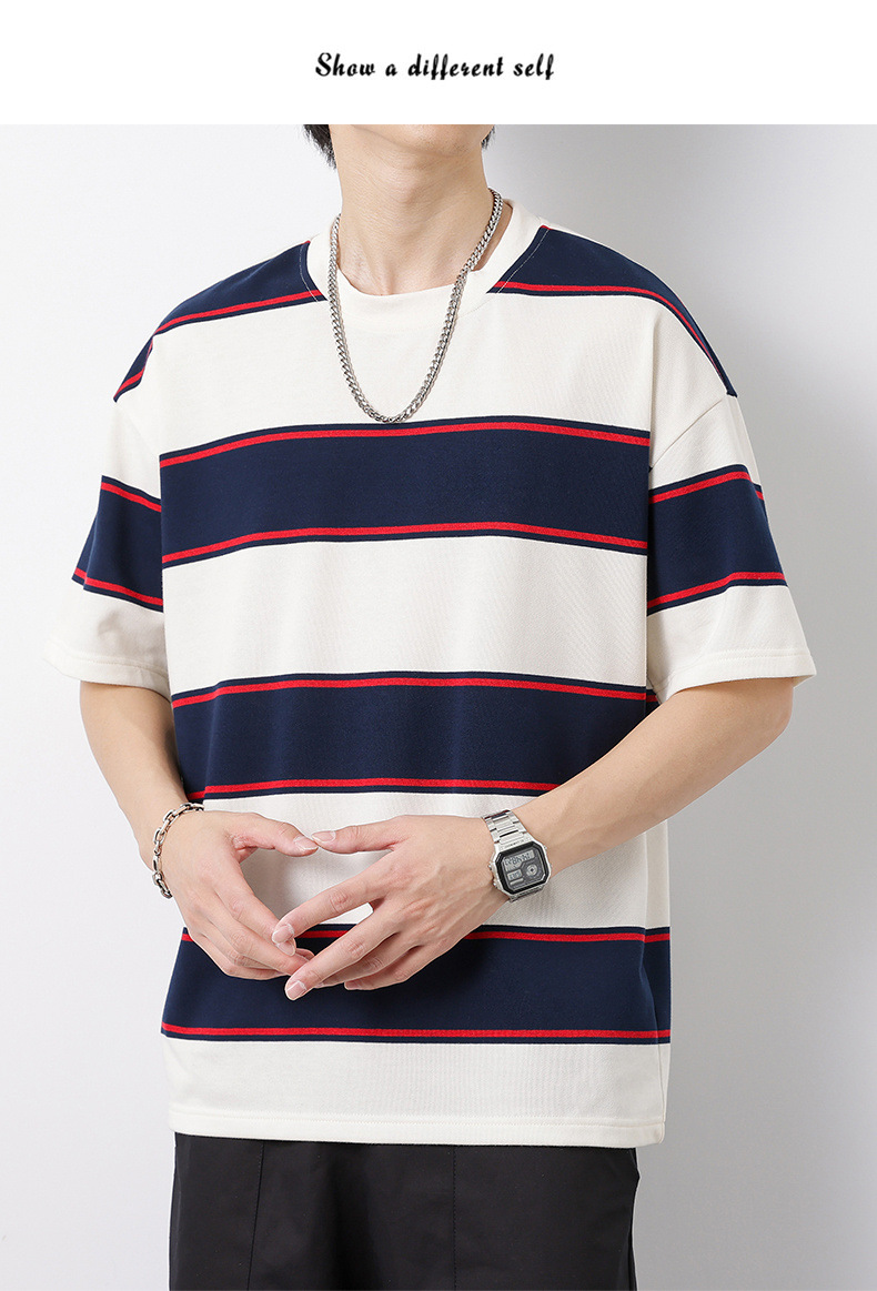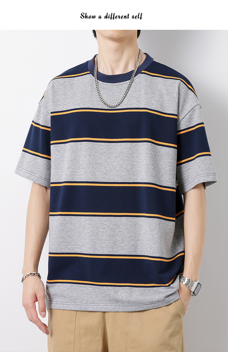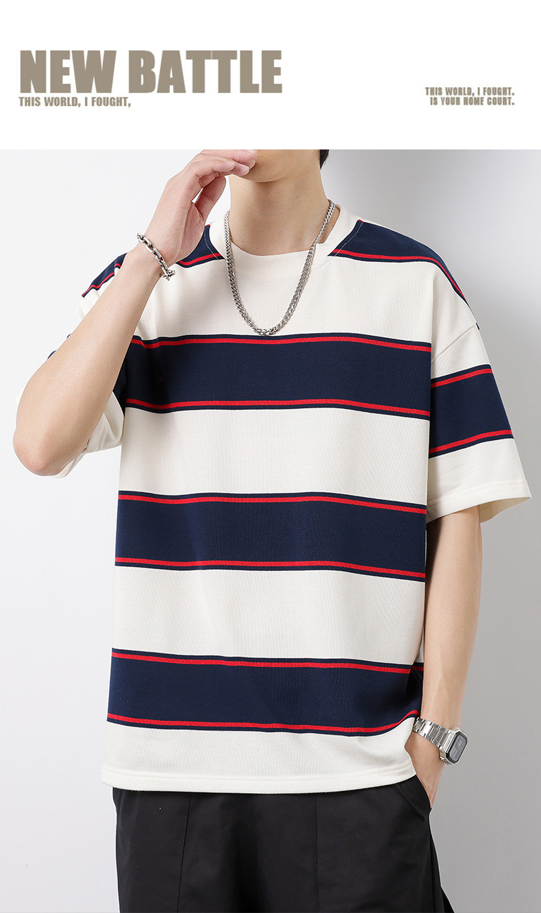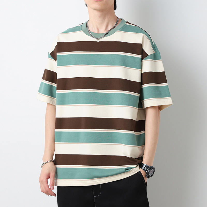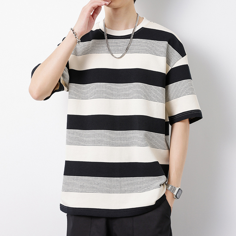 남자 티셔츠 일본식 새 줄무늬 옷 여름 헤비 라운드 넥 남자 느슨한 올 매치 캐주얼 쇼트 슬리브 남자스토어 가기