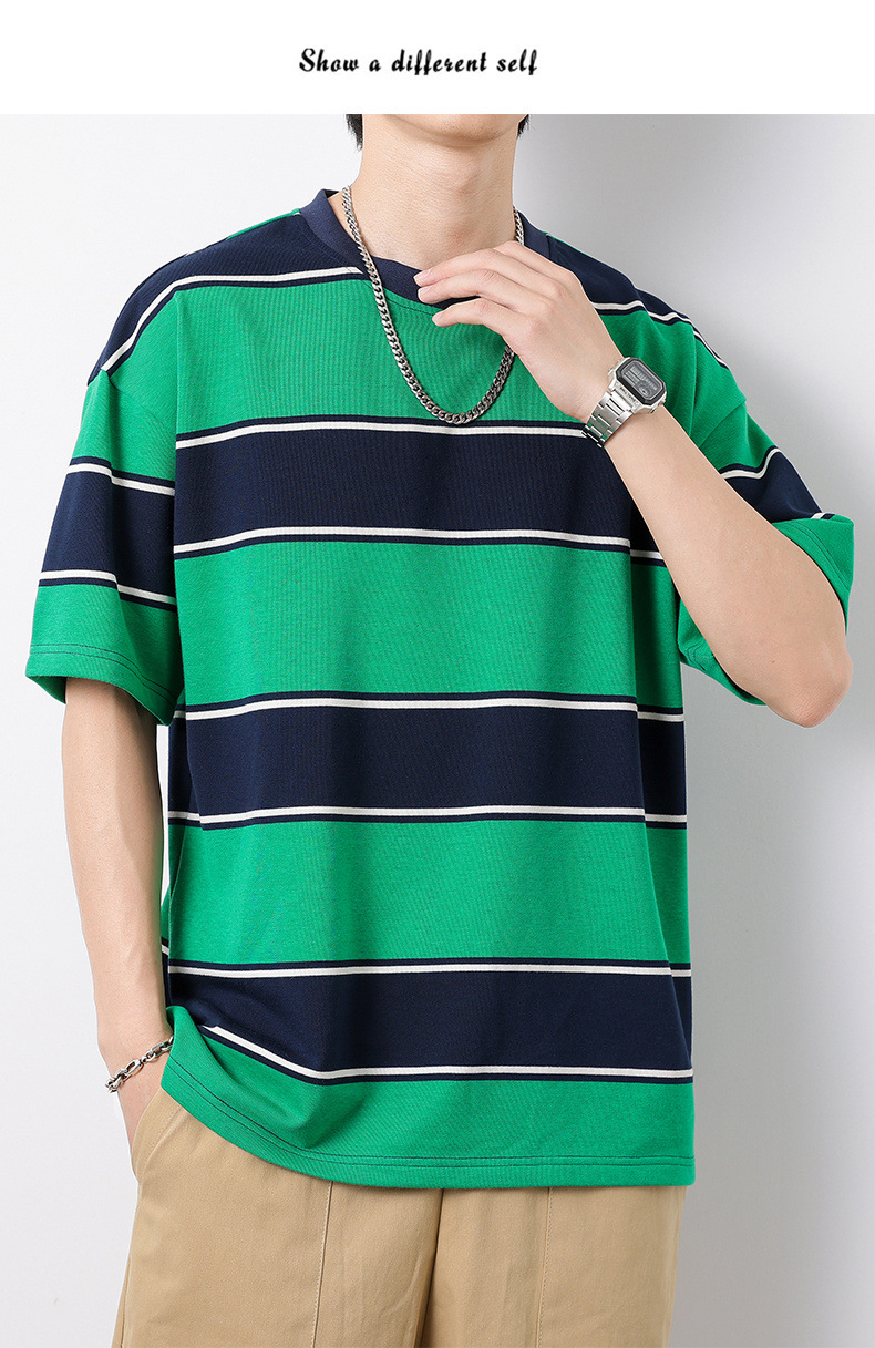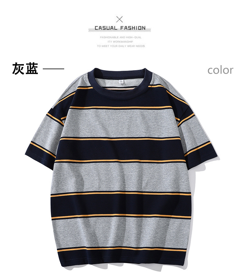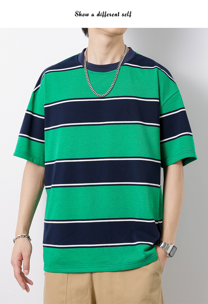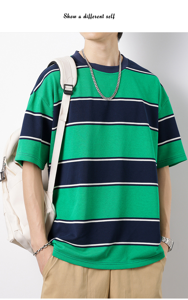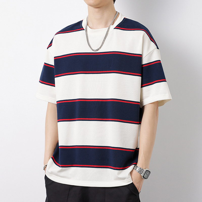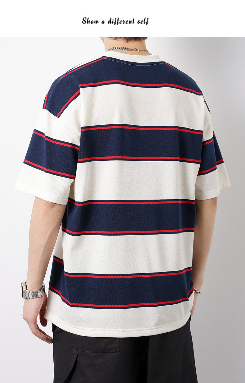 남자 티셔츠 일본식 새 줄무늬 옷 여름 헤비 라운드 넥 남자 느슨한 올 매치 캐주얼 쇼트 슬리브 남자스토어 가기