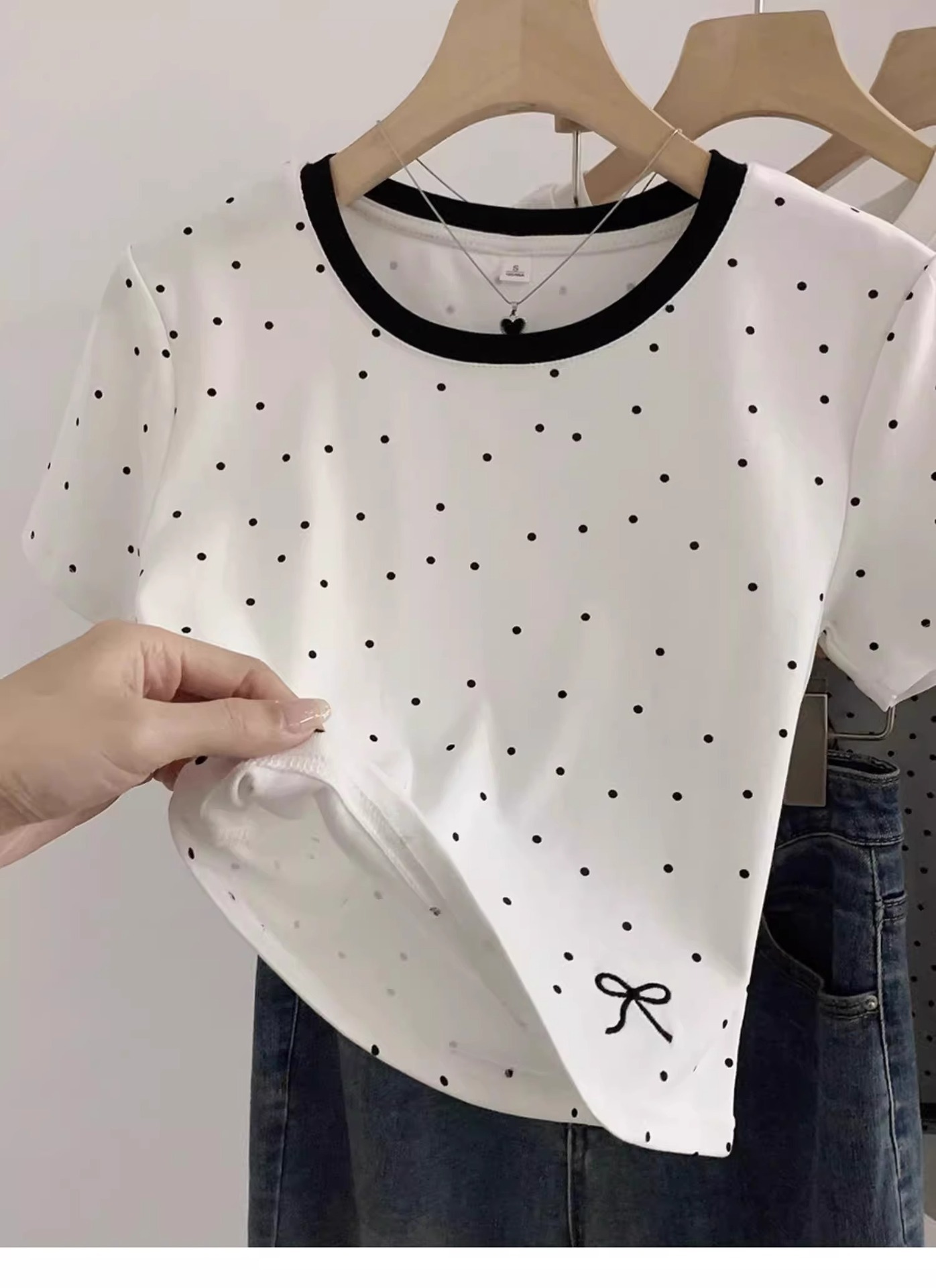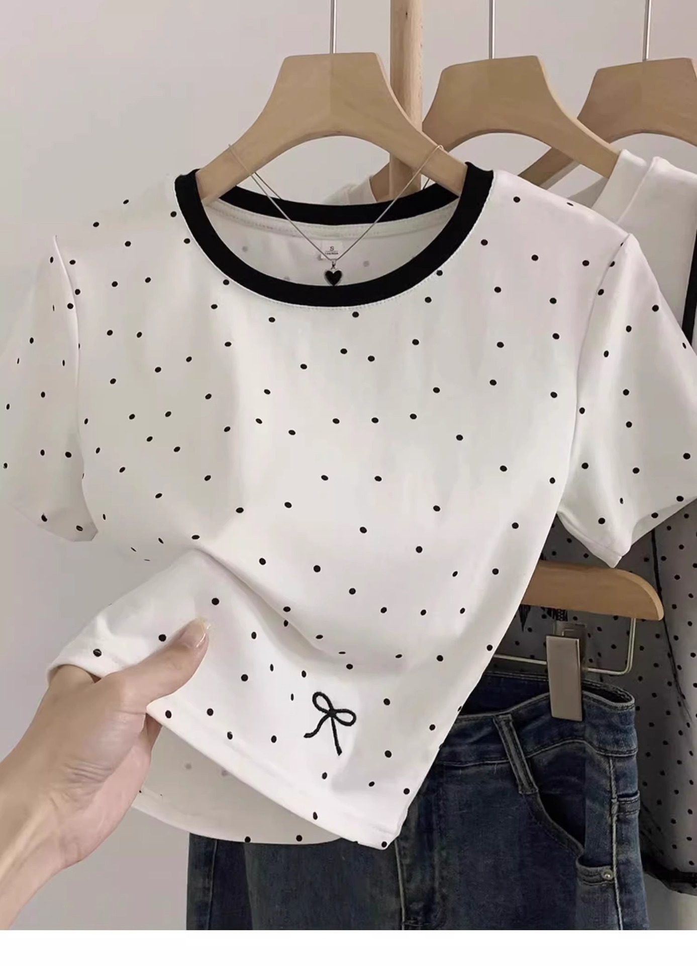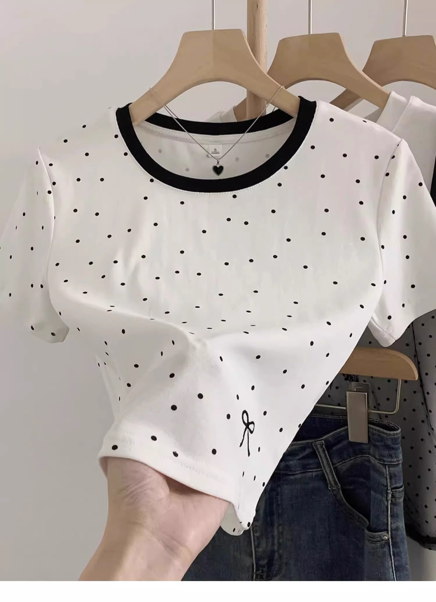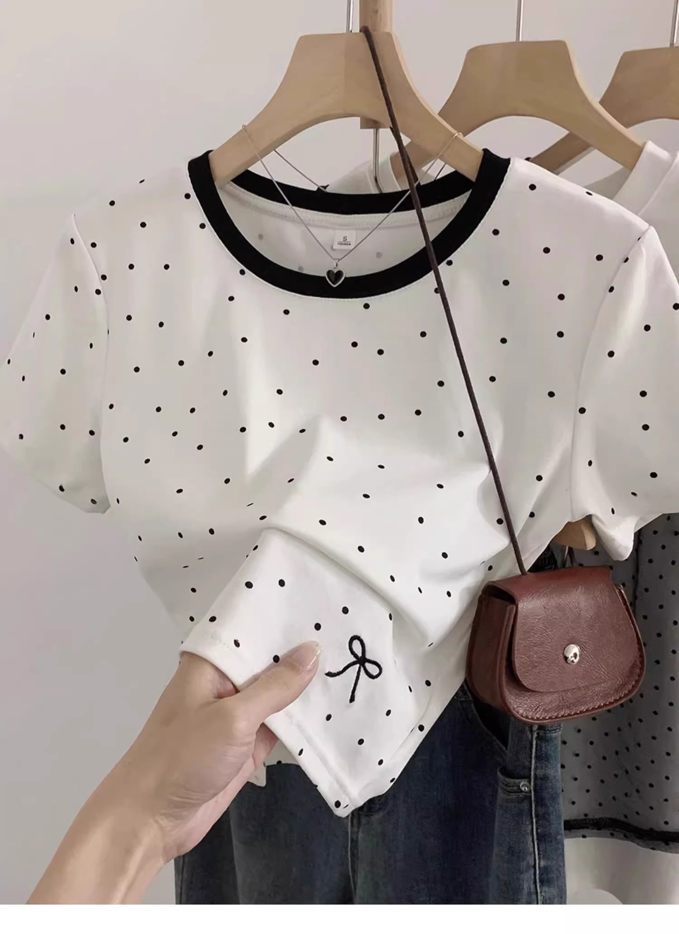 폴카 도트 라운드 넥 대비 색상 스티치 여성용 반팔 슬림 티셔츠 여름 신작 자수 짧은 오른쪽 어깨 셔츠스토어 가기