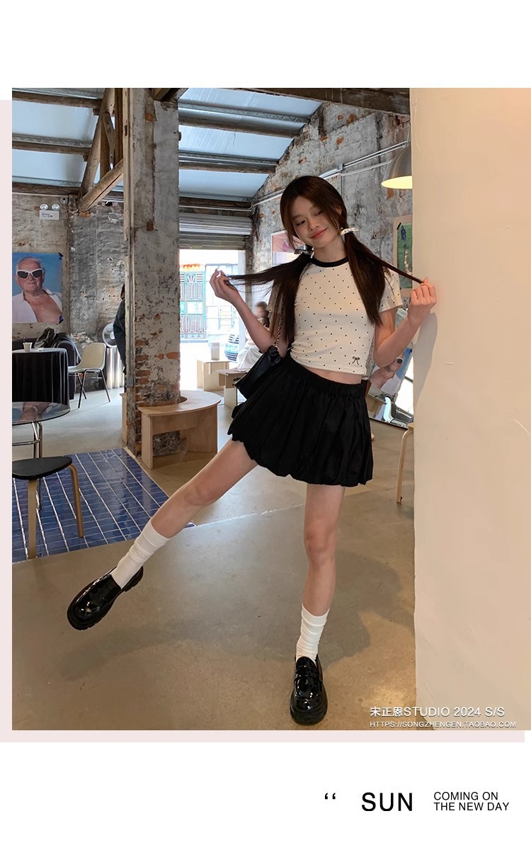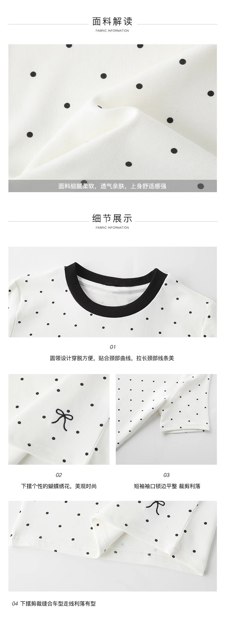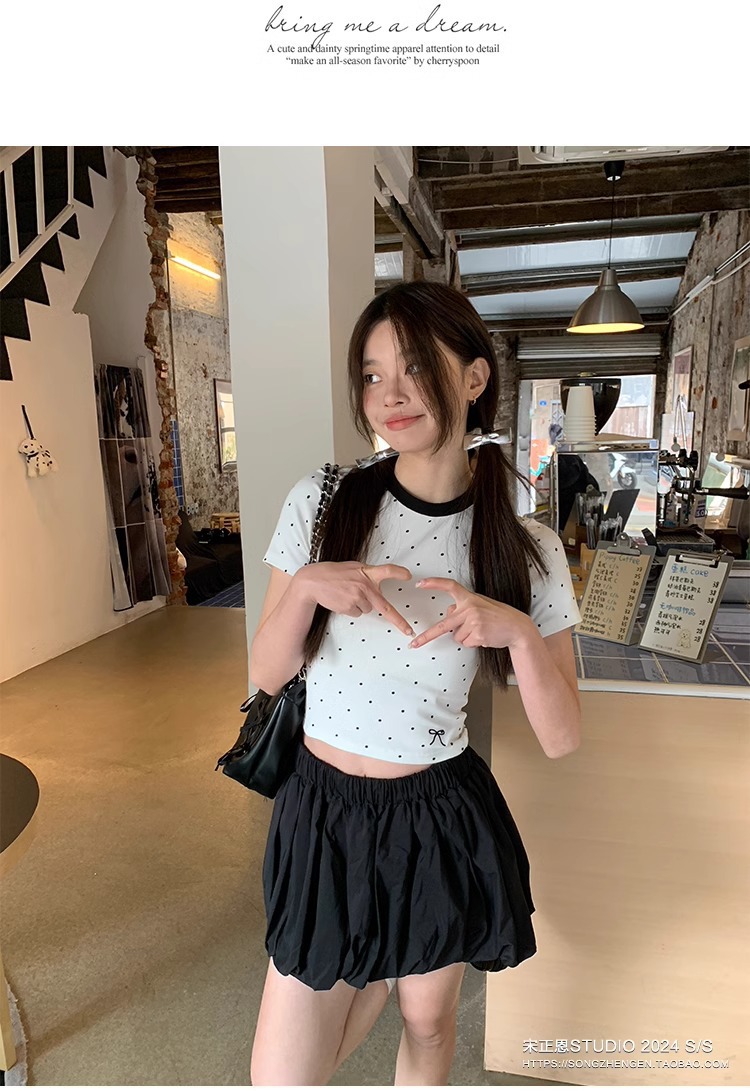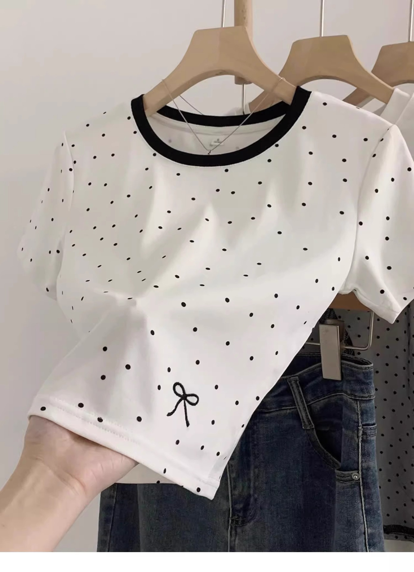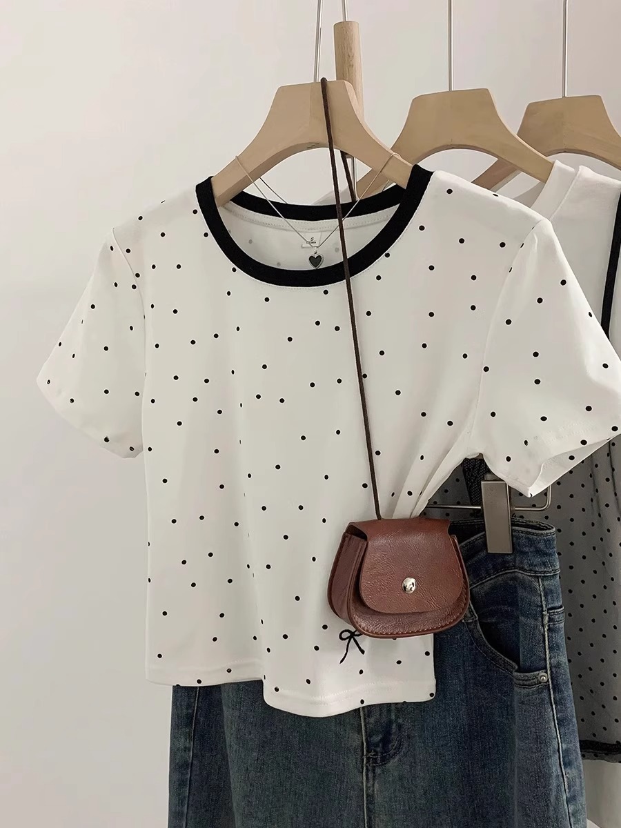 폴카 도트 라운드 넥 대비 색상 스티치 여성용 반팔 슬림 티셔츠 여름 신작 자수 짧은 오른쪽 어깨 셔츠스토어 가기