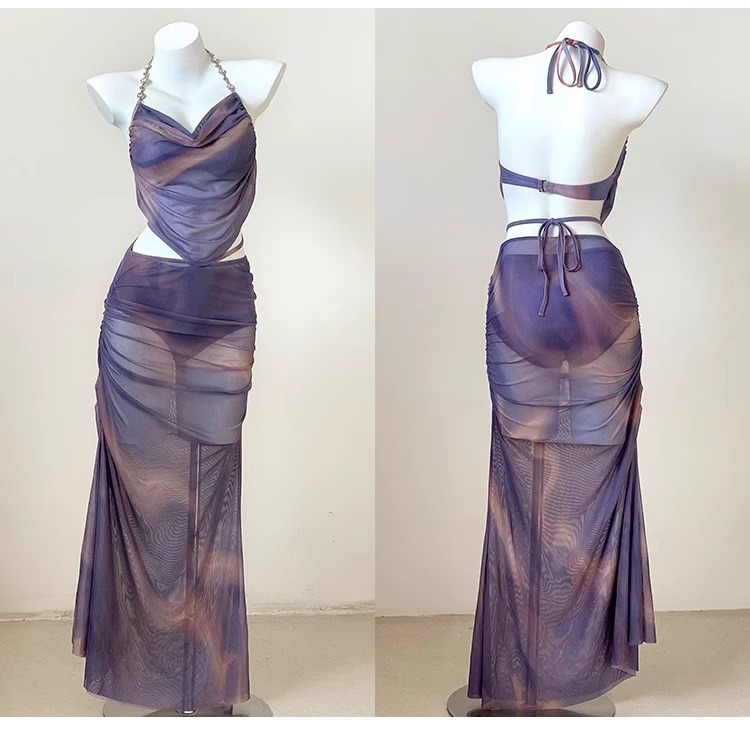 뜨거운 소녀 비키니 수영복 여성용 3 피스 세트 해변 휴일 긴 원피스 작은 가슴 수집 섹시한 온천 수영복 스틸 브래킷스토어 가기