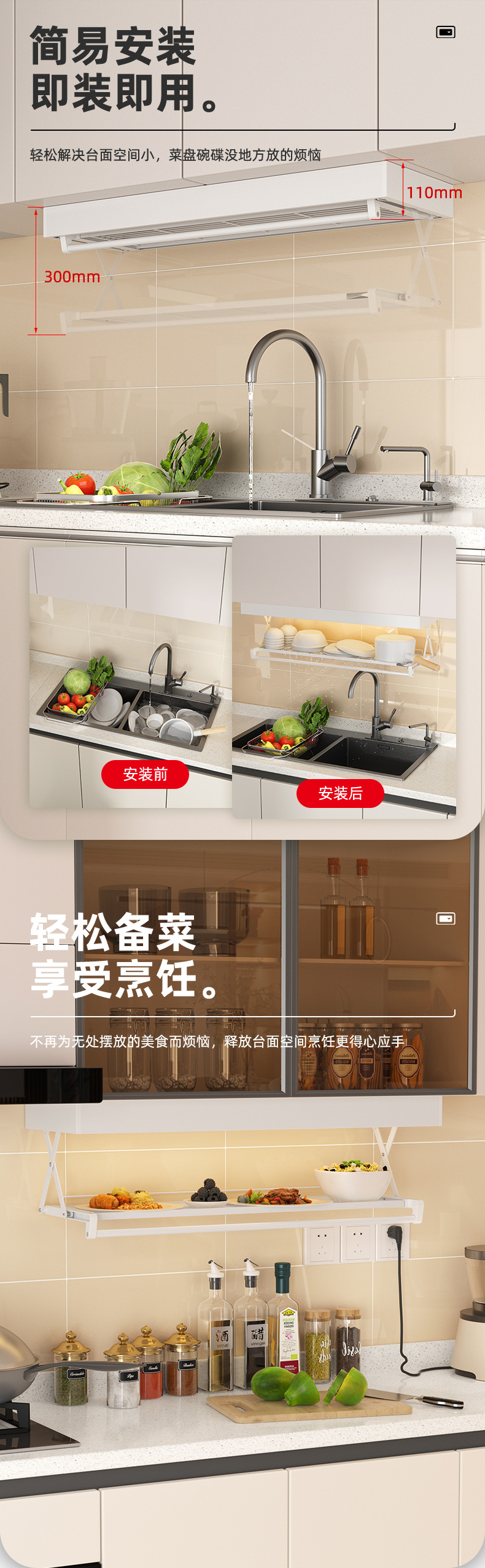 • 풀다운 확장 스토리지 랙 아이보리 화이트 900mm + 센서 라이트