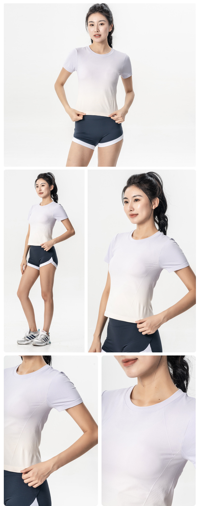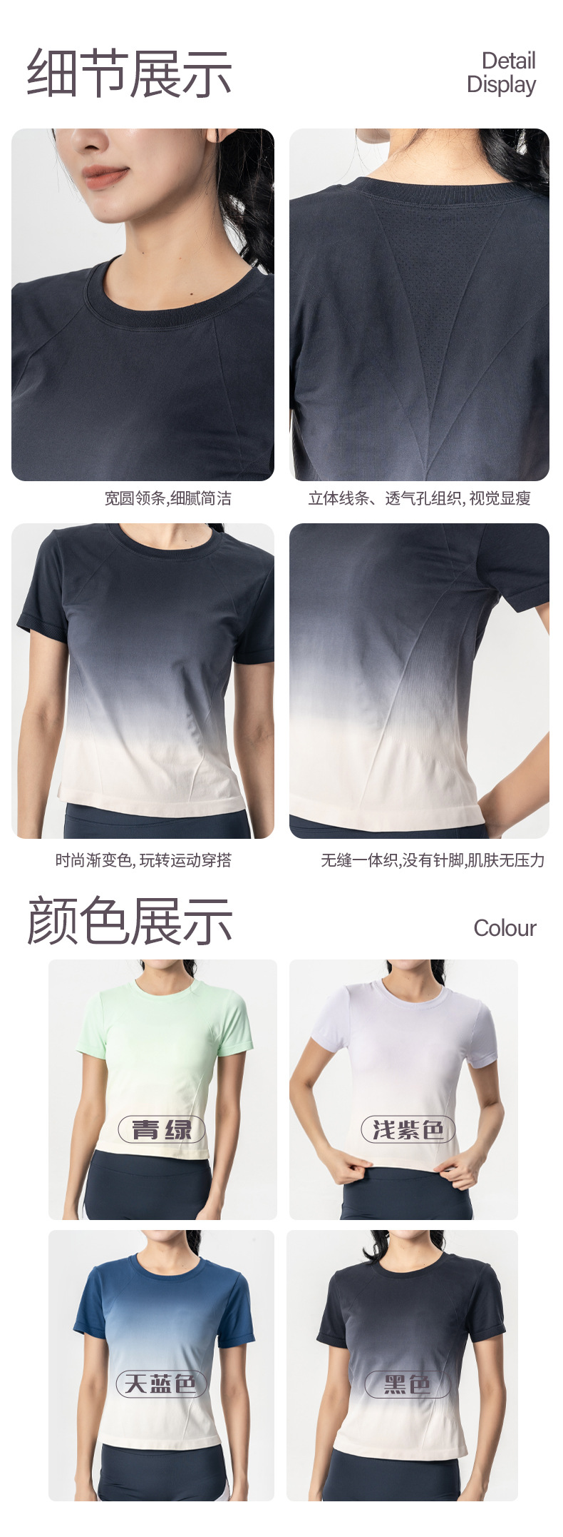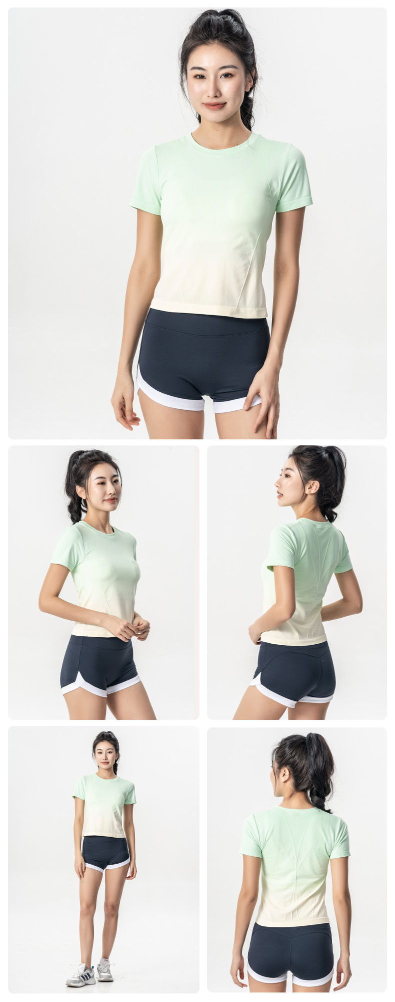 새로운 야외 피트니스 반팔 통기성 요가 세트 패션 그라디언트 색상 매칭 아우터웨어 운동복 땀 흡수 스포츠 탑스토어 가기