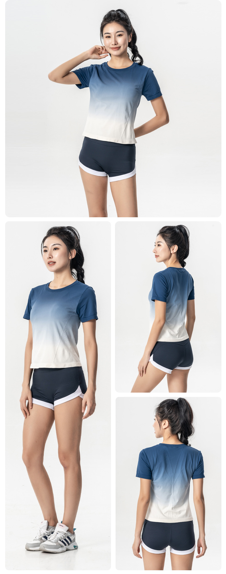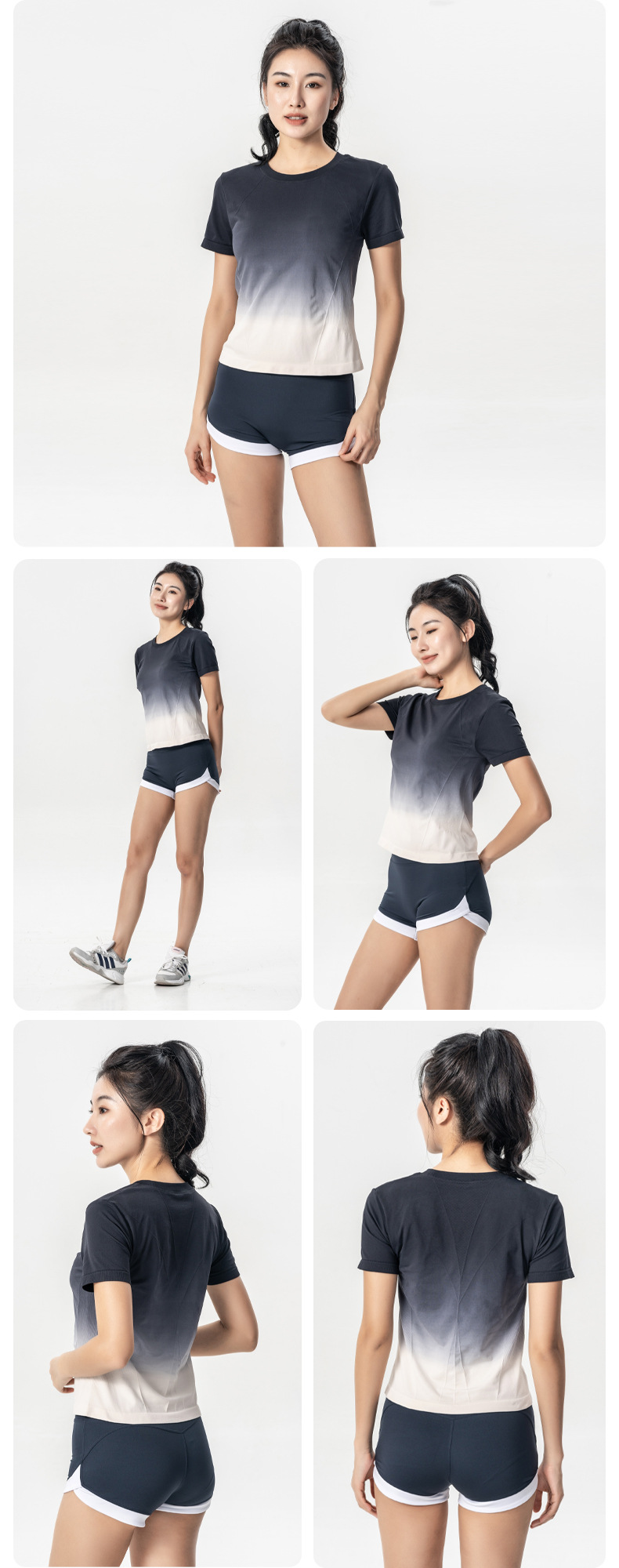 새로운 야외 피트니스 반팔 통기성 요가 세트 패션 그라디언트 색상 매칭 아우터웨어 운동복 땀 흡수 스포츠 탑