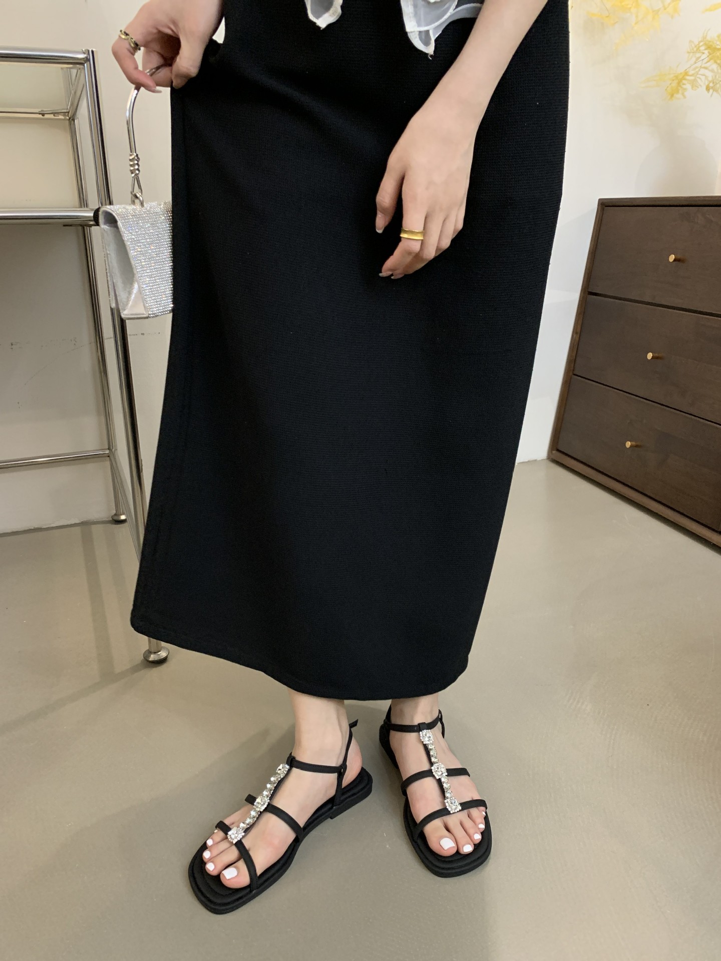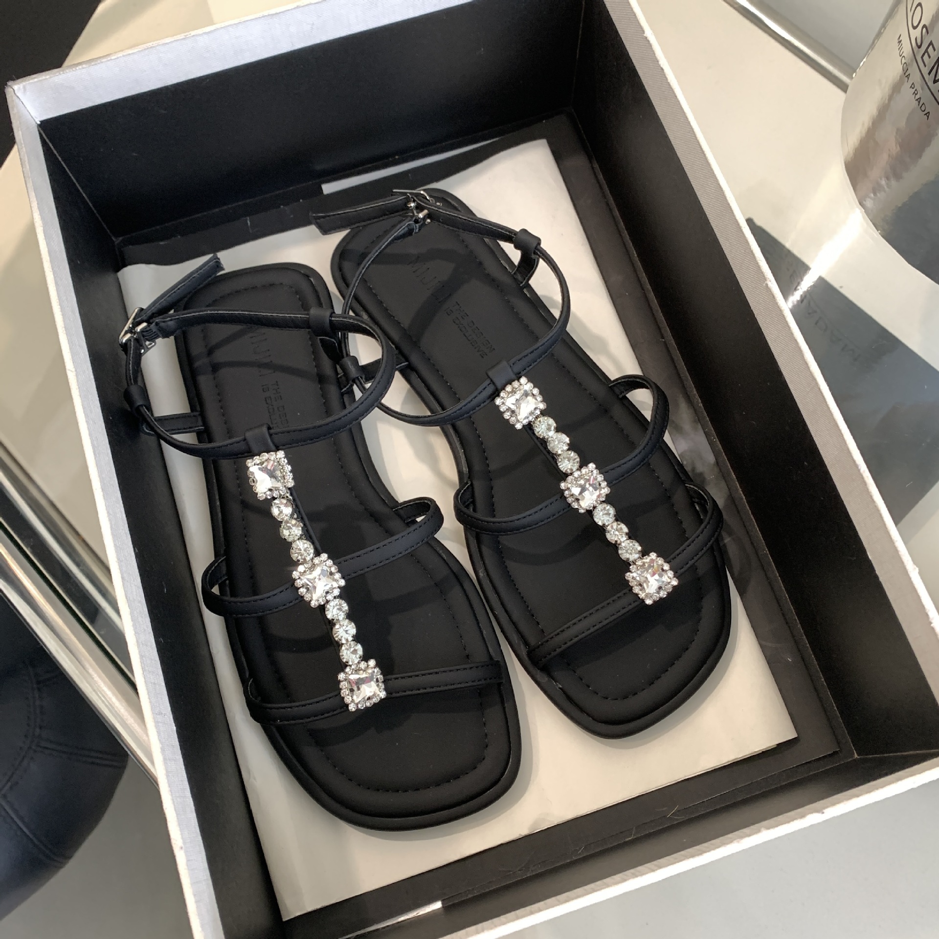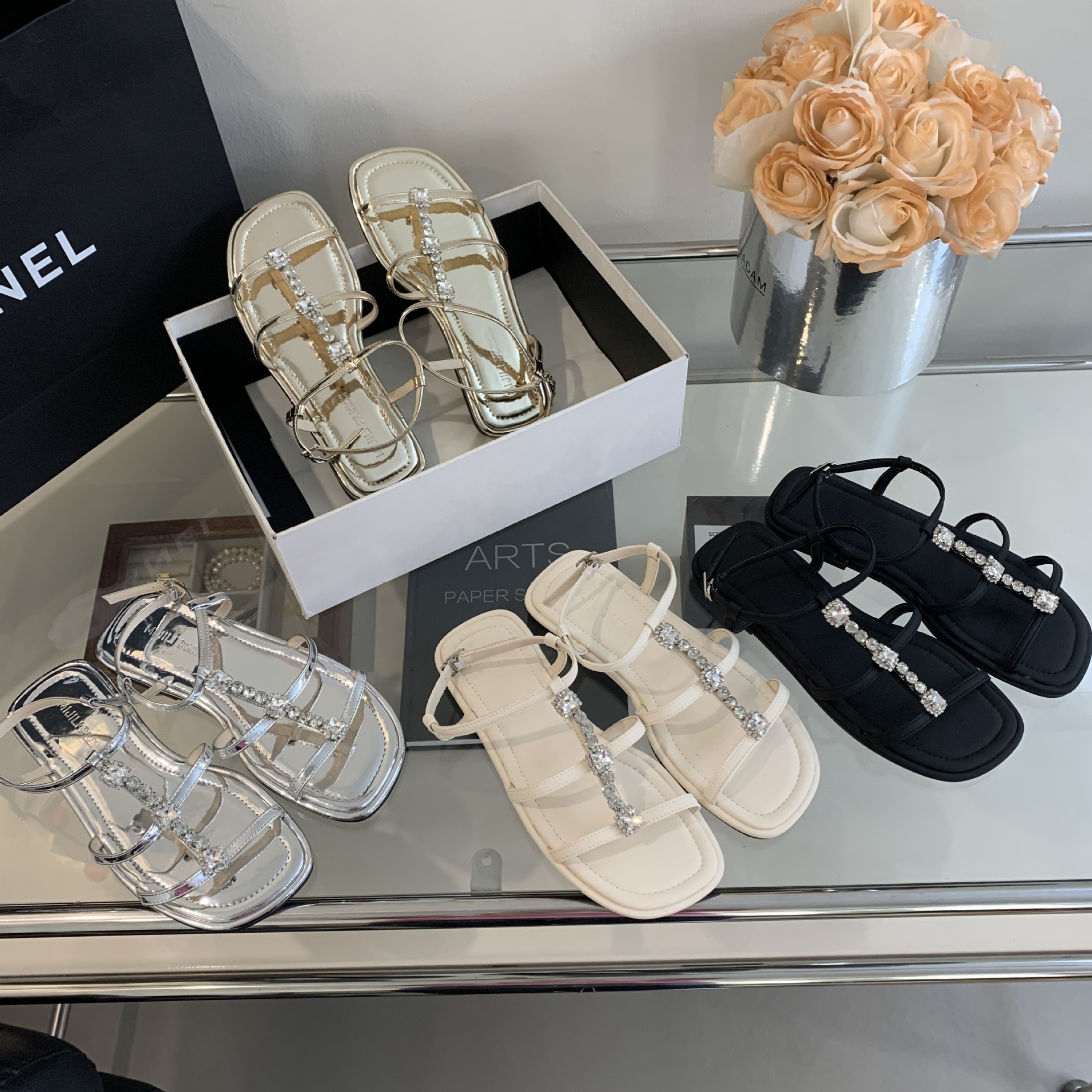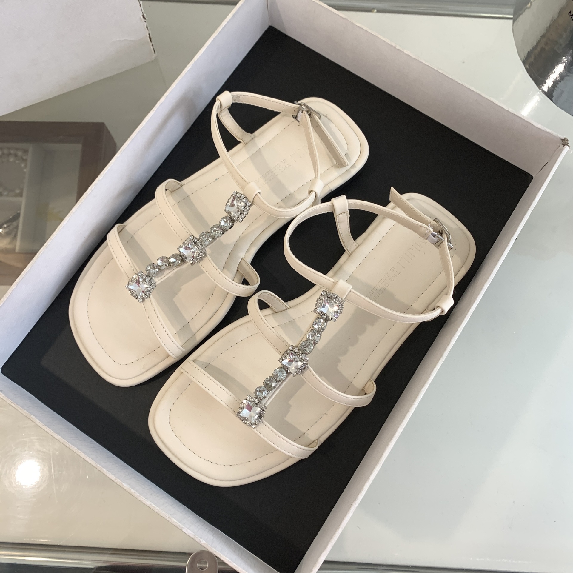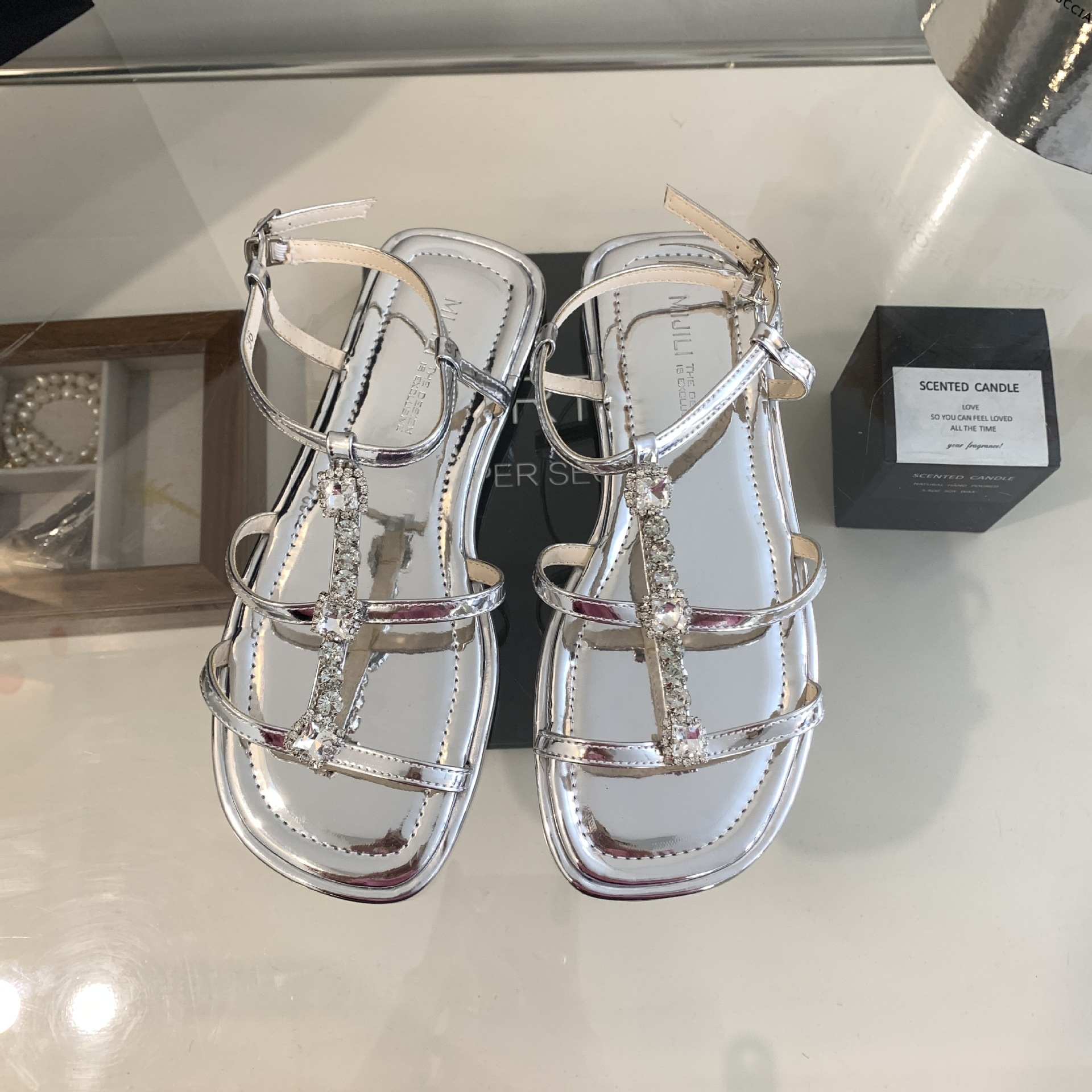 라인스톤 버클 스트랩 샌들 여자 오픈 발가락 2024 새로운 여름 플랫 비치 실버 로마 신발 여성스토어 가기