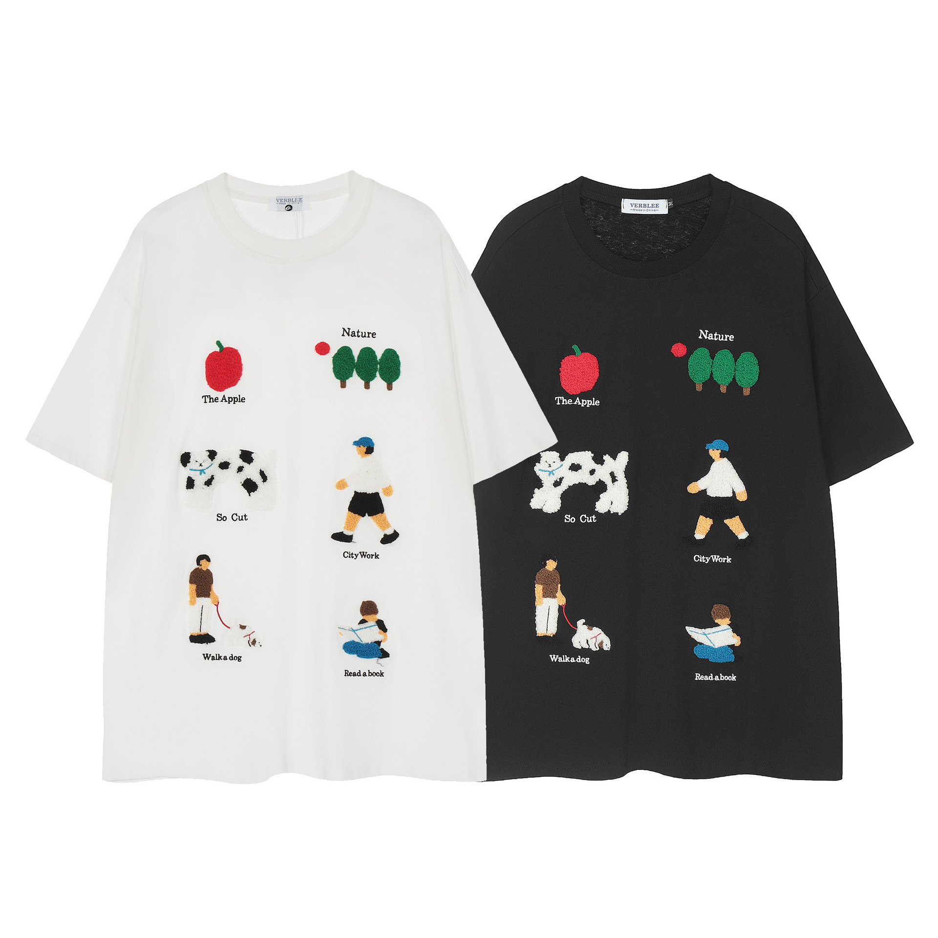 스트리트 트렌디 한 3 차원 수건 수 놓은 짧은 t 하프 슬리브 탑 남성과 여성의 느슨한 연인 미국 패션 브랜드 반팔 티셔츠
