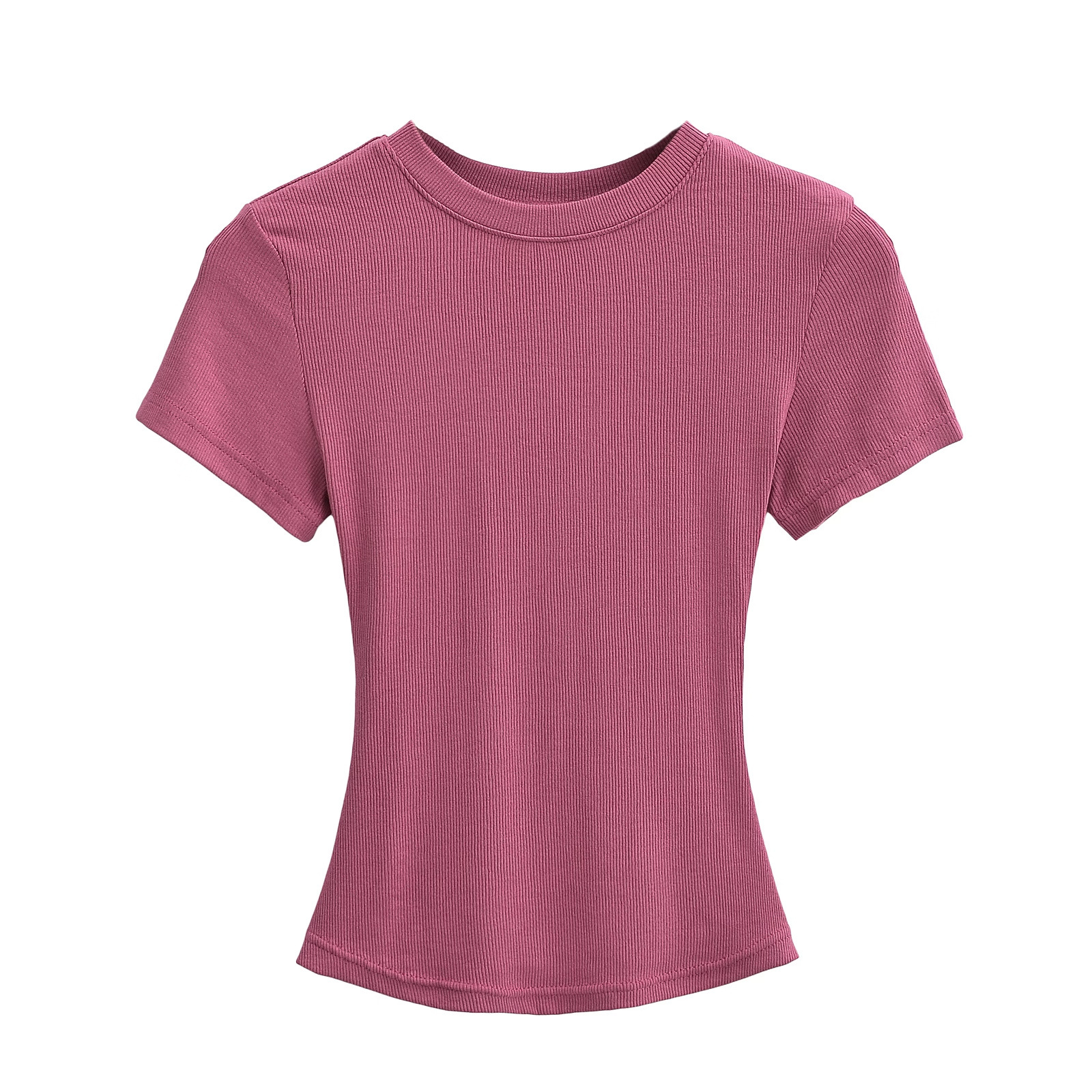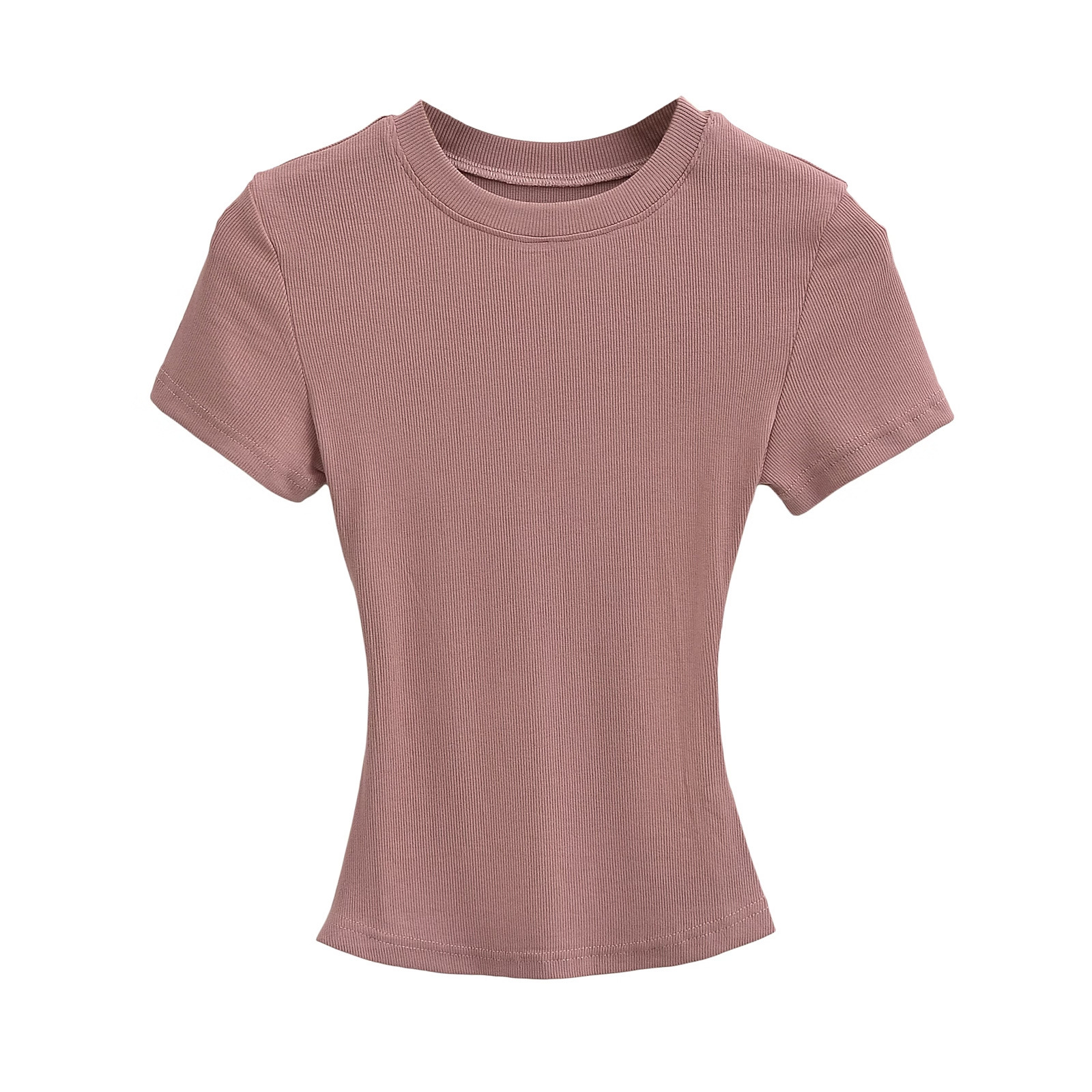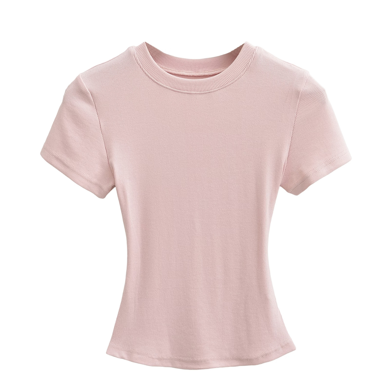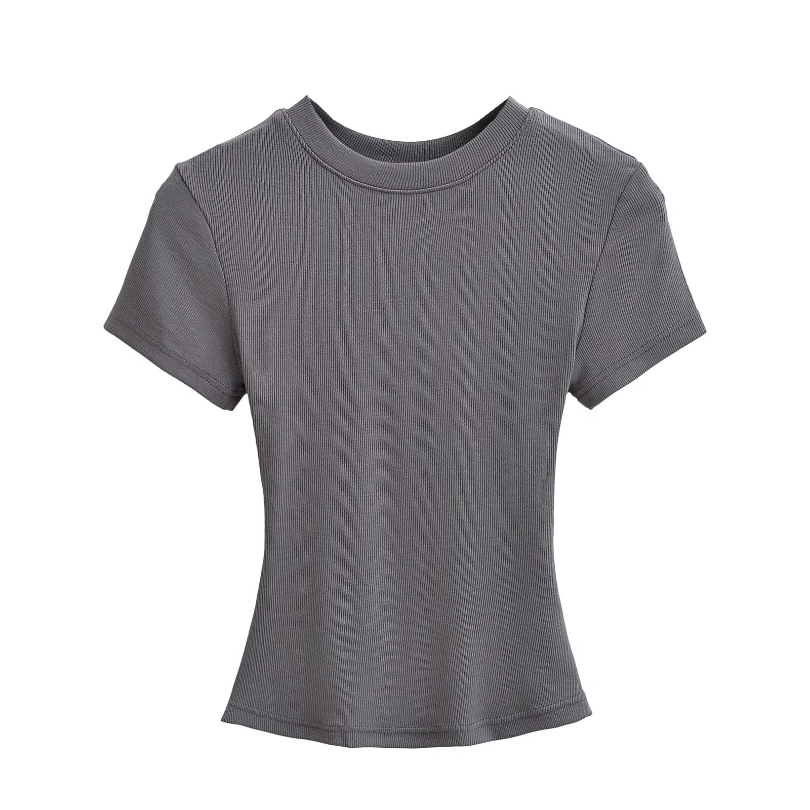 유럽과 미국의 카다시안 스타일 섹시한 작은 둥근 목 반팔 티셔츠 여성의 2024 여름 스킴 단색 기본 스레드 탑