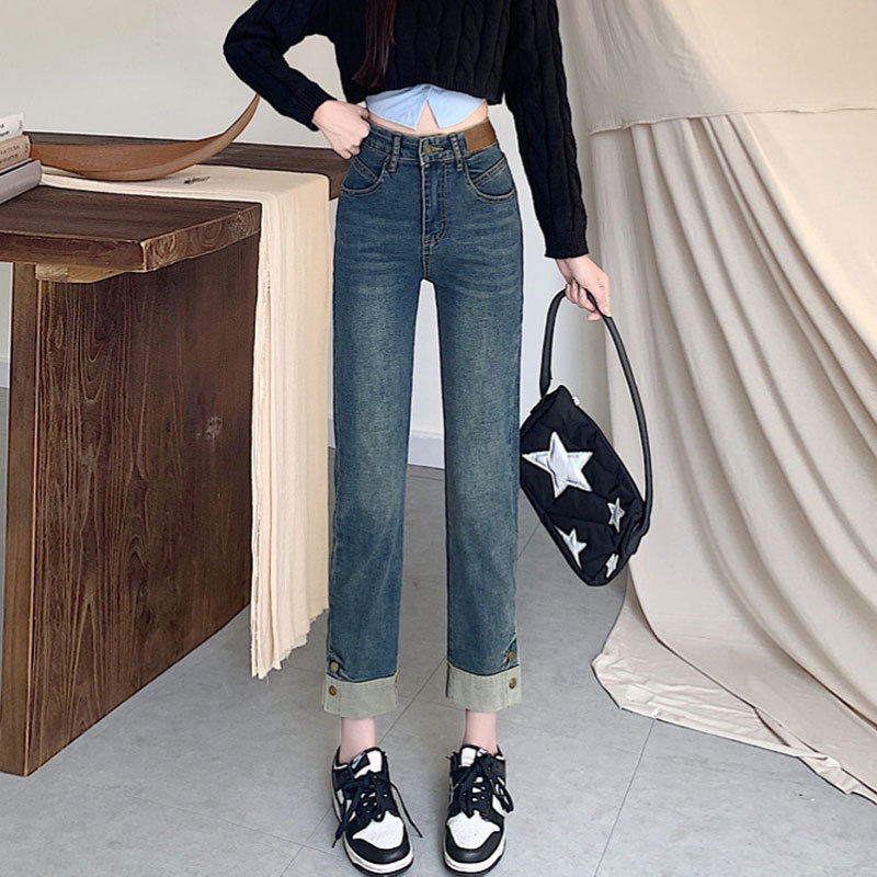 배 모양의 스트레이트 청바지 여성의 새로운 슬림 핏 스트레치 스티칭 디자인 가죽 라벨 높은 허리 자른 빈티지 연기 튜브 바지