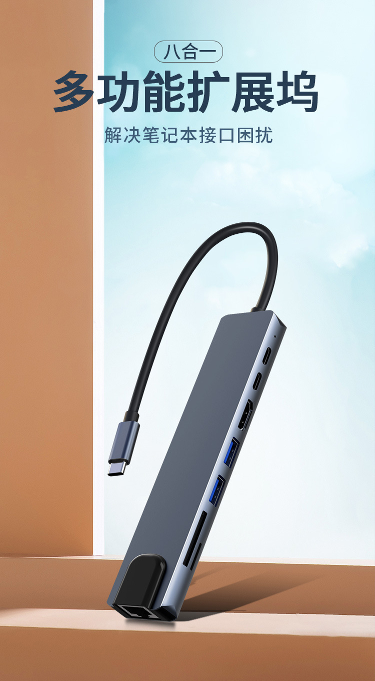 국경 간 8-in-1 Typec 확장 도크 HD HD 컴퓨터 도킹 스테이션 네트워크 포트 허브 USB 허브 분배기