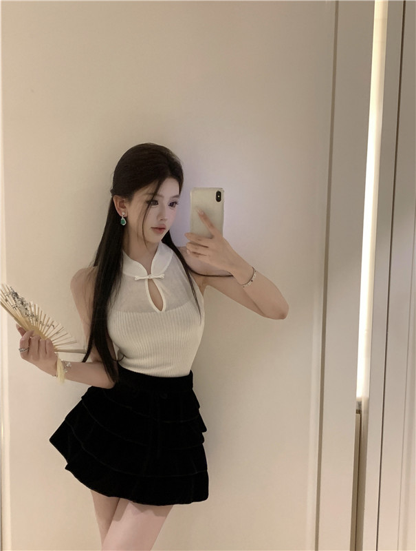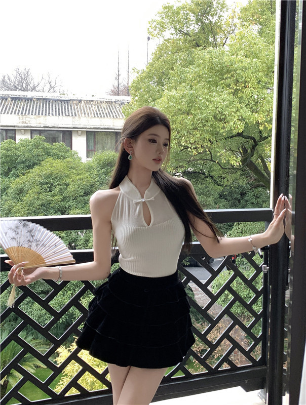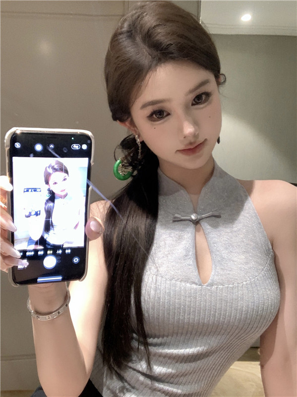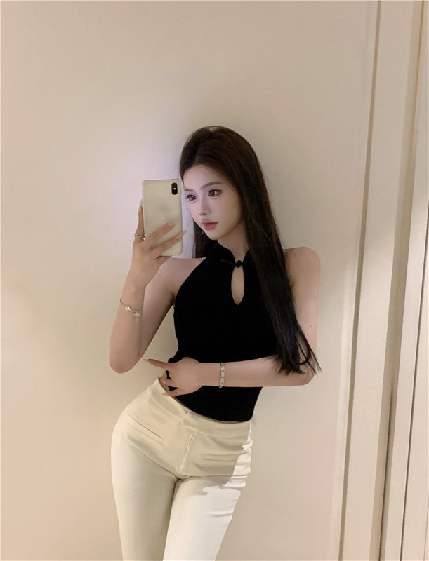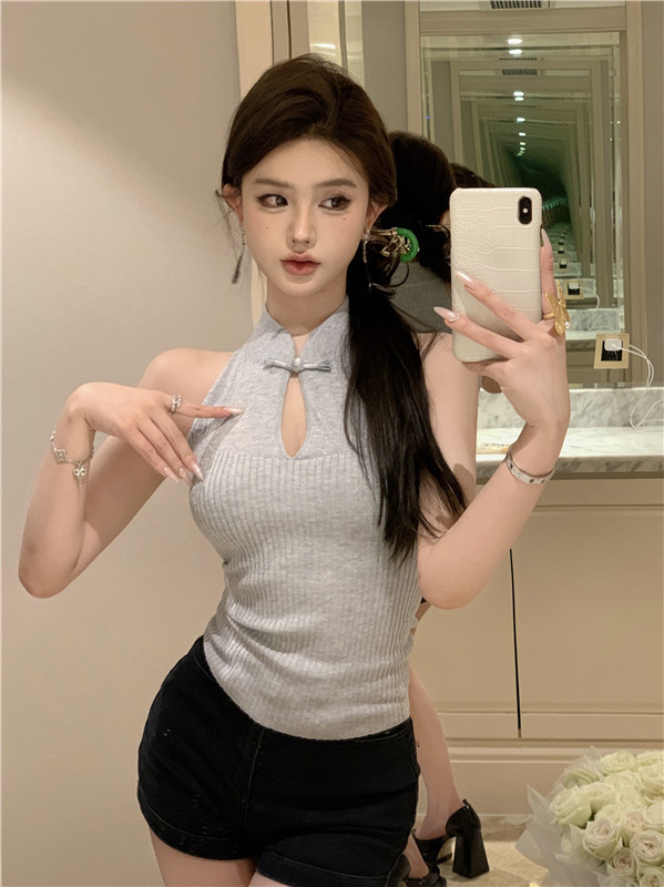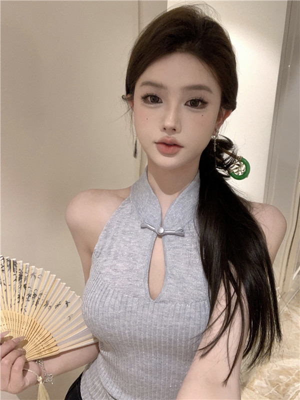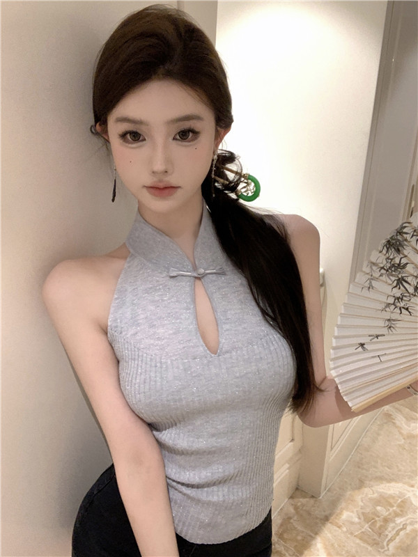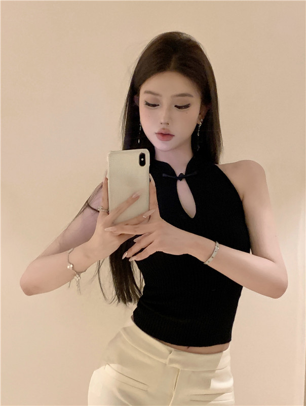 새로운 중국 스타일 코팅 할로우 교수형 목 민소매 니트 조끼 여성 여름 스파이스 소녀 슬림 핏 이너 궈펑 탑스토어 가기