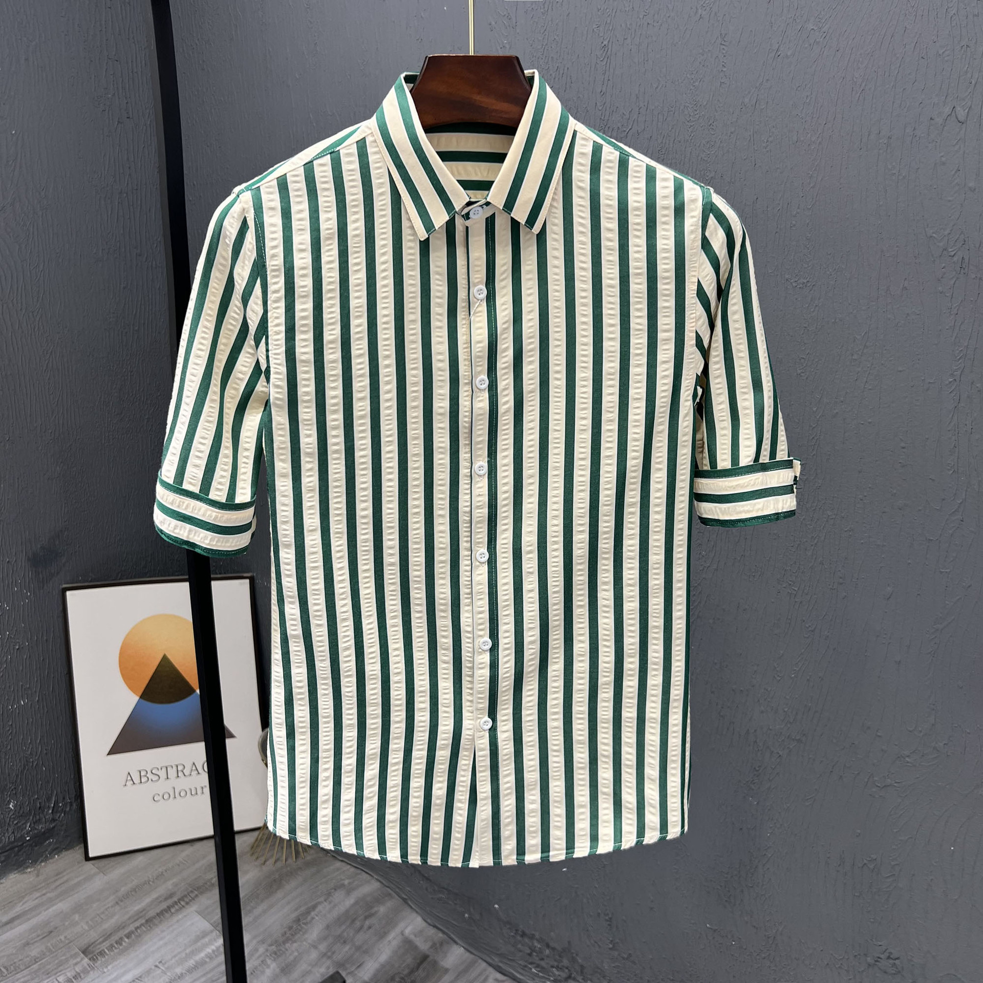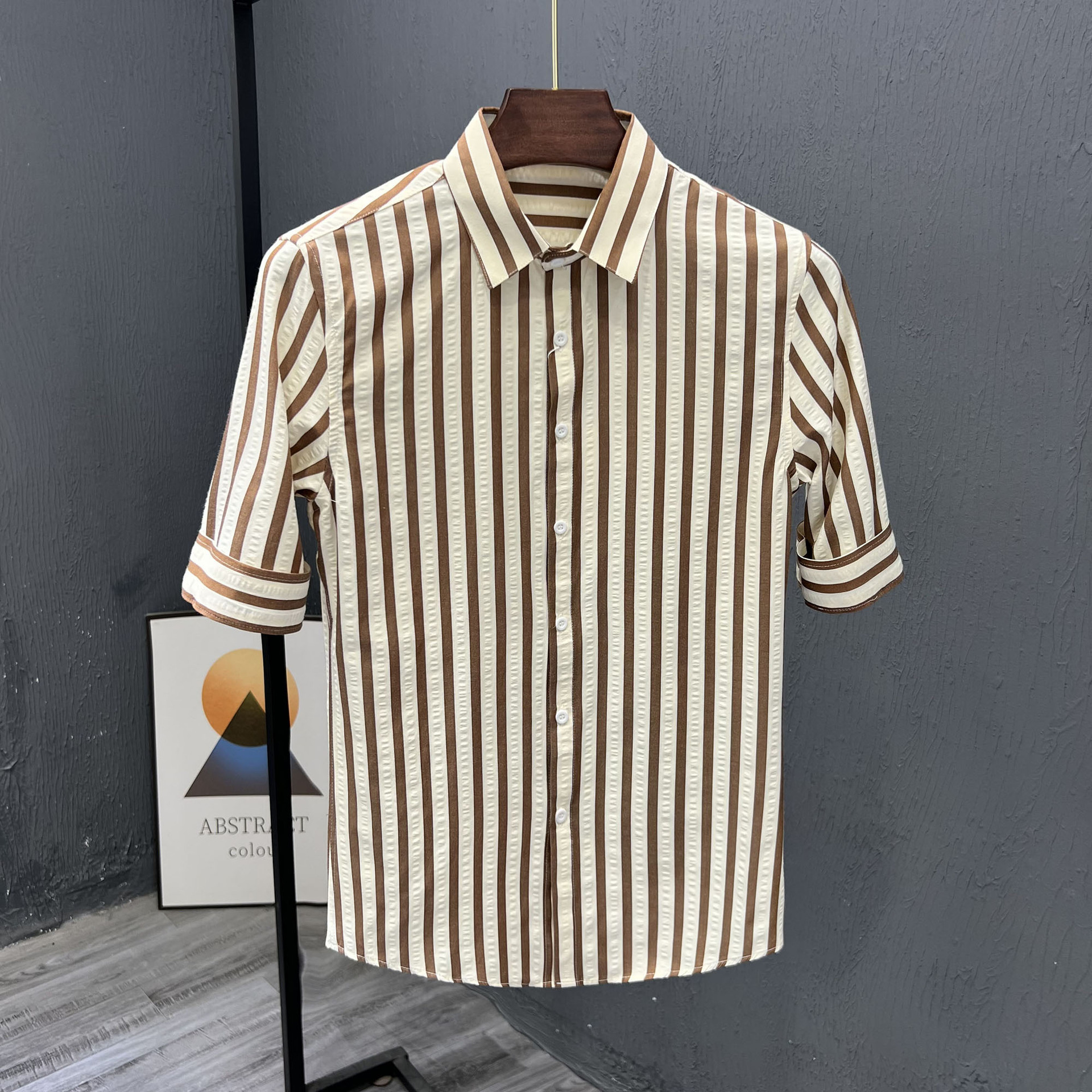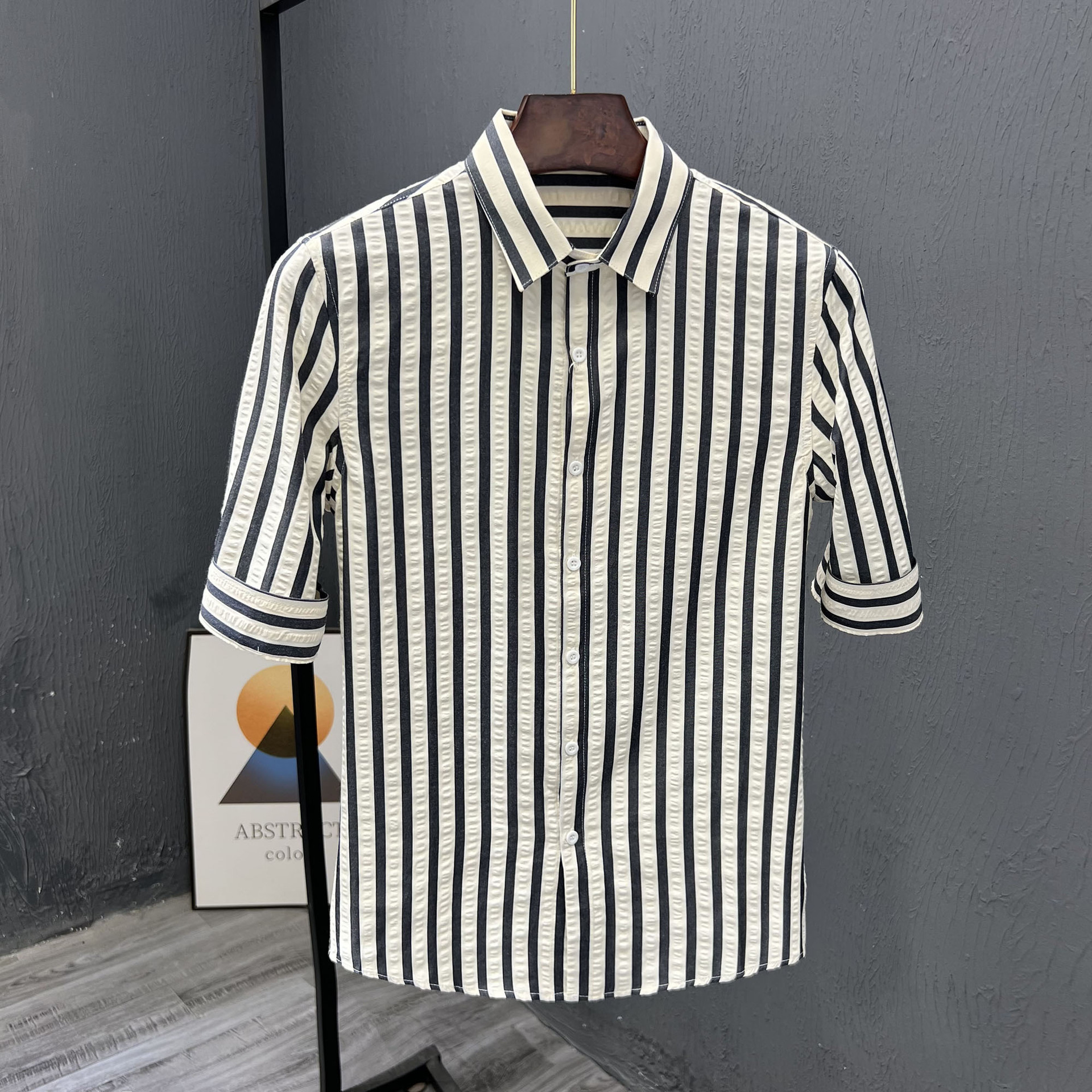여름 감각 남성 줄무늬 슬림 핏 반팔 셔츠 트렌디 얇은 캐주얼 반팔 셔츠 남성용 셔츠 새로운 스타일