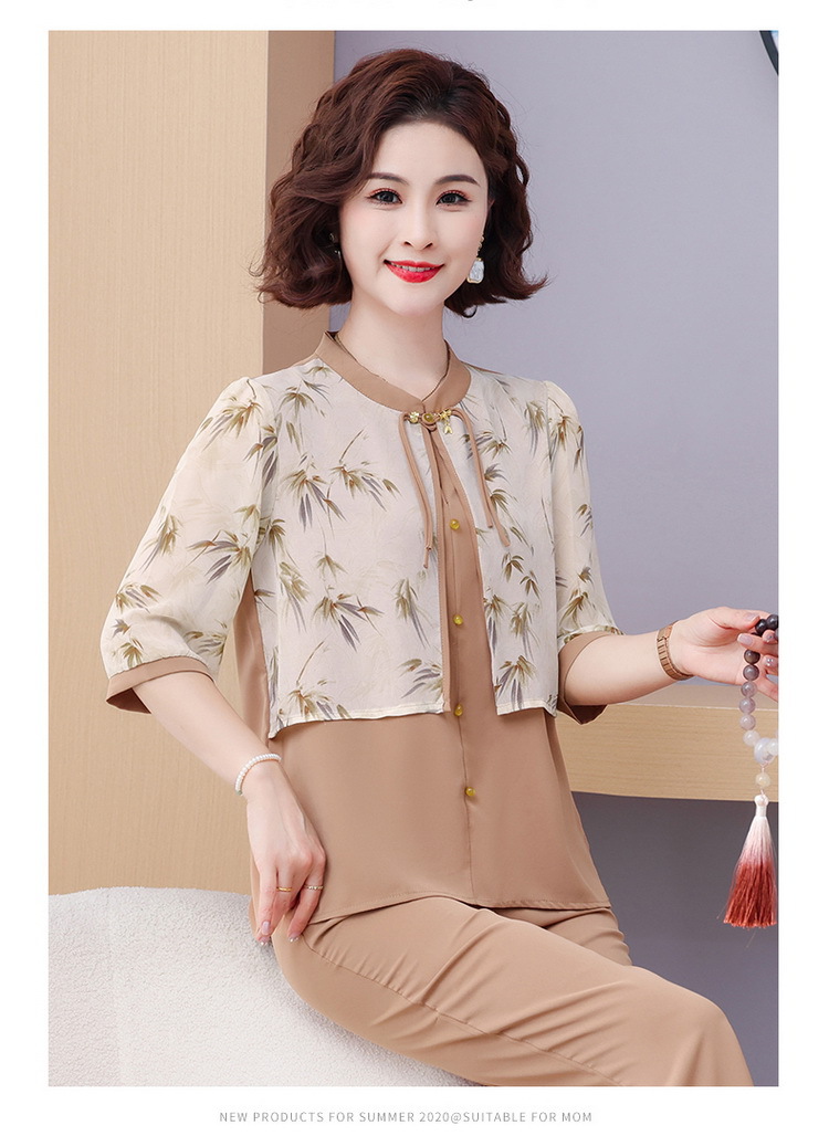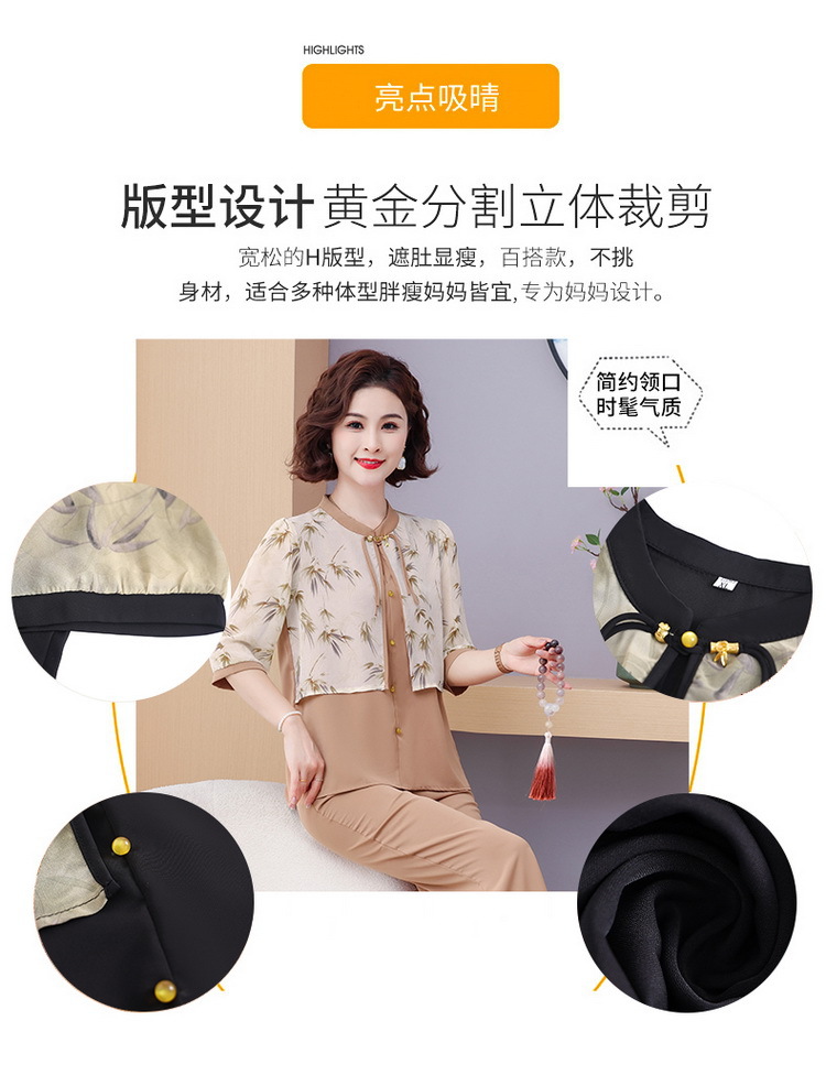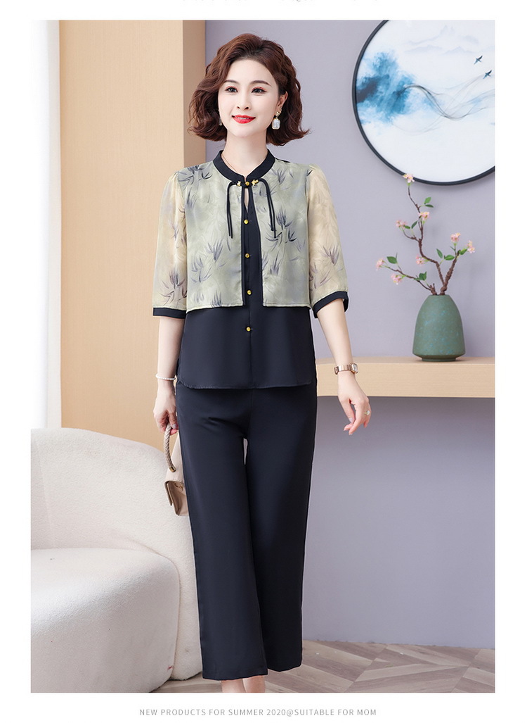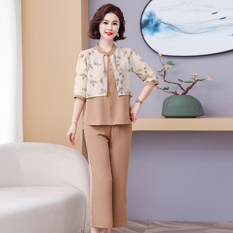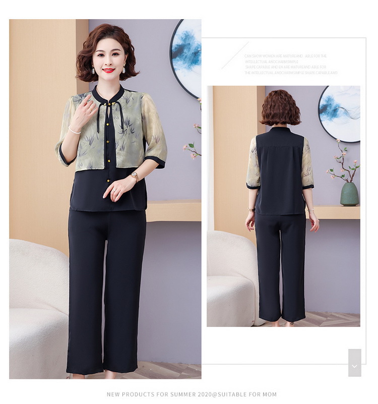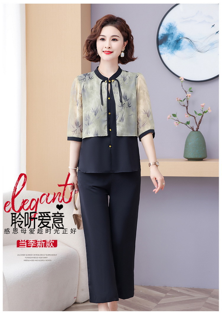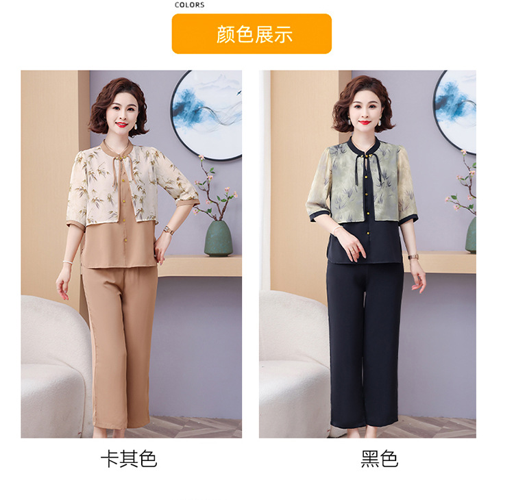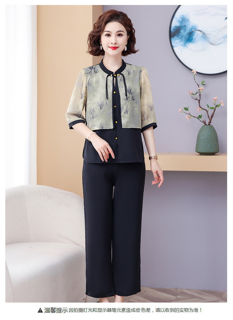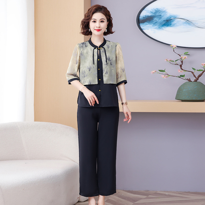 어머니 여름 원피스 세트 중국 여성 중국 스타일 쉬폰 셔츠 2024 새로운 봄과 여름 중년 및 노인을위한 7 점 슬리브 탑