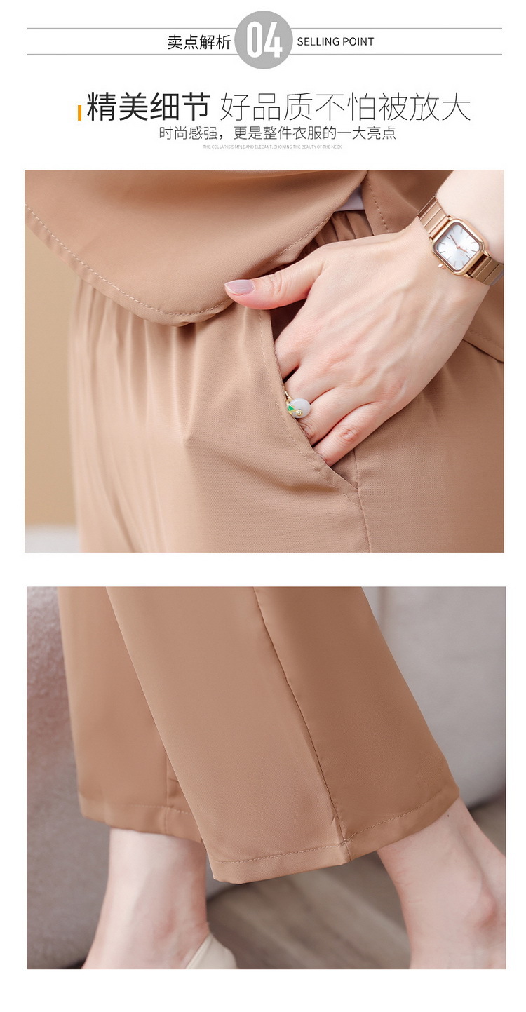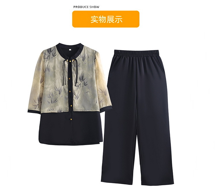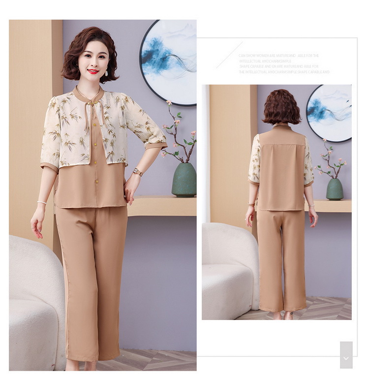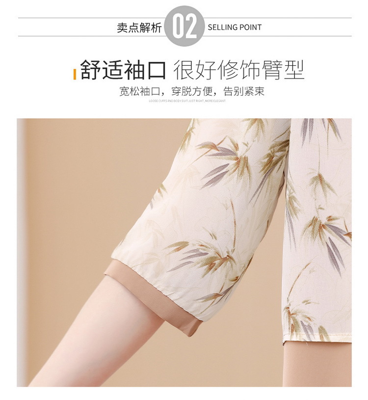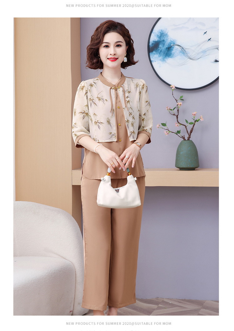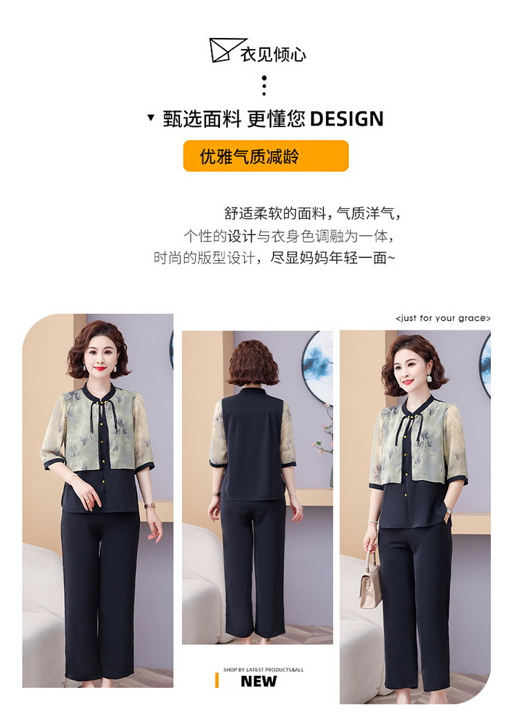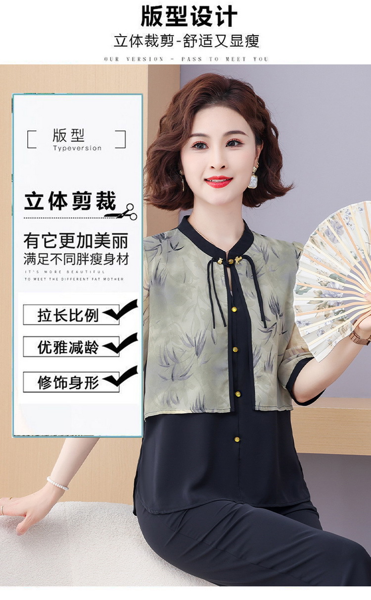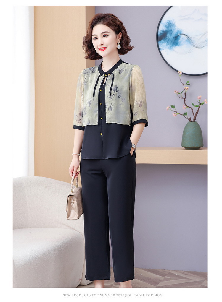 어머니 여름 원피스 세트 중국 여성 중국 스타일 쉬폰 셔츠 2024 새로운 봄과 여름 중년 및 노인을위한 7 점 슬리브 탑