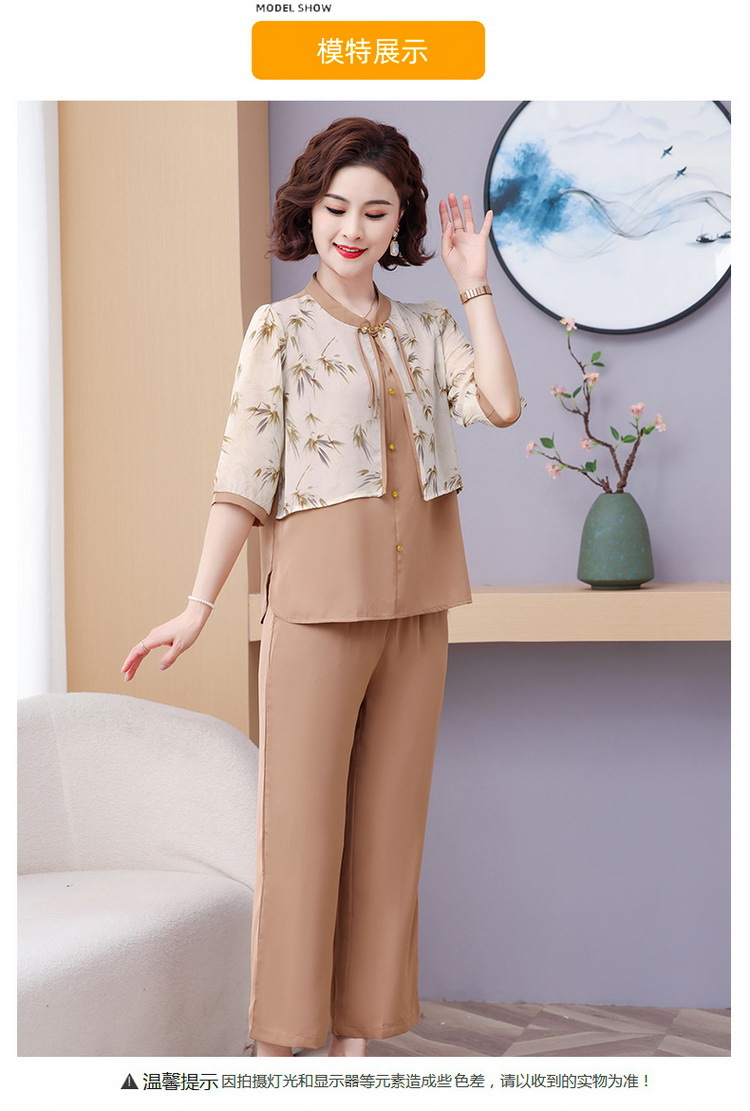 어머니 여름 원피스 세트 중국 여성 중국 스타일 쉬폰 셔츠 2024 새로운 봄과 여름 중년 및 노인을위한 7 점 슬리브 탑스토어 가기