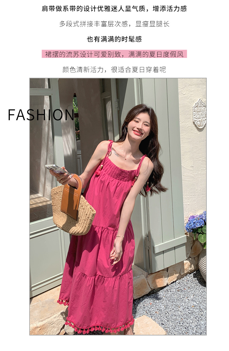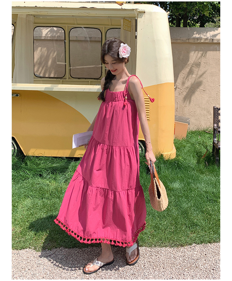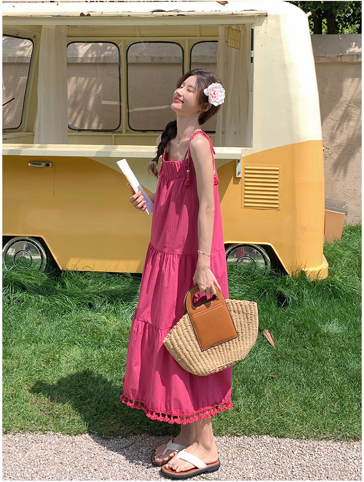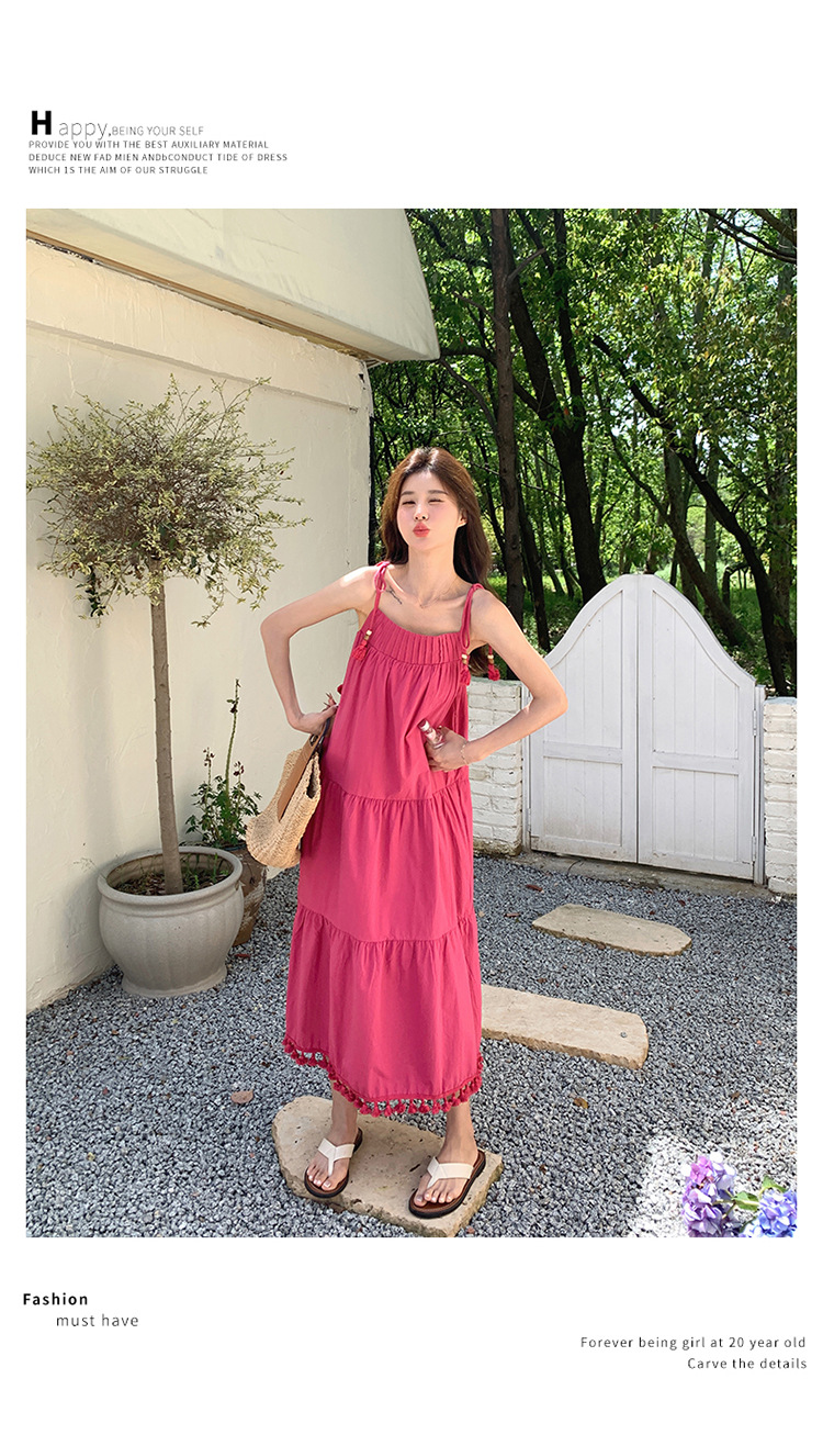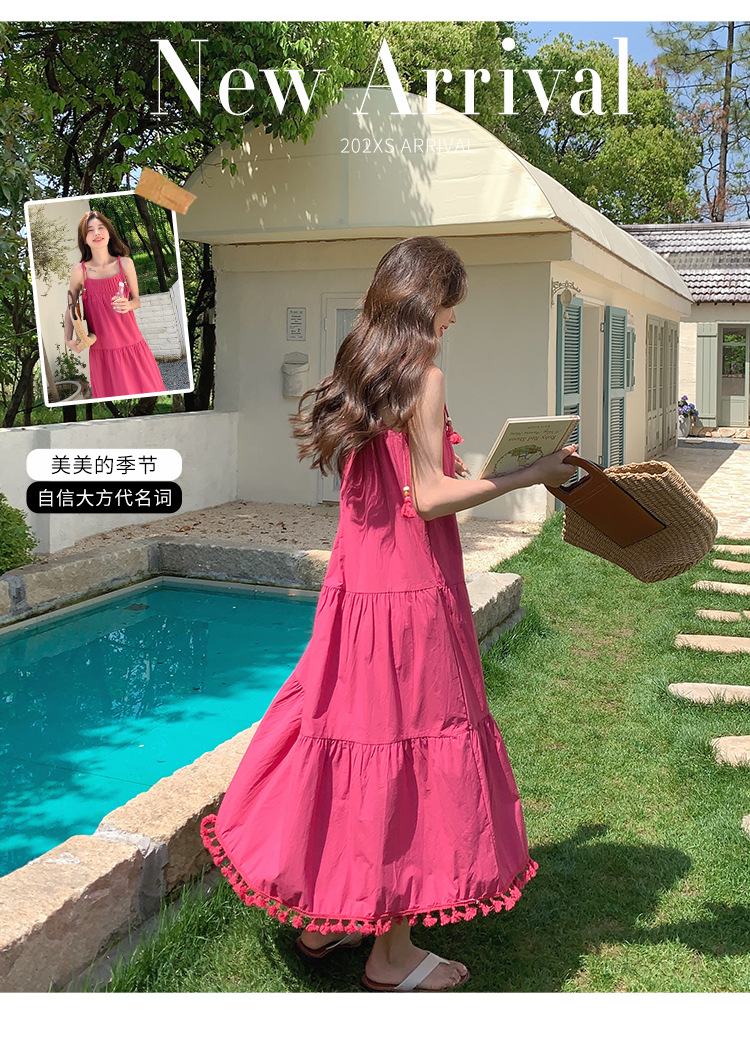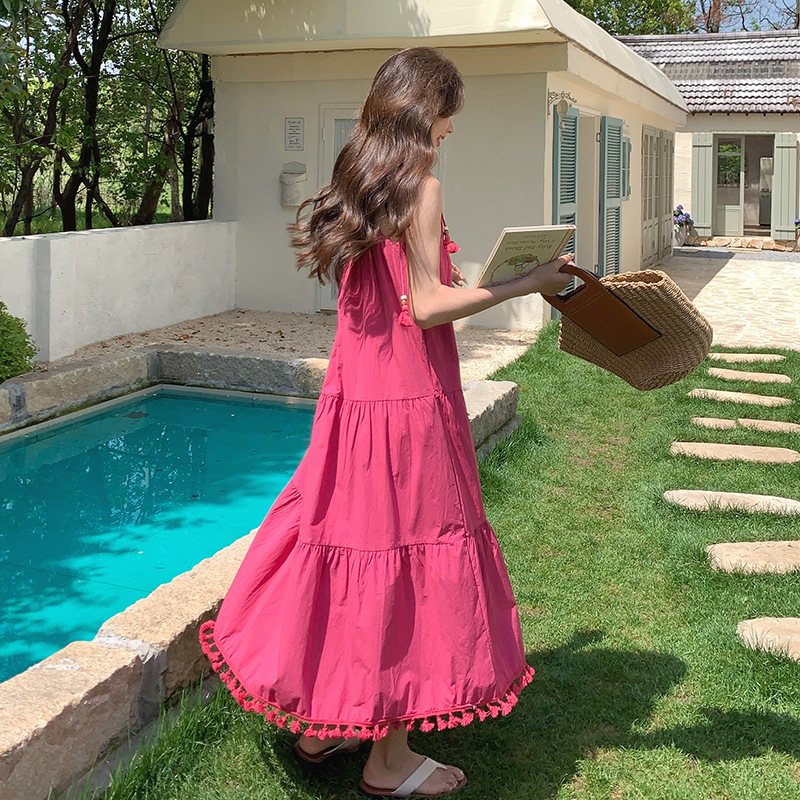 2024 여름 새로운 느슨한 슬리밍 캐주얼 긴 치마를 원피스 휴가 스타일 레드 스티칭 술 슬립 스커트
