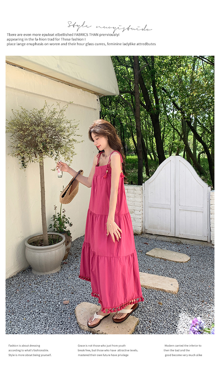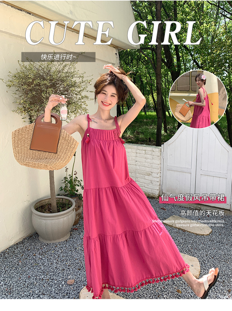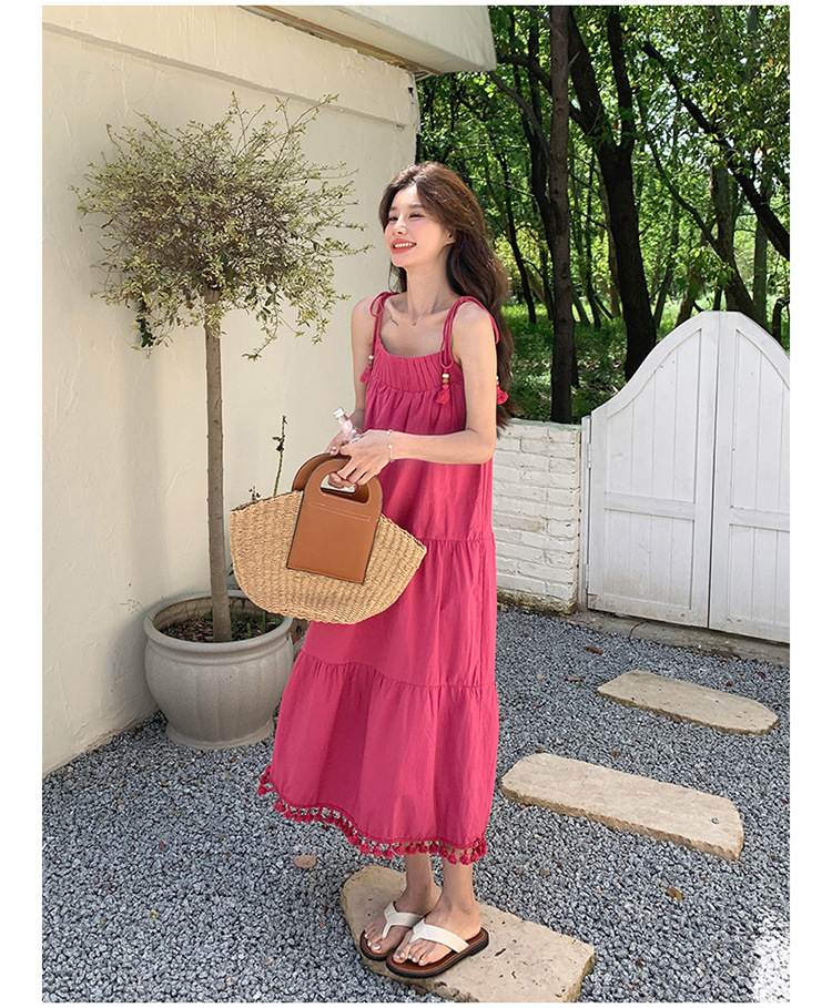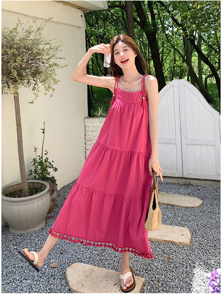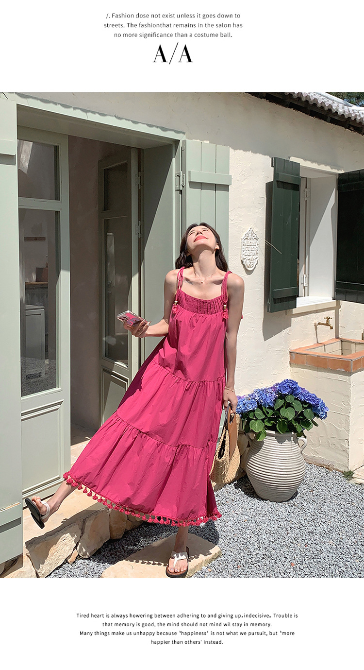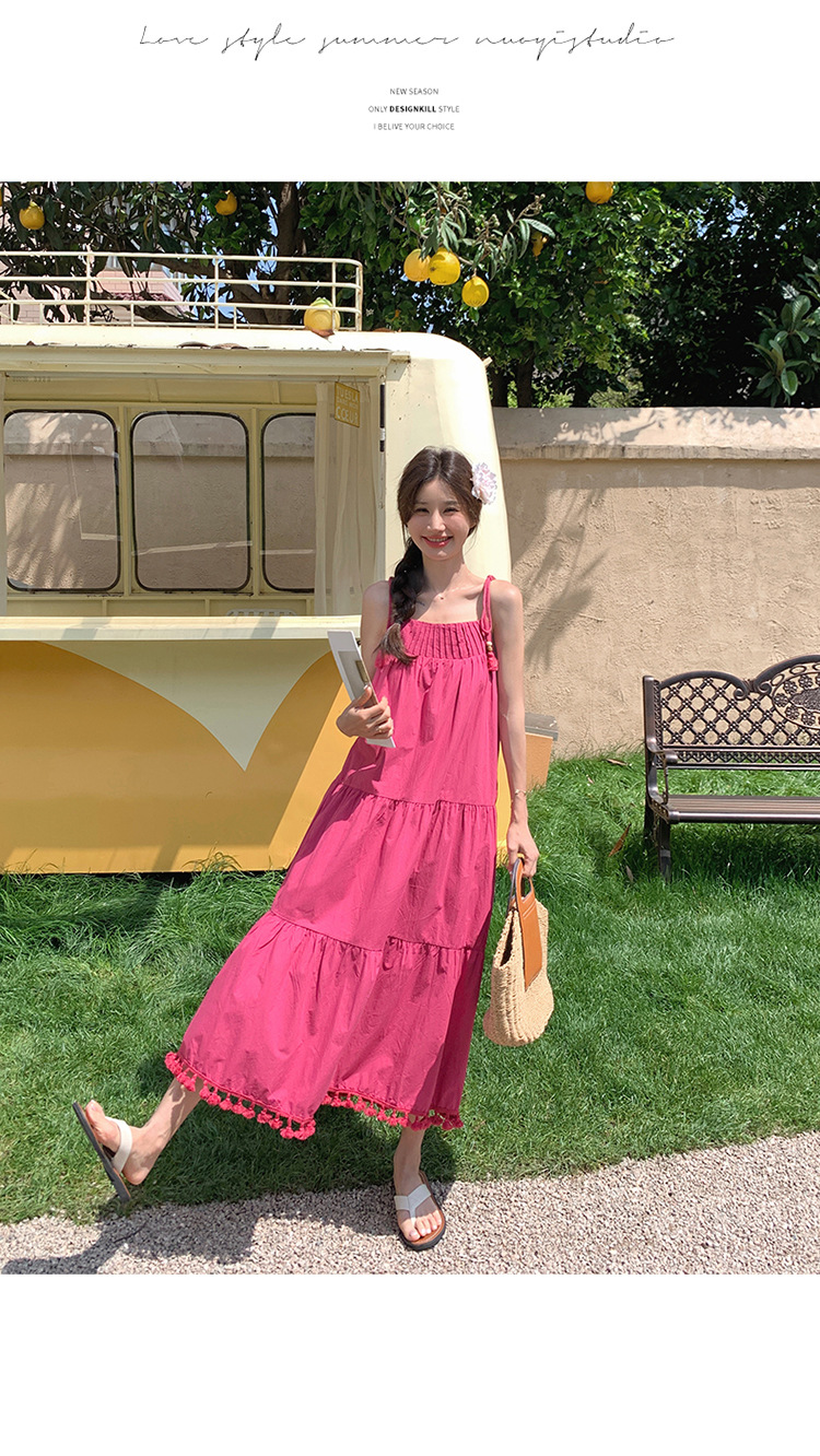 2024 여름 새로운 느슨한 슬리밍 캐주얼 긴 치마를 원피스 휴가 스타일 레드 스티칭 술 슬립 스커트