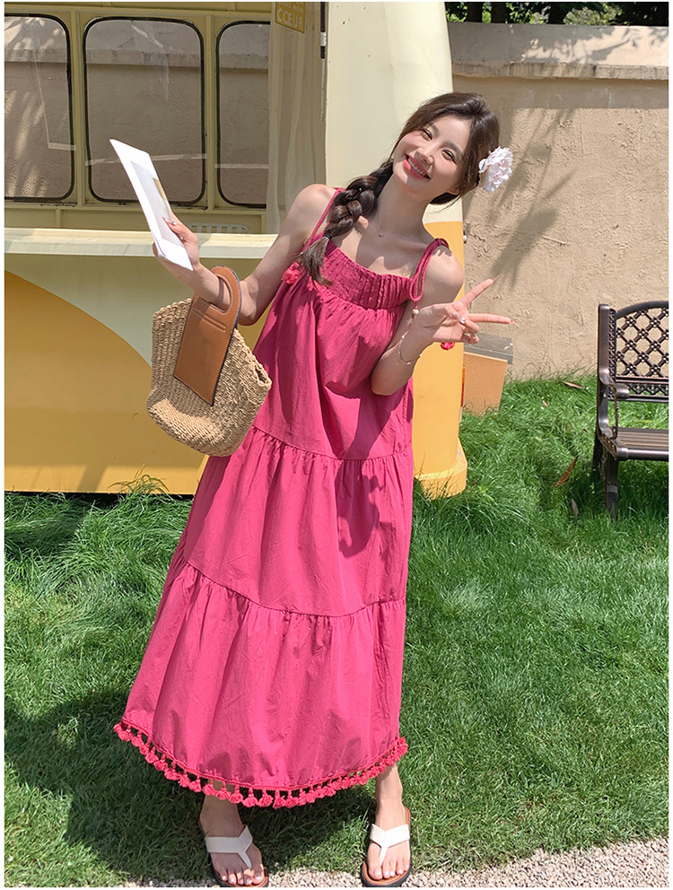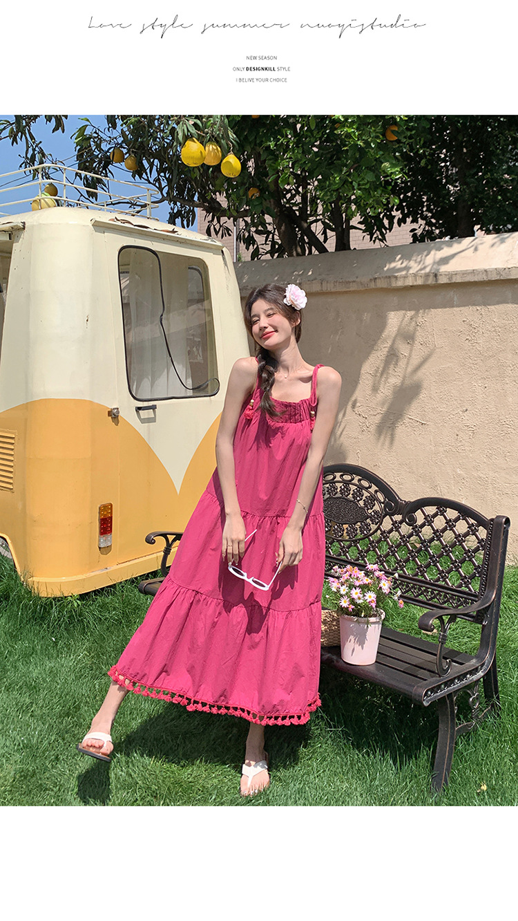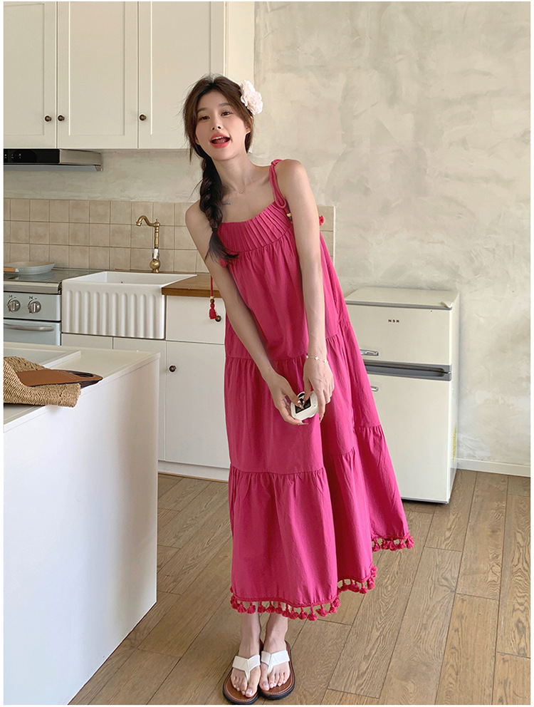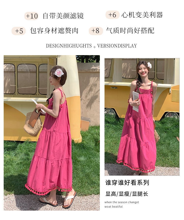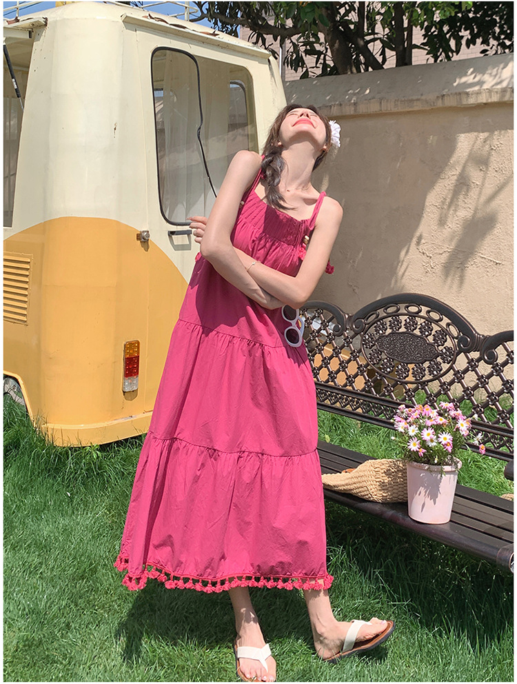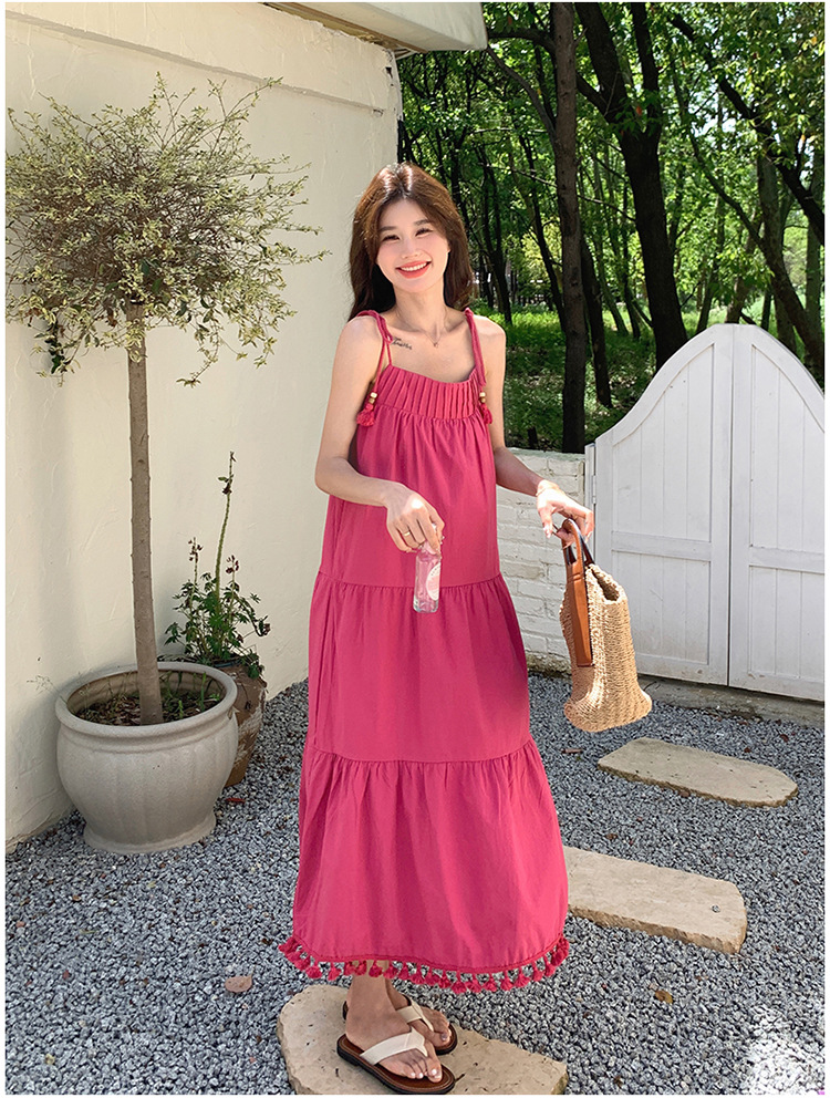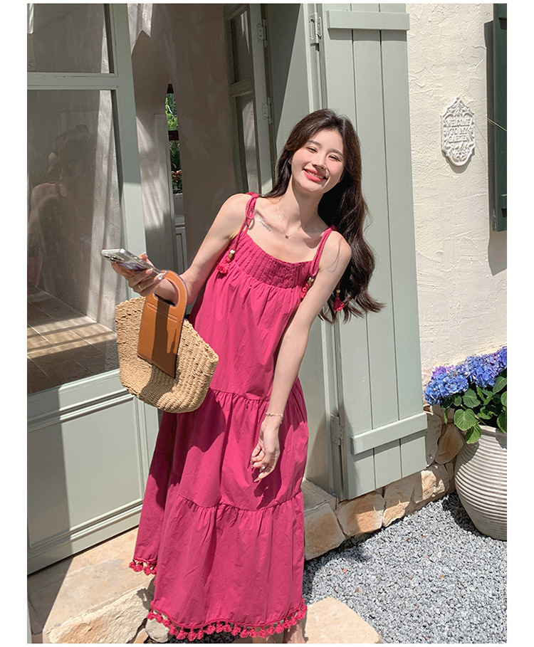 2024 여름 새로운 느슨한 슬리밍 캐주얼 긴 치마를 원피스 휴가 스타일 레드 스티칭 술 슬립 스커트