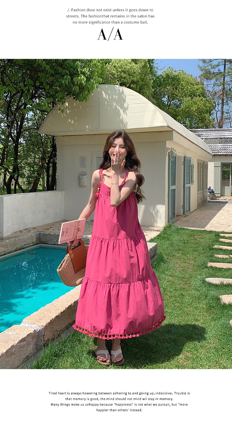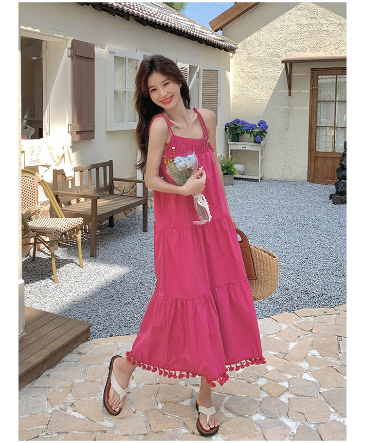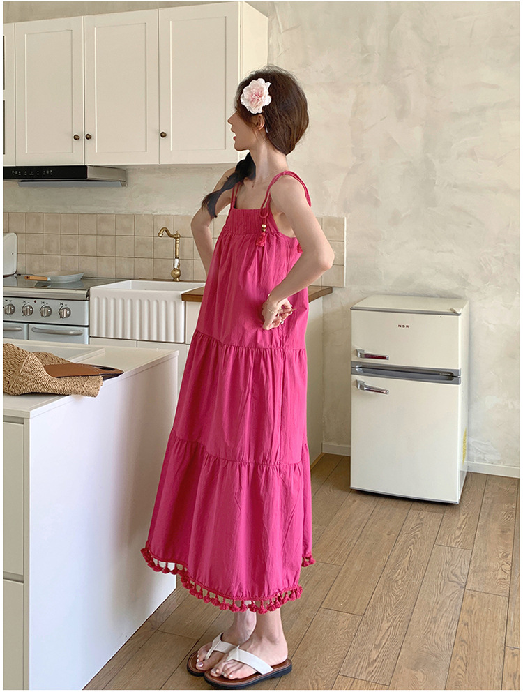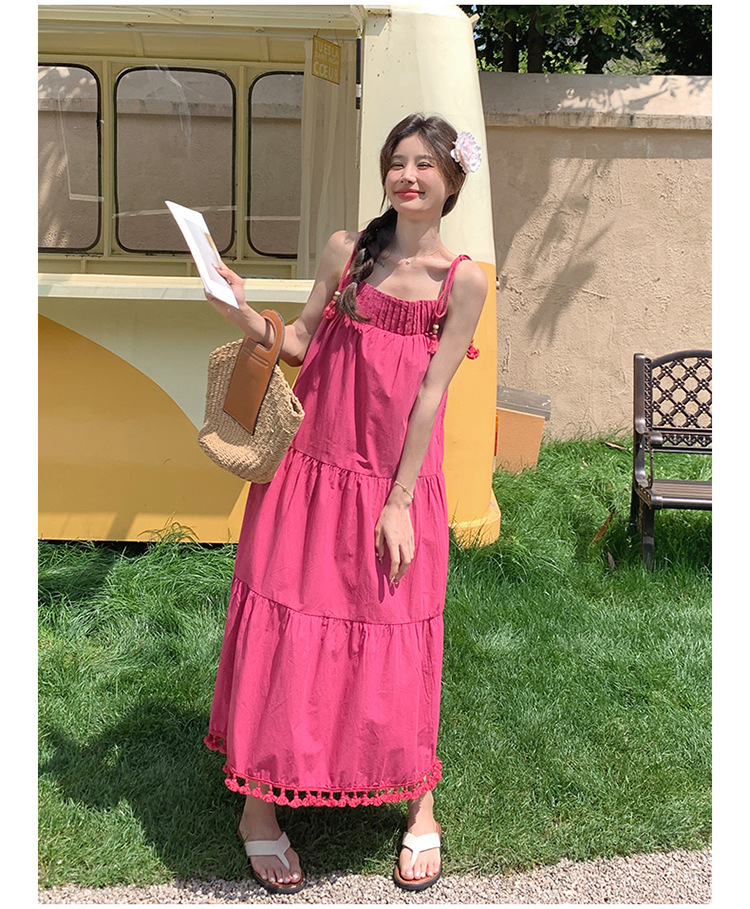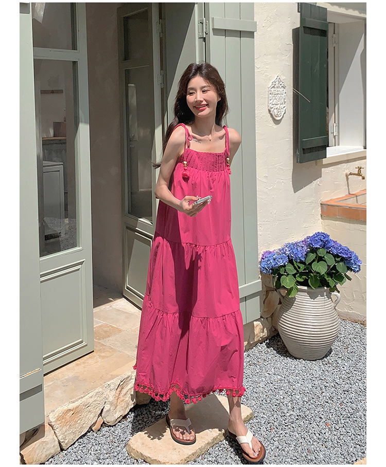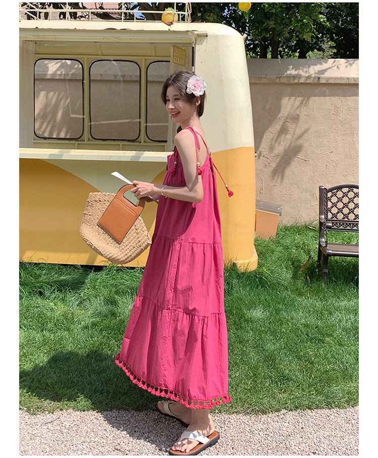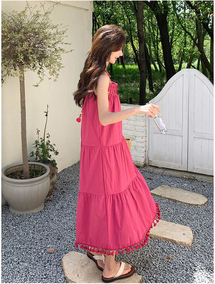 2024 여름 새로운 느슨한 슬리밍 캐주얼 긴 치마를 원피스 휴가 스타일 레드 스티칭 술 슬립 스커트