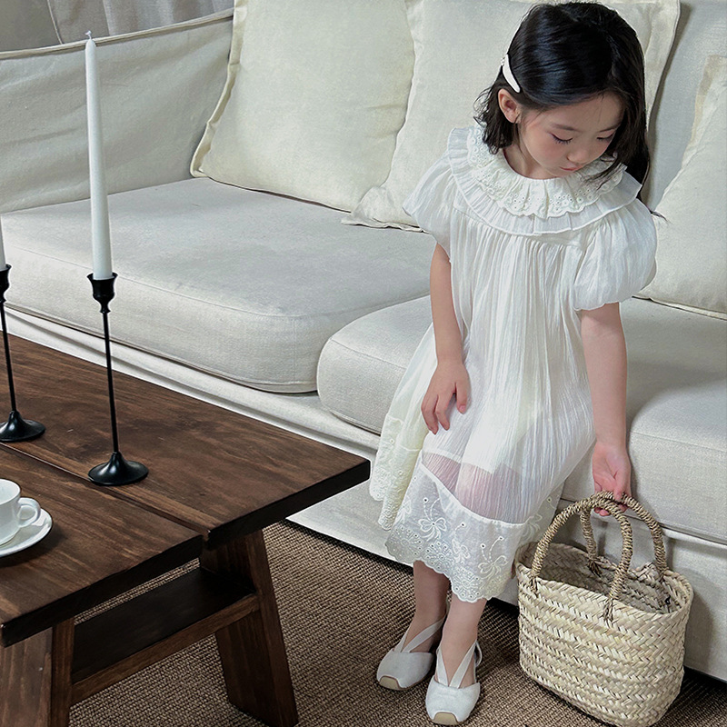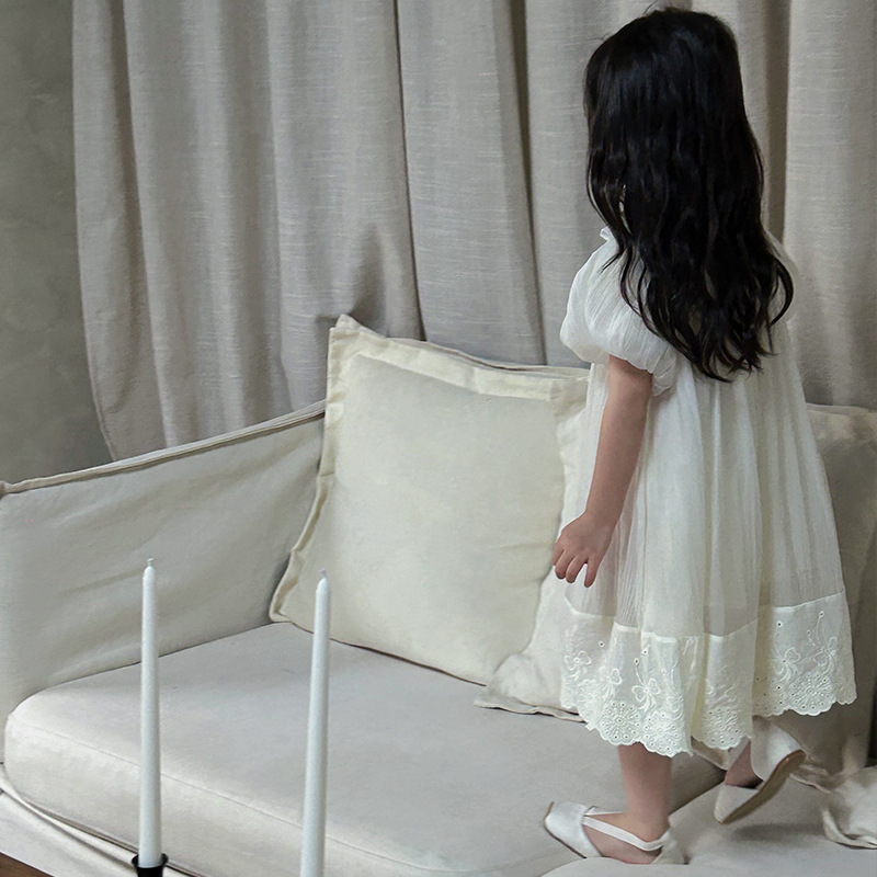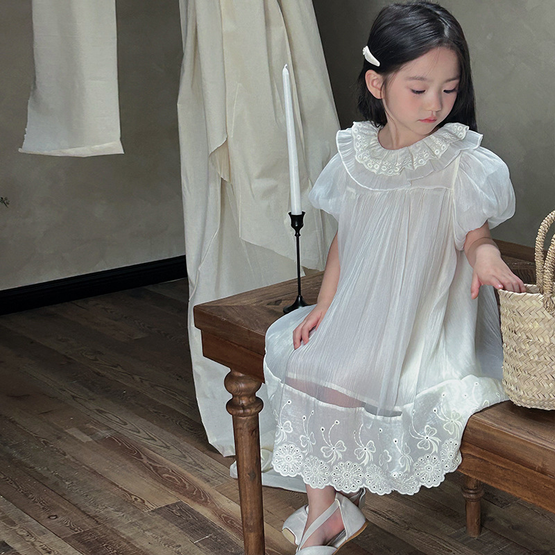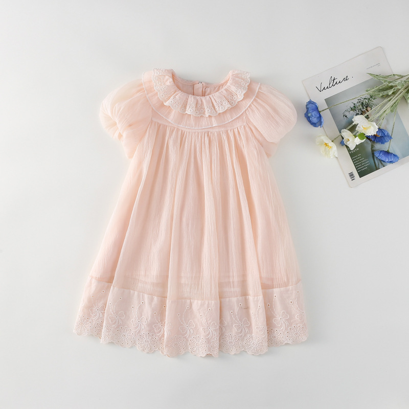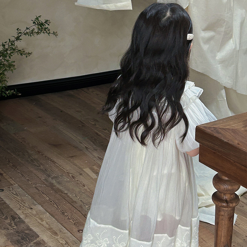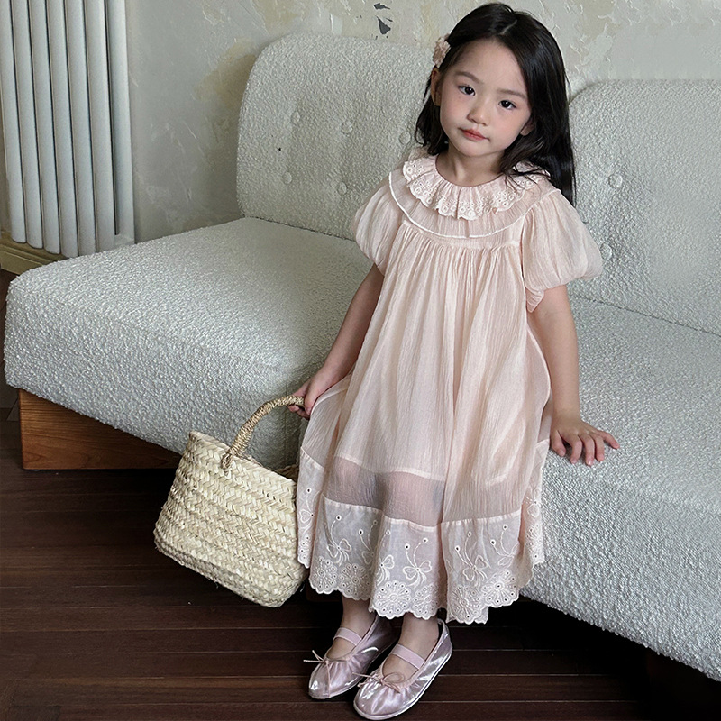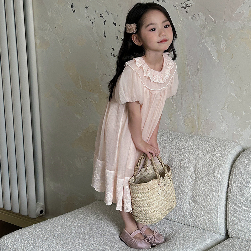 한국 스타일 소녀의 원피스 2024 여름 새로운 어린이 공주 원피스 아기의 레이스 메쉬 원피스 아동복스토어 가기