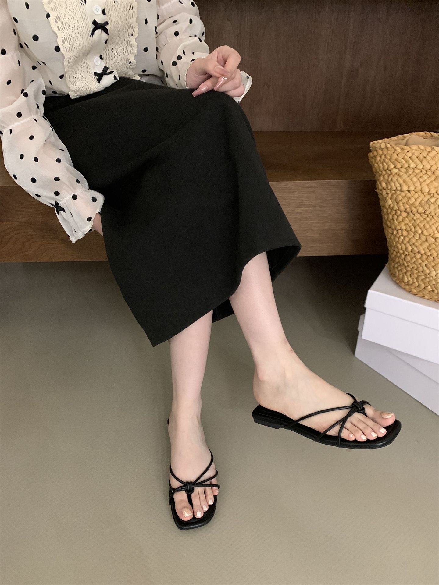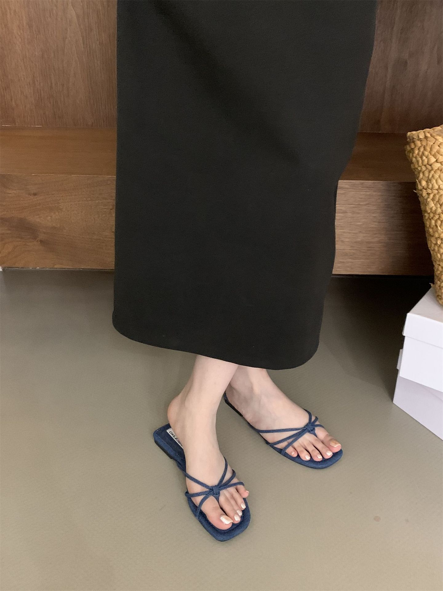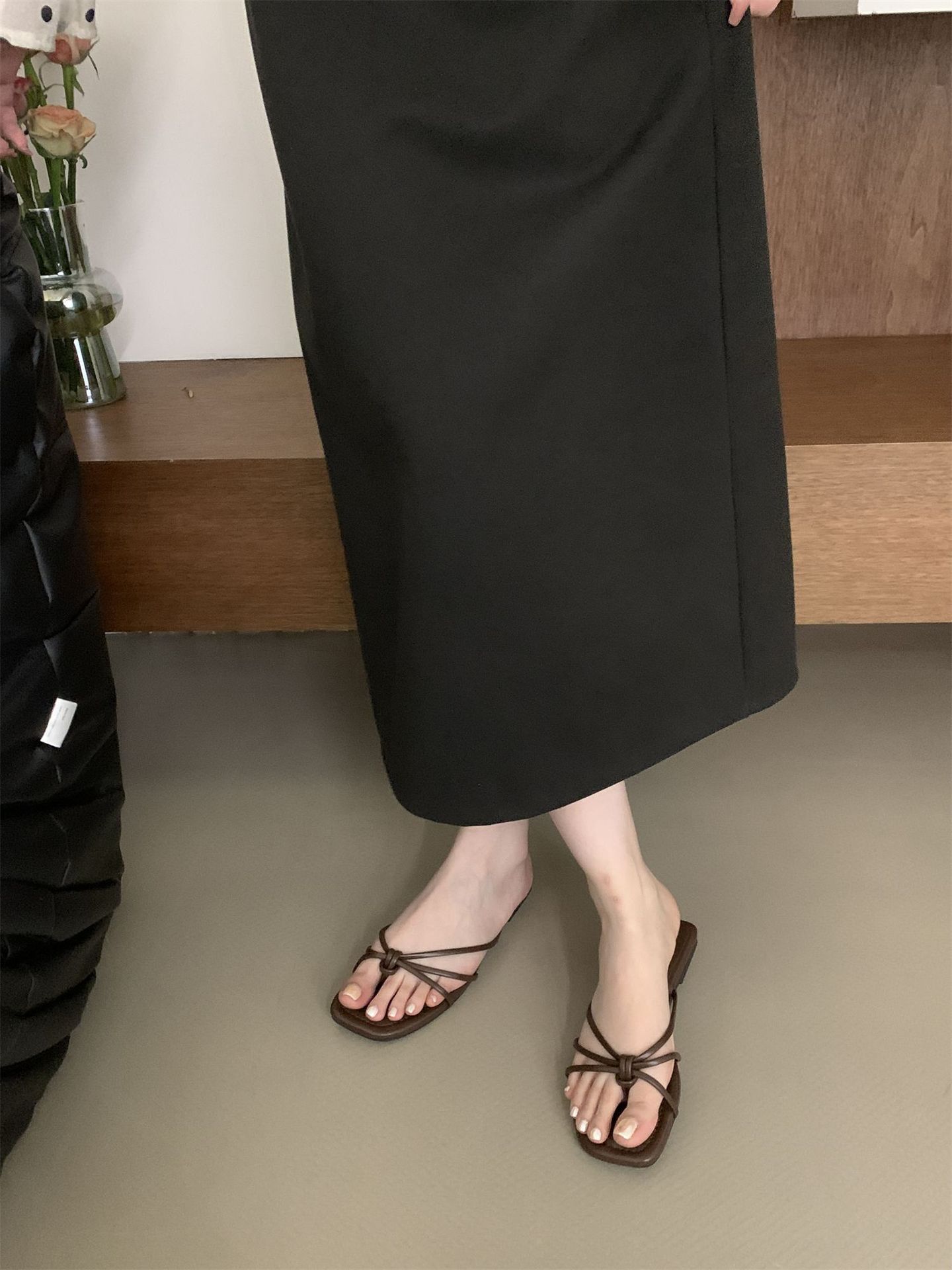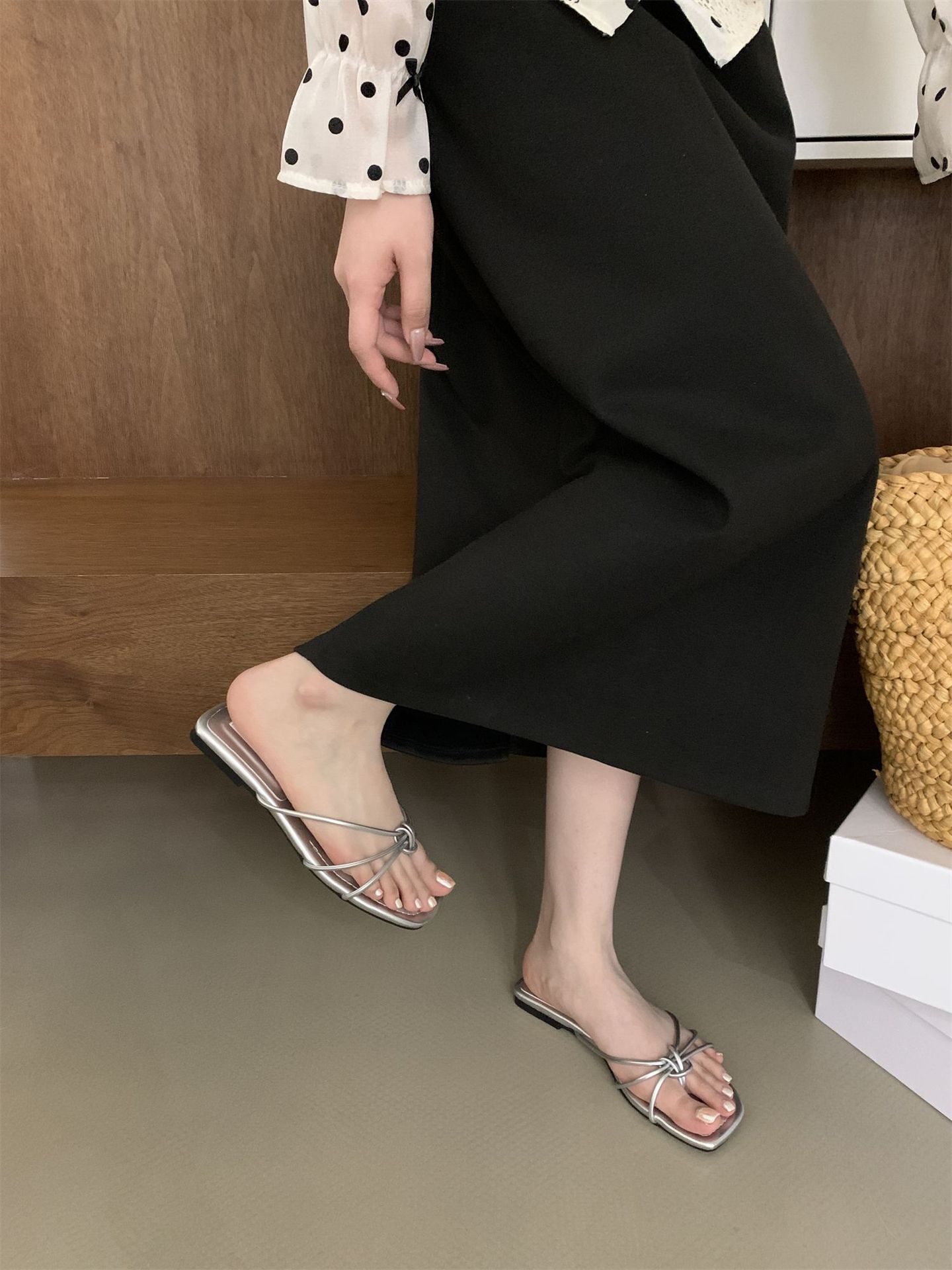 여성을위한 프랑스 스타일 레트로 플랫 슬리퍼 여름 외부 착용 2024 통 얇은 벨트 간단한 요정 소프트 하단 미끄럼 방지 플립 플롭 여성용