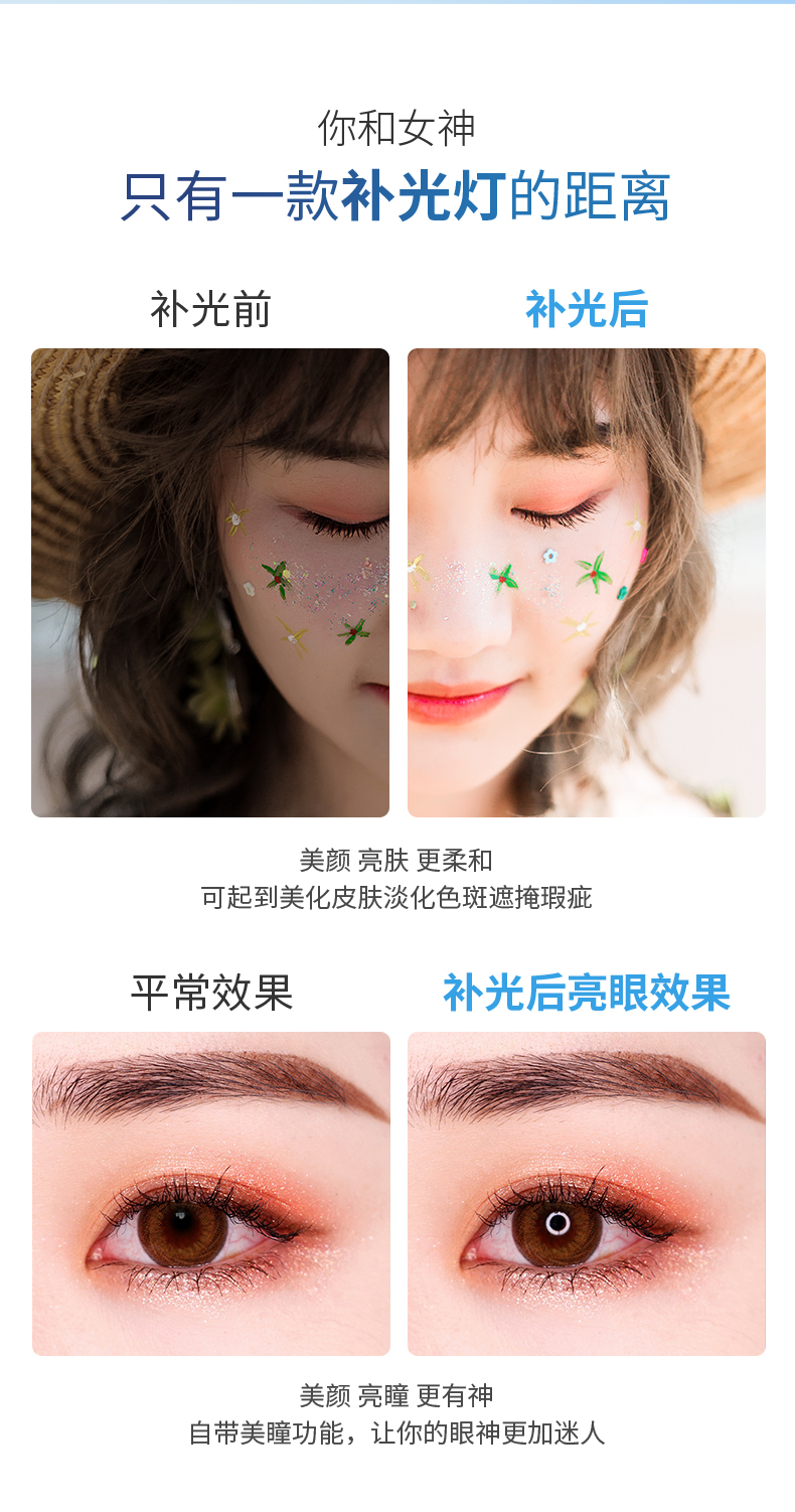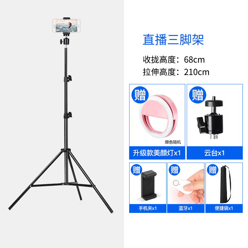 • 210CM 삼각대 + 업그레이드된 뷰티 램프 + 블루투스 셀카 + 팬/틸트 + 휴대폰 클립 + 편리함