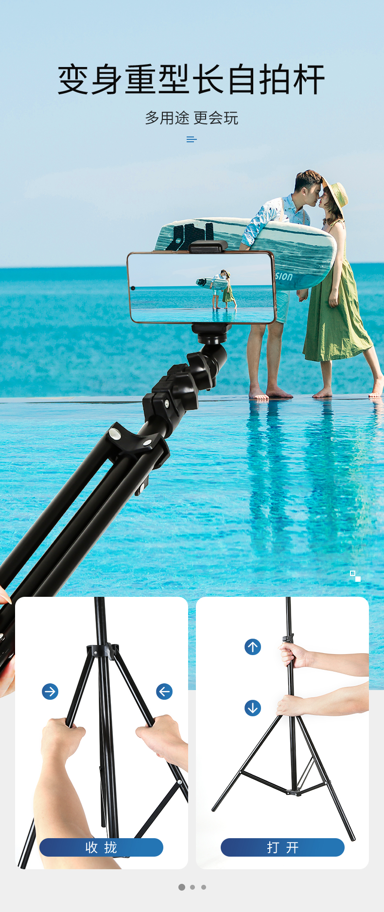 • [3개의 카메라 위치] 170CM 삼각대 + 블루투스 셀카 + 팬/틸트 + 휴대폰 클립 + 휴대용